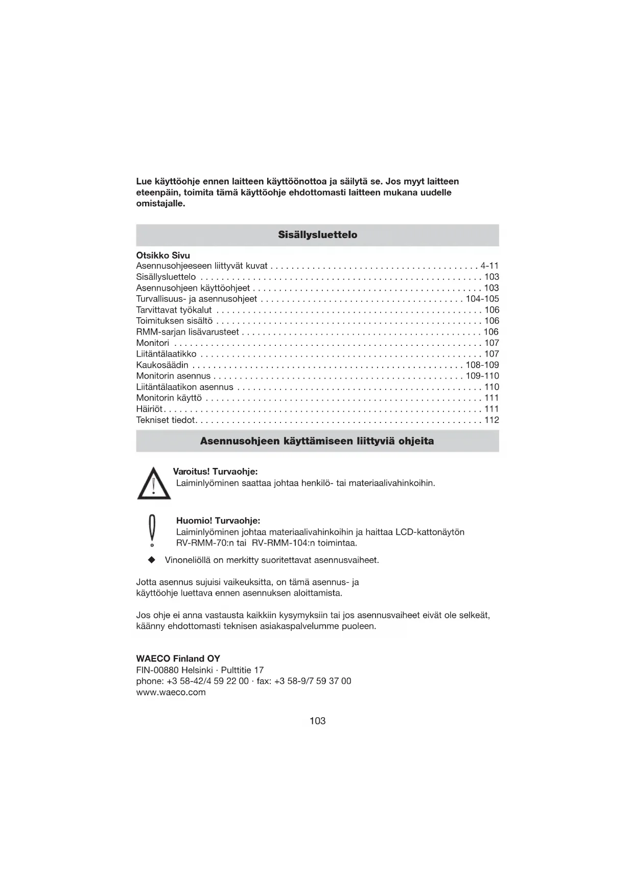 Monitorin asennus Yleisiä asennusohjeita! Ota huomioon seuraavat seikat ennen monitorin asentamista: – Sijoita monitori kokeeksi. – Asennuspaikan tulisi olla tasainen. – Tarkasta ennen lopullista asennusta, että myös asennuspaikan yläpuolelta löytyy levyjen ja muttereiden kiinnittämiseen tarvittava vapaa tila. – Ota monitorin paino huomioon. Tarvitaanko vahvistuksia (suurempiaaluslevyjä tai laattoja)? – Voidaanko liitoskaapelisarja ja jatkokaapeli vetää monitoriin? – Varmista monitoria sijoitettaessa, ettei monitoria asenneta TURVATYYNYN vaikutusalueelle. Muuten on turvatyynyn lauetessa olemassa loukkaantumisvaara. Älä asenna monitoria alueelle, jossa pää saattaa osua siihen.Monitorin asennus Suorita toimintatarkastus ennen asennusta. Jos ajoneuvoon on asennettu sisätilavalaistus sopivaan paikkaan, esim. kuljettajan ja kanssamatkustajan väliin, voidaan kattonäyttö asentaa tähän paikkaan. Tarkista, että liitäntäkaapeli on riittävän pitkä asennuspaikasta liitäntälaatikkoon. Huomio! Huolehdi siitä, että monitori voidaan kiinnittää hyvin asennuspaikkaan (katso H 1.4). Onko katon sisäverhous tarpeeksi vakaa? Voidaanko ruuveilla saa- vuttaa riittävä pysyvyys (katso H 1.5)? Kokeile, aukeaako monitori (katso H 1.5). Huomio! Tilavalon on oltava virraton monitorin asentamisen aikana oikosulkujen yms. välttämiseksi. Poista tilavalo (katso H 1.1). Asenna asennuslevy (katso H 1.2). Vedä liitäntäkaapeli monitorista tähän tarkoitettuun liitäntälaatikon asennuspaikkaan. Liitä alkuperäisen tilavalon syöttöjohto monitorin liitoksiin (napaisuutta ei tarvitse huomioida) (katso H 1.3). Työnnä liitäntäkaapeli pistokkeeseen (katso H 1.6). Noudata ehdottomasti turvallisuusohjeita. Liitäntälaatikon asennus Asennuspaikka on suojattava kosteudelta. Kompaktin rakenteen vuoksi asennusta suosi- tellaan kojelaudan alle. Laatikko voidaan kiinnittää mukana toimitetuilla levyruuveilla tai itseliimautuvalla tarranau- halla (ei sisälly toimitukseen). Noudata turvallisuus- ja asennusohjeita! Jännite on huollettava kytketyn jännitelähteen kautta, esim. Kl. 15 Järjestelmässä on myös irti kytketyssä tilassa (IR-vastaanotto aktiivinen) tietty tehonotto, joka voi pitkän ajan kuluessa purkaa ajoneuvon akkua. Liitäntälaatikossa on tulot kahteen (2) videolähteeseen (katso I 2). Tämä voi olla DVD-soitin (WAECO tuotteen nro. DVD-PL-10), kamera, jne. Liitä videolähteiden RCA-kaapelit pistokkeisiin VIDEO/AUDIO (katso I 2). Jos käytetään ainoastaan yhtä audiotuloa, kehittyy monoaudiosignaali. 110Monitorin käyttö Kun liitäntä on kokonaisuudessaan saatu päätökseen, kytkeytyy monitori syöttöjännitteen kytkemisen yhteydessä automaattisesti päälle (POWER DIRECT = ON) tai kytke laite päälle kaukosäätimestä (painike POWER) (katso F 1.1). Jos yksi videolähde on liitetty ja käynnissä, kuva ilmestyy monitoriin ja IR-kuulokelaite HS-10 (katso G 1) tai autoradio siirtää audiosignaalin (FM-MOD-10-laitteen ollessa käytössä). Videokanavan vaihtamiseksi, paina painiketta AV (katso F 1.7) kaukosäätimessä. Asetusten vaihtaminen on mahdollista monitorissa olevilla MODE- ja VOL-painikkeilla (katso D 1.5/1.6/1.7) tai kaukosäätimestä (katso F 1.5/1.4). Monitoria voidaan kääntää molemmin puolin ja taaksepäin n. 15° (katso G 1 ja 2). HS-10-kuulokkeiden käyttö Monitorit RV-RMM-70 ja -104 on varustettu IR-lähettimellä. Se mahdollistaa langattomien HS-10 IR-kuulokkeiden käytön (lisätietoja löytyy liitteestä). Oleskele käytön aikana monitorin edessä alueella, joka on n. 120° vaakasuorassa ja 60° pystysuorassa (katso G). Näin taataan häiriötön äänenvastaanotto. Häiriöt Kuvan epävakaisuus Jännitelähde on laskenut alle 12 volttiin. Lataa ajoneuvon akku. Huolehdi siitä, että jännitelähteestä liitäntälaatikkoon johtava liitäntäjohto on mahdollisimman lyhyt. Kuvaliikkeet Säädetty videoformaatti (COLOR SYSTEM) ei sovi videolähteeseen. Vaihda formaatti esim. NTSC:stä PAL:iin. 111Tekniset tiedot Mitat (l x k x s): 210 x 230 x 40 mm (RV-RMM-70) Mitat (l x k x s): 285 x 310 x 40 mm (RV-RMM-104) Käyttöjännite: 12 V DC, enintään 15 V Virranotto: enint. 16 wattia, sis. tilavalo (RV-RMM-70) 18 wattia, sis. tilavalo (RV-RMM-104) Kuvakoko: 7”, 17,7 cm diagonaali (RV-RMM-70) Kuvakoko: 10,4”, 26,4 cm diagonaali (RV-RMM-104) Kuvapisteet: 337 000 pikseliä (RV-RMM-70) Kuvapisteet: 480 000 pikseliä (RV-RMM-104) Videostandardi: NTSC/PAL Käyttölämpötila: 0 °C - +60 °C Paino: n. 1,5 kg (RV-RMM-70) Paino: n. 2,5 kg (RV-RMM-104) Oikeus teknistä kehitystä tukeviin muutoksiin pidätetään. Säilytä tämä ohje ja jos myyt laitteen eteenpäin, toimita se laitteen mukana uudelle ostajalle. Jos haluat saada lisätietoja RV-RMM-70- tai RV-RMM-104 -laitteesta, käänny seuraavan osoitteen puoleen: WAECO Finland OY FIN-00880 Helsinki · Pulttitie 17 phone: +3 58-42/4 59 22 00 · fax: +3 58-9/7 59 37 00 www.waeco.com 1121131141153.03.19.01221 5/2003 Ausführungen, dem technischen Fortschritt dienende Änderungen und Liefermöglichkeiten vorbehalten. Headquarters WAECO International GmbH · D-48282 Emsdetten Hollefeldstraße 63 · phone +49-25 72/8 79-0 · fax +49 -25 72/8 79-3 00 E-mail: info@waeco.de