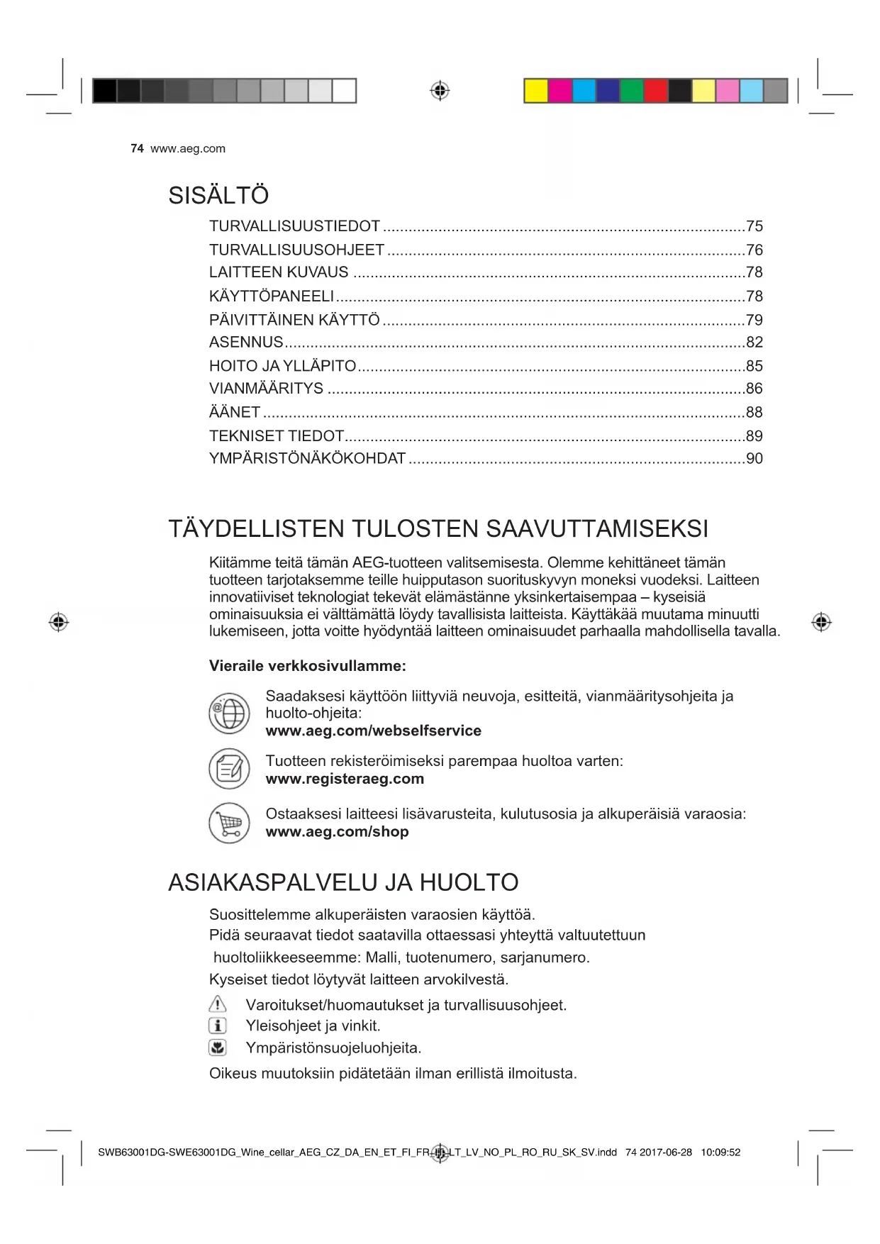 Saadaksesi käytöön liittyviä neuvoja, esitteita, vianmaäritysohjeita ja huolto-ohjeita: www.aeg.com/webselfservice