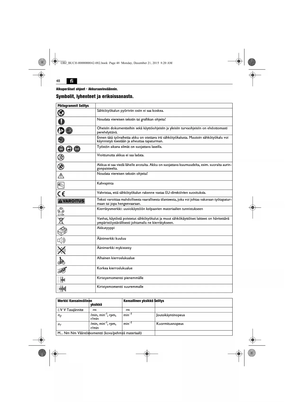 Alkuperäiset ohjeet - Akkuruuvinväännin. Symbolit, lyhenteet ja erikoissanasto. Piktogrammit Selitys Sähkötyökalun pyöriviin osiin ei saa koskea. Noudata viereisen tekstin tai grafiikan ohjeita! Oheisiin dokumentteihin sekä käyttöohjeisiin ja yleisiin turvaohjeisiin on ehdottomasti perehdyttävä. Ennen tätä työvaihetta akku on otettava irti sähkötyökalusta. Muutoin sähkötyökalu voi käynnistyä itsestään ja aiheuttaa tapaturman. Työstön aikana silmät on suojattava laseilla. Vioittunutta akkua ei saa ladata. Akkua ei saa viedä lähelle avotulta. Akku on suojattava kuumuudelta, esim. suoralta aurin- gonpaisteelta. Noudata viereisen tekstin ohjeita! Kahvapinta Vahvistaa, että sähkötyökalun rakenne vastaa EU-direktiivien suosituksia. Teksti varoittaa mahdollisesta vaarallisesta tilanteesta, joka voi johtaa vakavaan työtapatur- maan tai jopa hengenvaaraan. Kierrätysmerkki: uusiokäyttöön kelpaavien materiaalien tunnistukseen Vanhat, käytöstä poistetut sähkötyökalut ja muut sähkökäyttöiset laitteet on hävitettävä ympäristöystävällisesti johtamalla ne kierrätykseen. Akkutyyppi Äänimerkki kuuluu Äänimerkki mykistetty Alhainen kierroslukualue Korkea kierroslukualue Kiristysmomentti pienemmälle Kiristysmomentti suuremmalle Merkki Kansainvälinen yksikkö Kansallinen yksikkö Selitys U V V Tasajännite