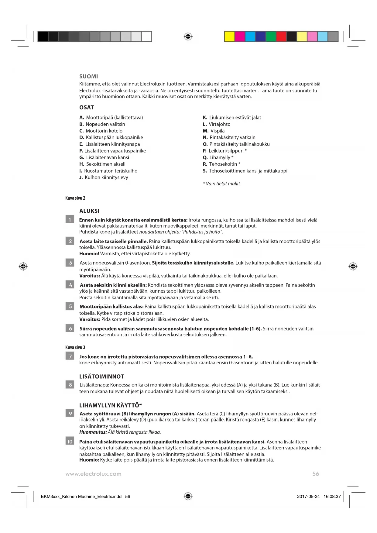 EKM3xxx_Kitchen Machine_Electrlx.indd 55 2017-05-24 16:08:3756 www.electrolux.com SUOMI Kiitämme, että olet valinnut Electroluxin tuotteen. Varmistaaksesi parhaan lopputuloksen käytä aina alkuperäisiä Electrolux -lisätarvikkeita ja -varaosia. Ne on erityisesti suunniteltu tuotettasi varten. Tämä tuote on suunniteltu ympäristö huomioon ottaen. Kaikki muoviset osat on merkitty kierrätystä varten. OSAT A. Moottoripää (kallistettava) B. Nopeuden valitsin C. Moottorin kotelo D. Kallistuspään lukkopainike E. Lisälaitteen kiinnitysnapa F. Lisälaitteen vapautuspainike G. Lisälaitenavan kansi H. Sekoittimen akseli
