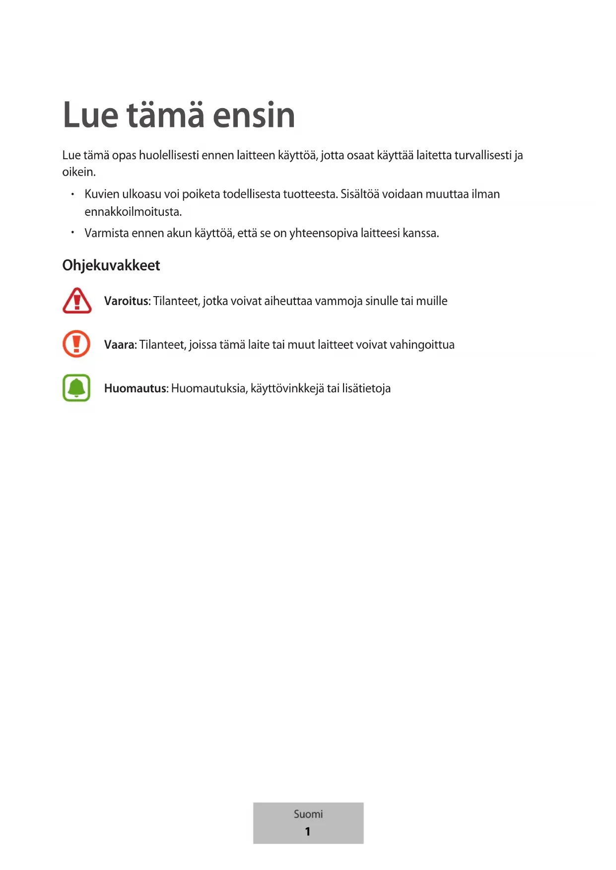 Varmista ennen akun käyttöä, että se on yhteensopiva laitteesi kanssa. Ohjekuvakkeet Varoitus: Tilanteet, jotka voivat aiheuttaa vammoja sinulle tai muille Vaara: Tilanteet, joissa tämä laite tai muut laitteet voivat vahingoittua Huomautus: Huomautuksia, käyttövinkkejä tai lisätietoja Suomi