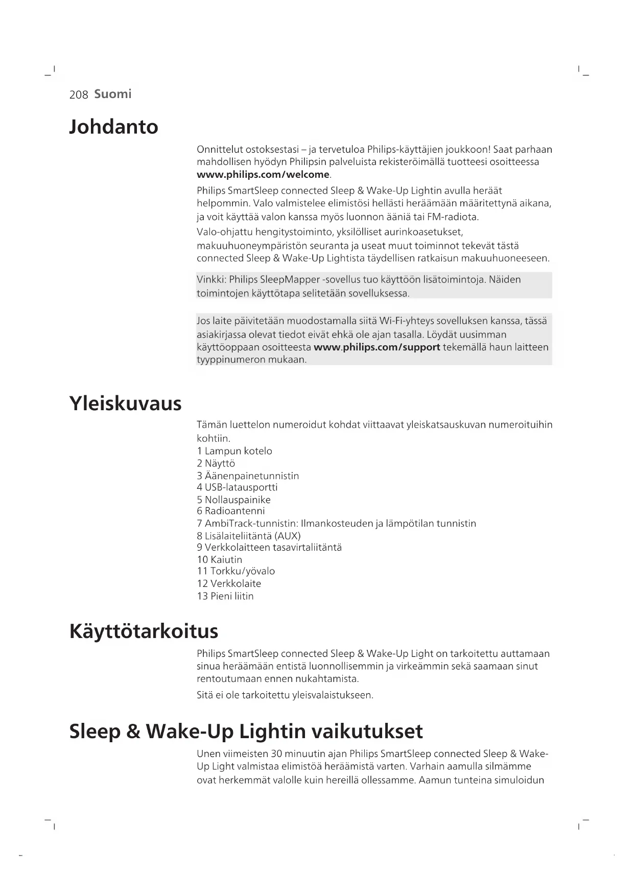Suomi Sisältö Johdanto ________________________________________________________________________________ 208 Yleiskuvaus _______________________________________________________________________________ 208 Käyttötarkoitus ___________________________________________________________________________ 208 Sleep & Wake-Up Lightin vaikutukset ________________________________________________________ 208 Tärkeitä turvallisuustietoja__________________________________________________________________ 209 Turvallisuus ja vaatimustenmukaisuus________________________________________________________ 210 Sähkömagneettiset kentät (EMF) ____________________________________________________________ 210 Vuorovaikutteisen valikon kuvakkeet ________________________________________________________ 211 Laitteen yhdistäminen Wi-Fi-verkkoon _______________________________________________________ 211 Valikon selaaminen________________________________________________________________________ 213 Herätysprofiilien määrittäminen_____________________________________________________________ 213 Ajan ja hälytysten varmuuskopiointi _________________________________________________________ 215 Torkkutoiminto ___________________________________________________________________________ 215 Herätyksen hylkääminen ___________________________________________________________________ 215 Laitteen käyttäminen lukulamppuna_________________________________________________________ 215 Yövalo ___________________________________________________________________________________ 216 Asetukset ________________________________________________________________________________ 216 Musiikin kuunteleminen____________________________________________________________________ 218 Rentoutusohjelmat ________________________________________________________________________ 218 Auringonlaskun simulointi__________________________________________________________________ 219 RelaxBreathe _____________________________________________________________________________ 219 Nukkumaanmenoaikatoiminto______________________________________________________________ 221 Matkapuhelimen lataaminen _______________________________________________________________ 221 Puhdistus ja säilytys________________________________________________________________________ 221 Kierrätys _________________________________________________________________________________ 221 Takuu ja tuki______________________________________________________________________________ 222 Vianmääritys______________________________________________________________________________ 222 Tekniset tiedot ____________________________________________________________________________ 225 Avoimen lähdekoodin ja kolmansien osapuolten ohjelmistot ___________________________________ 227208 Suomi Johdanto Onnittelut ostoksestasi – ja tervetuloa Philips-käyttäjien joukkoon! Saat parhaan mahdollisen hyödyn Philipsin palveluista rekisteröimällä tuotteesi osoitteessa www.philips.com/welcome. Philips SmartSleep connected Sleep & Wake-Up Lightin avulla heräät helpommin. Valo valmistelee elimistösi hellästi heräämään määritettynä aikana, ja voit käyttää valon kanssa myös luonnon ääniä tai FM-radiota. Valo-ohjattu hengitystoiminto, yksilölliset aurinkoasetukset, makuuhuoneympäristön seuranta ja useat muut toiminnot tekevät tästä connected Sleep & Wake-Up Lightista täydellisen ratkaisun makuuhuoneeseen. Vinkki: Philips SleepMapper ‑sovellus tuo käyttöön lisätoimintoja. Näiden toimintojen käyttötapa selitetään sovelluksessa. Jos laite päivitetään muodostamalla siitä Wi-Fi-yhteys sovelluksen kanssa, tässä asiakirjassa olevat tiedot eivät ehkä ole ajan tasalla. Löydät uusimman käyttöoppaan osoitteesta www.philips.com/support tekemällä haun laitteen tyyppinumeron mukaan. Yleiskuvaus Tämän luettelon numeroidut kohdat viittaavat yleiskatsauskuvan numeroituihin kohtiin. 1 Lampun kotelo 2 Näyttö 3 Äänenpainetunnistin 4 USB-latausportti 5 Nollauspainike 6 Radioantenni 7 AmbiTrack-tunnistin: Ilmankosteuden ja lämpötilan tunnistin 8 Lisälaiteliitäntä (AUX) 9 Verkkolaitteen tasavirtaliitäntä 10 Kaiutin 11 Torkku/yövalo 12 Verkkolaite 13 Pieni liitin Käyttötarkoitus Philips SmartSleep connected Sleep & Wake-Up Light on tarkoitettu auttamaan sinua heräämään entistä luonnollisemmin ja virkeämmin sekä saamaan sinut rentoutumaan ennen nukahtamista. Sitä ei ole tarkoitettu yleisvalaistukseen. Sleep & Wake-Up Lightin vaikutukset Unen viimeisten 30 minuutin ajan Philips SmartSleep connected Sleep & Wake- Up Light valmistaa elimistöä heräämistä varten. Varhain aamulla silmämme ovat herkemmät valolle kuin hereillä ollessamme. Aamun tunteina simuloidun209 Suomi auringonnousun suhteellisen hämärä valo valmistaa elimistöä heräämään virkeänä. Laitetta käyttävät henkilöt heräävät entistä helpommin, ovat aamuisin hyvällä tuulella ja tuntevat olonsa energiseksi. Koska ihmisten valoherkkyys on erilainen, voit säätää laitteen valotehon tasolle, joka sopii juuri sinun valoherkkyydellesi. Jotta voit kokea connected Sleep & Wake-Up Lightin vaikutukset täysin, aseta laite noin 40 – 50 cm:n etäisyydelle päästäsi yöpöydän tasaiselle pinnalle. Lisätietoja connected Sleep & Wake-Up Lightista on sivustossa www.philips.com. Tärkeitä turvallisuustietoja Lue nämä tärkeät tiedot huolellisesti ennen laitteen ensimmäistä käyttökertaa ja säilytä ne vastaisen varalle. Vaara