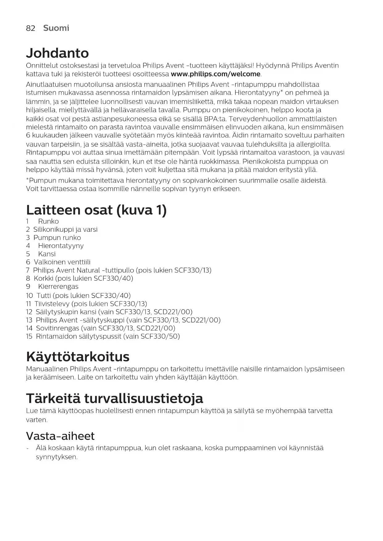 PortuguêsJohdanto Onnittelut ostoksestasi ja tervetuloa Philips Avent -tuotteen käyttäjäksi! Hyödynnä Philips Aventin kattava tuki ja rekisteröi tuotteesi osoitteessa www.philips.com/welcome. Ainutlaatuisen muotoilunsa ansiosta manuaalinen Philips Avent -rintapumppu mahdollistaa istumisen mukavassa asennossa rintamaidon lypsämisen aikana. Hierontatyyny* on pehmeä ja lämmin, ja se jäljittelee luonnollisesti vauvan imemisliikettä, mikä takaa nopean maidon virtauksen hiljaisella, miellyttävällä ja hellävaraisella tavalla. Pumppu on pienikokoinen, helppo koota ja kaikki osat voi pestä astianpesukoneessa eikä se sisällä BPA:ta. Terveydenhuollon ammattilaisten mielestä rintamaito on parasta ravintoa vauvalle ensimmäisen elinvuoden aikana, kun ensimmäisen 6 kuukauden jälkeen vauvalle syötetään myös kiinteää ravintoa. Äidin rintamaito soveltuu parhaiten vauvan tarpeisiin, ja se sisältää vasta-aineita, jotka suojaavat vauvaa tulehduksilta ja allergioilta. Rintapumppu voi auttaa sinua imettämään pitempään. Voit lypsää rintamaitoa varastoon, ja vauvasi saa nauttia sen eduista silloinkin, kun et itse ole häntä ruokkimassa. Pienikokoista pumppua on helppo käyttää missä hyvänsä, joten voit kuljettaa sitä mukana ja pitää maidon eritystä yllä. *Pumpun mukana toimitettava hierontatyyny on sopivankokoinen suurimmalle osalle äideistä. Voit tarvittaessa ostaa isommille nänneille sopivan tyynyn erikseen. Laitteen osat (kuva 1) 1 Runko 2 Silikonikuppi ja varsi 3 Pumpun runko 4 Hierontatyyny 5 Kansi 6 Valkoinen venttiili 7 Philips Avent Natural -tuttipullo (pois lukien SCF330/13) 8 Korkki (pois lukien SCF330/40) 9 Kierrerengas 10 Tutti (pois lukien SCF330/40) 11 Tiivistelevy (pois lukien SCF330/13) 12 Säilytyskupin kansi (vain SCF330/13, SCD221/00) 13 Philips Avent -säilytyskuppi (vain SCF330/13, SCD221/00) 14 Sovitinrengas (vain SCF330/13, SCD221/00) 15 Rintamaidon säilytyspussit (vain SCF330/50) Käyttötarkoitus Manuaalinen Philips Avent -rintapumppu on tarkoitettu imettäville naisille rintamaidon lypsämiseen ja keräämiseen. Laite on tarkoitettu vain yhden käyttäjän käyttöön. Tärkeitä turvallisuustietoja Lue tämä käyttöopas huolellisesti ennen rintapumpun käyttöä ja säilytä se myöhempää tarvetta varten. Vasta-aiheet - Älä koskaan käytä rintapumppua, kun olet raskaana, koska pumppaaminen voi käynnistää synnytyksen.