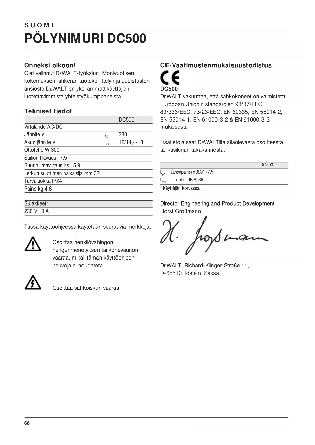 12/14,4/18 Ottoteho W 300 Säiliön tilavuus l 7,5 Suurin ilmavirtaus l/s 15,9 Letkun suuttimen halkaisija mm 32 Turvaluokka IPX4 Paino kg 4,6 Sulakkeet: 230 V 10 A Tässä käyttöohjeessa käytetään seuraavia merkkejä: Osoittaa henkilövahingon, hengenmenetyksen tai konevaurion vaaraa, mikäli tämän käyttöohjeen neuvoja ei noudateta. Osoittaa sähköiskun vaaraa. CE-Vaatimustenmukaisuustodistus DC500 DEWALT vakuuttaa, että sähkökoneet on valmistettu Euroopan Unionin standardien 98/37/EEC, 89/336/EEC, 73/23/EEC, EN 60335, EN 55014-2, EN 55014-1, EN 61000-3-2 & EN 61000-3-3 mukaisesti. Lisätietoja saat DEWALTilta allaolevasta osoitteesta tai käsikirjan takakannesta. DC500