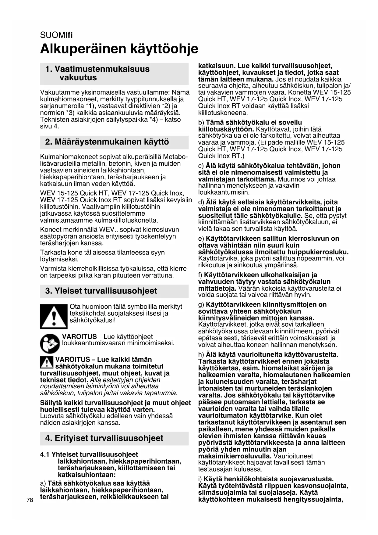 Alkuperäinen käyttöohje Vakuutamme yksinomaisella vastuullamme: Nämä kulmahiomakoneet, merkitty tyyppitunnuksella ja sarjanumerolla *1), vastaavat direktiivien *2) ja normien *3) kaikkia asiaankuuluvia määräyksiä. Teknisten asiakirjojen säilytyspaikka *4) – katso sivu 4. Kulmahiomakoneet sopivat alkuperäisillä Metabo- lisävarusteilla metallin, betonin, kiven ja muiden vastaavien aineiden laikkahiontaan, hiekkapaperihiontaan, teräsharjaukseen ja katkaisuun ilman veden käyttöä. WEV 15-125 Quick HT, WEV 17-125 Quick Inox, WEV 17-125 Quick Inox RT sopivat lisäksi kevyisiin kiillotustöihin. Vaativampiin kiillotustöihin jatkuvassa käytössä suosittelemme valmistamaamme kulmakiillotuskonetta. Koneet merkinnällä WEV.. sopivat kierrosluvun säätöpyörän ansiosta erityisesti työskentelyyn teräsharjojen kanssa. Tarkasta kone tällaisessa tilanteessa syyn löytämiseksi. Varmista kierreholkillisissa työkaluissa, että kierre on tarpeeksi pitkä karan pituuteen verrattuna. Ota huomioon tällä symbolilla merkityt tekstikohdat suojataksesi itsesi ja sähkötyökalusi! VAROITUS – Lue käyttöohjeet loukkaantumisvaaran minimoimiseksi. VAROITUS – Lue kaikki tämän sähkötyökalun mukana toimitetut turvallisuusohjeet, muut ohjeet, kuvat ja tekniset tiedot. Alla esitettyjen ohjeiden noudattamisen laiminlyönti voi aiheuttaa sähköiskun, tulipalon ja/tai vakavia tapaturmia. Säilytä kaikki turvallisuusohjeet ja muut ohjeet huolellisesti tulevaa käyttöä varten. Luovuta sähkötyökalu edelleen vain yhdessä näiden asiakirjojen kanssa.