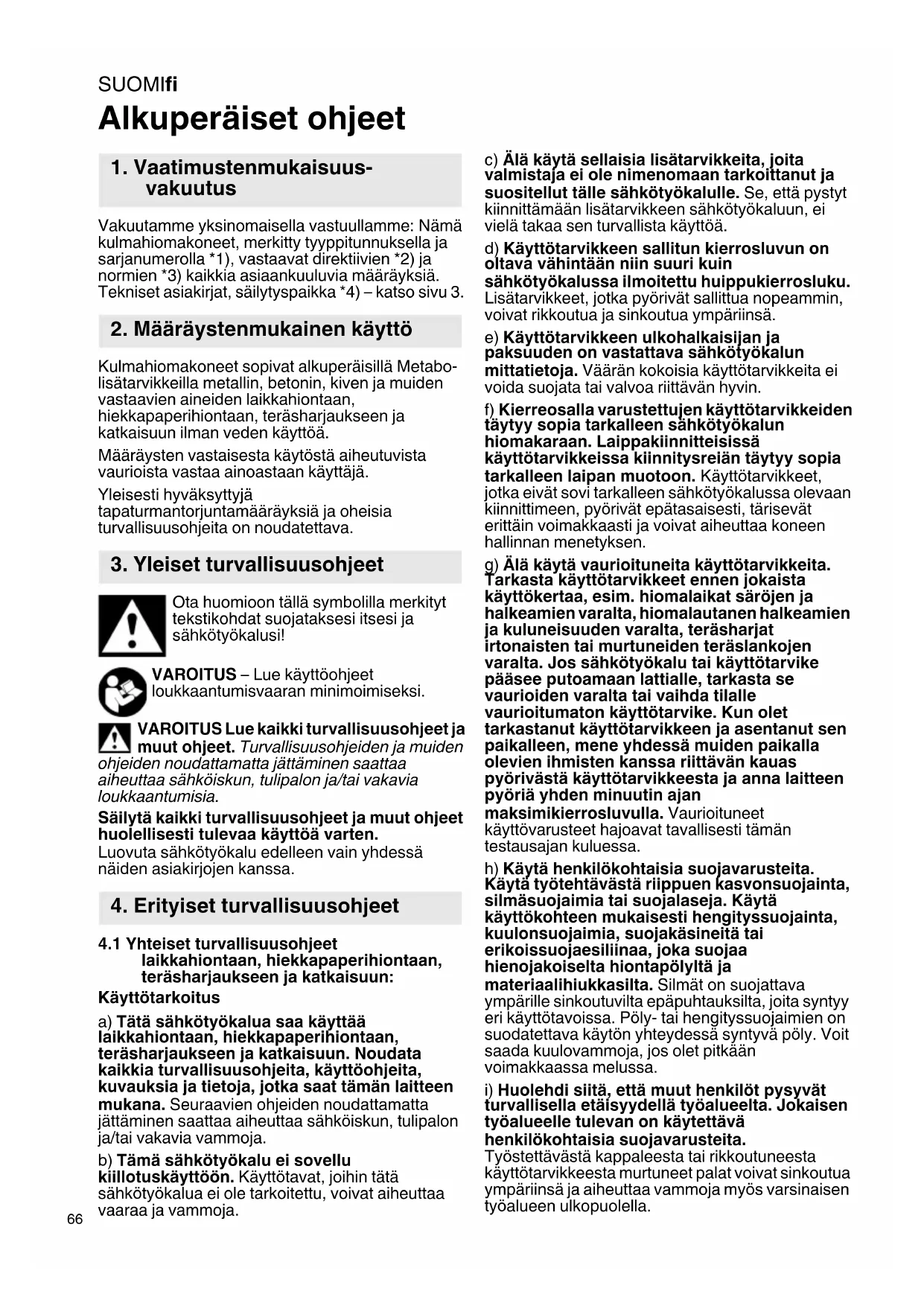 Alkuperäiset ohjeet Vakuutamme yksinomaisella vastuullamme: Nämä kulmahiomakoneet, merkitty tyyppitunnuksella ja sarjanumerolla *1), vastaavat direktiivien *2) ja normien *3) kaikkia asiaankuuluvia määräyksiä. Tekniset asiakirjat, säilytyspaikka *4) – katso sivu 3. Kulmahiomakoneet sopivat alkuperäisillä Metabo- lisätarvikkeilla metallin, betonin, kiven ja muiden vastaavien aineiden laikkahiontaan, hiekkapaperihiontaan, teräsharjaukseen ja katkaisuun ilman veden käyttöä. Määräysten vastaisesta käytöstä aiheutuvista vaurioista vastaa ainoastaan käyttäjä. Yleisesti hyväksyttyjä tapaturmantorjuntamääräyksiä ja oheisia turvallisuusohjeita on noudatettava. Ota huomioon tällä symbolilla merkityt tekstikohdat suojataksesi itsesi ja sähkötyökalusi! VAROITUS – Lue käyttöohjeet loukkaantumisvaaran minimoimiseksi. VAROITUS Lue kaikki turvallisuusohjeet ja muut ohjeet. Turvallisuusohjeiden ja muiden ohjeiden noudattamatta jättäminen saattaa aiheuttaa sähköiskun, tulipalon ja/tai vakavia loukkaantumisia. Säilytä kaikki turvallisuusohjeet ja muut ohjeet huolellisesti tulevaa käyttöä varten. Luovuta sähkötyökalu edelleen vain yhdessä näiden asiakirjojen kanssa.