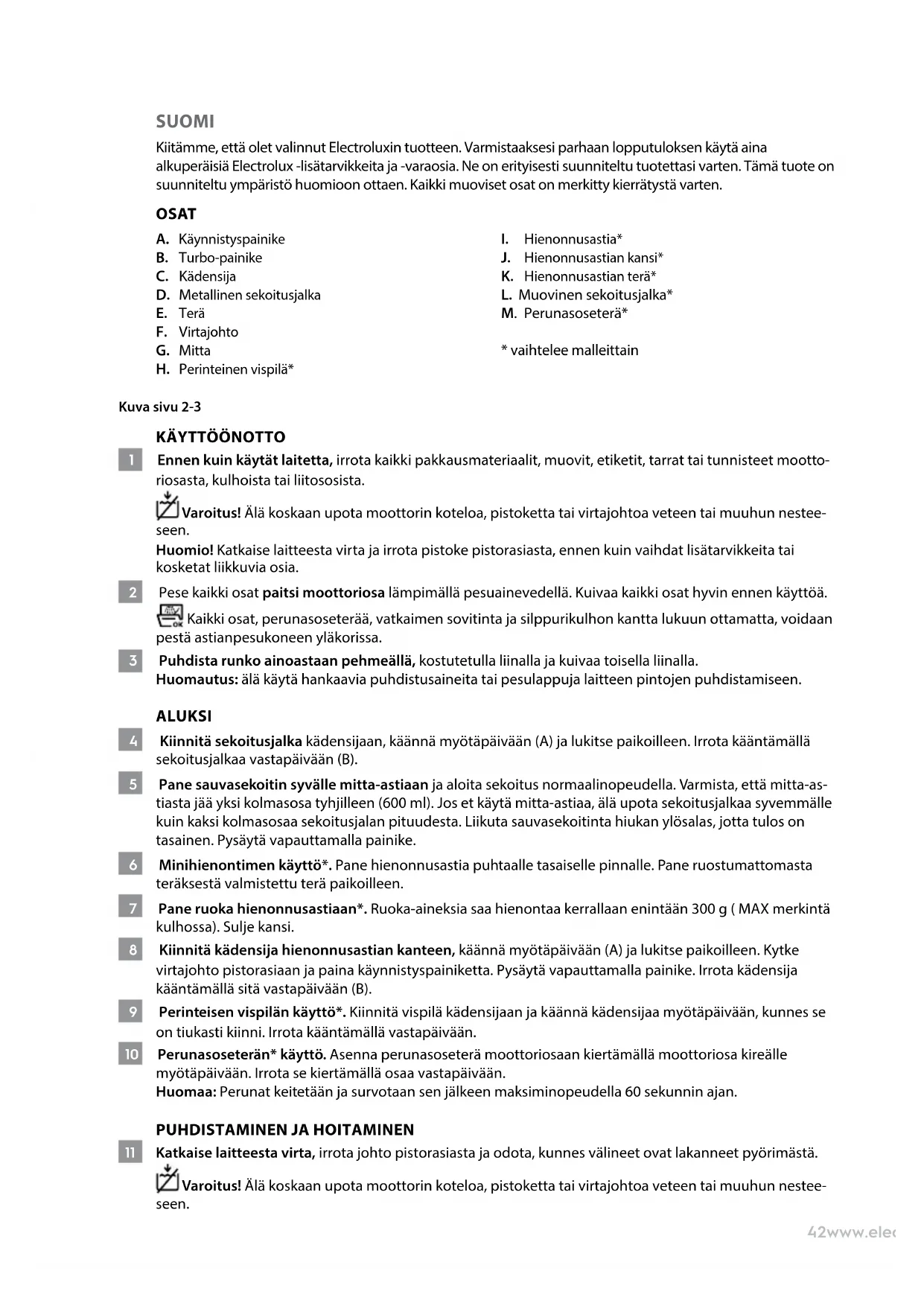 11 Katkaise laitteesta virta, irrota johto pistorasiasta ja odota, kunnes välineet ovat lakanneet pyörimästä. Varoitus! Älä koskaan upota moottorin koteloa, pistoketta tai virtajohtoa veteen tai muuhun nestee- seen.43www.electrolux.com