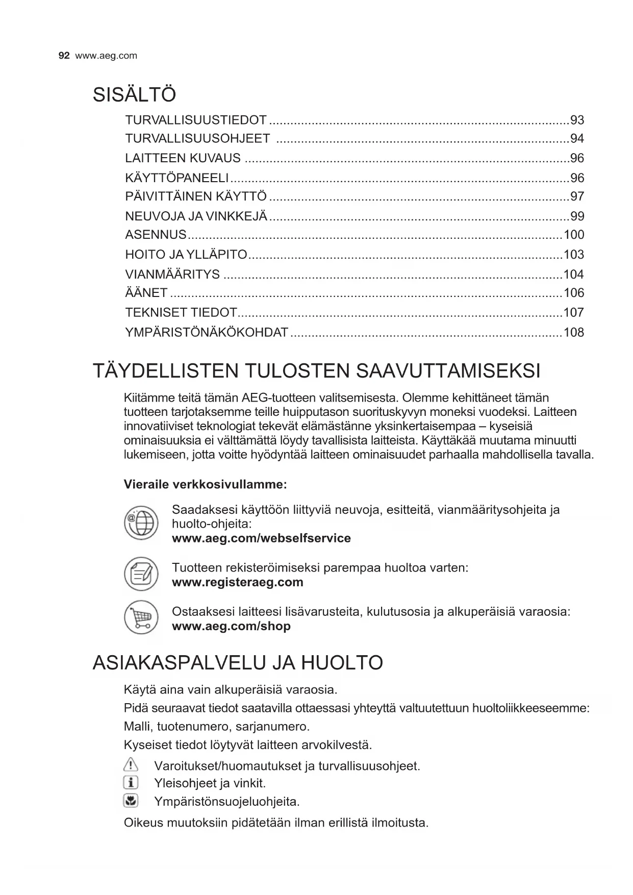Lainformacióntécnicaestásituadaenlaplacadedatos,enelexteriorointeriordel electrodomésticoyenlaetiquetaenergética. Dimensionesdelacavidad Altura mm 822-872 Anchura mm 600 Profundidad mm 550 Voltaje Voltios 230-240 Frecuencia Hz 5091ESPAÑOL Elsímbolo queguraeneste productooensuembalajeindicaque esteproductonodebedesecharsecon losresiduosdomésticos,sinoquedebe llevarsealpuntocorrespondientede recogidaparaelreciclajedeequipos eléctricosyelectrónicos. Aldesecharesteproducto correctamente,ustedcontribuiráa prevenirlasposiblesconsecuencias negativasparaelmedioambiente ylasaludquecausaríalamanipulación indebidadeesteproductodesechable. CUESTIONESMEDIOAMBIENTALES Sideseainformaciónmás detalladasobreelreciclajedeeste producto,póngaseencontacto conelayuntamiento,elserviciode tratamientodelosresiduosdomésticos oelestablecimientodondecompróeste producto. MATERIALDEEMBALAJE Elmaterialquelleveelsímbolo es reciclable.Desecheelmaterialenlos contenedores de recogida apropiados parasureciclaje.92 www.aeg.com SISÄLTÖ KiitämmeteitätämänAEG-tuotteenvalitsemisesta.Olemmekehittäneettämän tuotteentarjotaksemmeteillehuipputasonsuorituskyvynmoneksivuodeksi.Laitteen innovatiivisetteknologiattekevätelämästänneyksinkertaisempaa–kyseisiä ominaisuuksiaeivälttämättälöydytavallisistalaitteista.Käyttäkäämuutamaminuutti lukemiseen,jottavoittehyödyntäälaitteenominaisuudetparhaallamahdollisellatavalla. Vieraile verkkosivullamme: Saadaksesikäyttöönliittyviäneuvoja,esitteitä,vianmääritysohjeitaja huolto-ohjeita: www.aeg.com/webselfservice Tuotteenrekisteröimiseksiparempaahuoltoavarten: www.registeraeg.com Ostaaksesilaitteesilisävarusteita,kulutusosiajaalkuperäisiävaraosia: www.aeg.com/shop TÄYDELLISTENTULOSTENSAAVUTTAMISEKSI ASIAKASPALVELUJAHUOLTO Käytäainavainalkuperäisiävaraosia. Pidäseuraavattiedotsaatavillaottaessasiyhteyttävaltuutettuunhuoltoliikkeeseemme: Malli,tuotenumero,sarjanumero. Kyseisettiedotlöytyvätlaitteenarvokilvestä. Varoitukset/huomautuksetjaturvallisuusohjeet. Yleisohjeetjavinkit. Ympäristönsuojeluohjeita. Oikeusmuutoksiinpidätetäänilmanerillistäilmoitusta. TURVALLISUUSTIEDOT.....................................................................................93 TURVALLISUUSOHJEET...................................................................................94 LAITTEENKUVAUS............................................................................................96