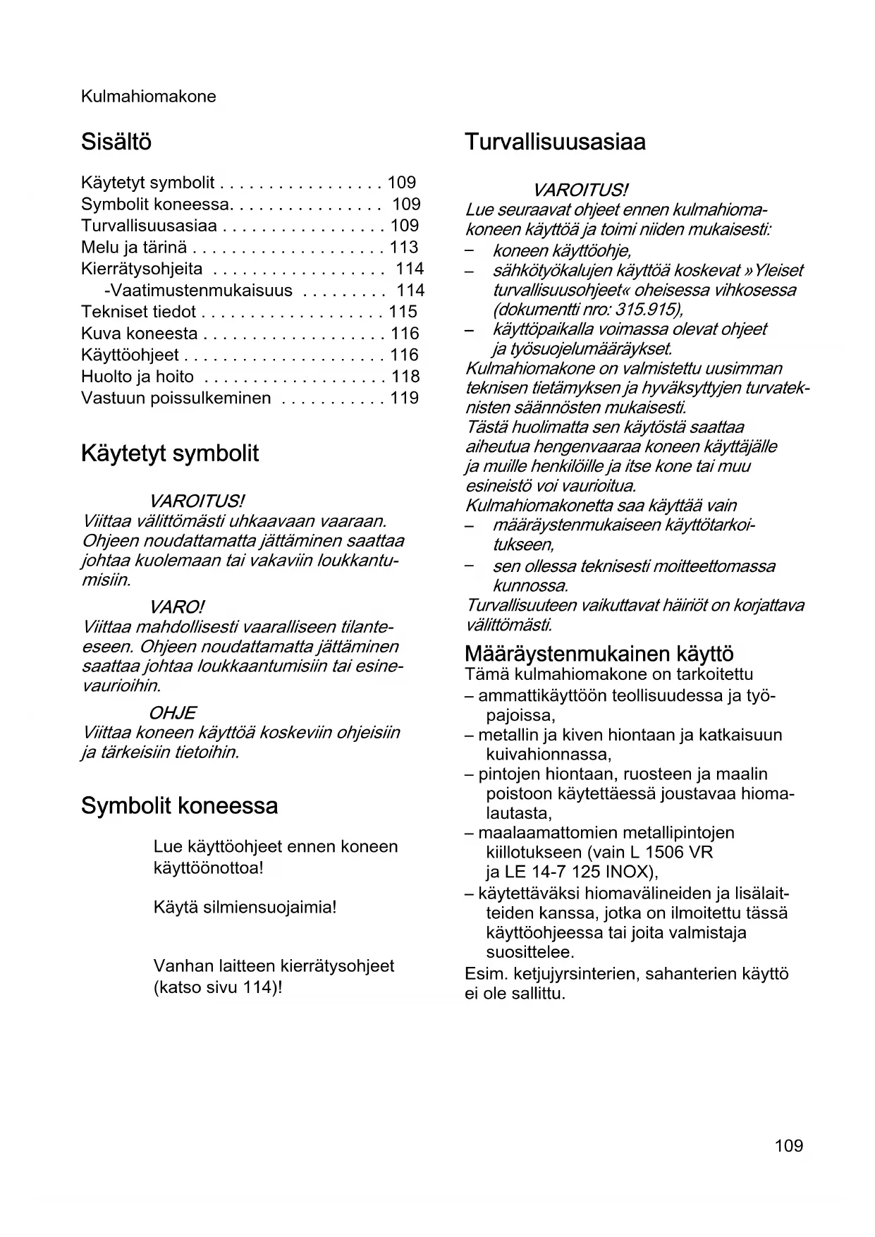 - Vastuun poissulkeminen Käytetyt symbolit VAROITUS! Viittaa välittömästi uhkaavaan vaaraan. Ohjeen noudattamatta jättäminen saattaa johtaa kuolemaan tai vakaviin loukkantu- misiin. VARO! Viittaa mahdollisesti vaaralliseen tilante- eseen. Ohjeen noudattamatta jättäminen saattaa johtaa loukkaantumisiin tai esine- vaurioihin. OHJE Viittaa koneen käyttöä koskeviin ohjeisiin ja tärkeisiin tietoihin. Symbolit koneessa Lue käyttöohjeet ennen koneen käyttöönottoa! Käytä silmiensuojaimia! Vanhan laitteen kierrätysohjeet (katso sivu 114)! Turvallisuusasiaa VAROITUS! Lue seuraavat ohjeet ennen kulmahioma- koneen käyttöä ja toimi niiden mukaisesti: p. 119