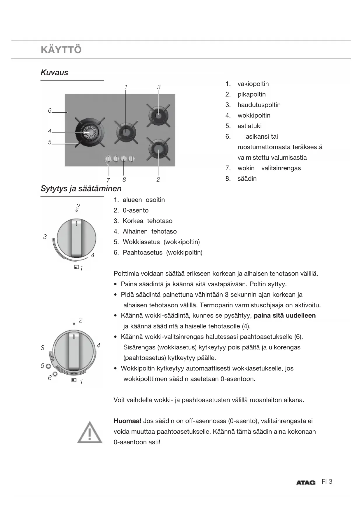 4FI 6 YLLÄPITO Ylläpito Säännöllinen käytön jälkeinen ylläpito estää kaatunutta ruokaa pinttymästä ja aiheuttamasta vaikeita tahroja. Käytä mietoa puhdistusainetta. Puhdista ensin säätimet, polttimet ja astiatuet ja vasta niiden jälkeen valumisastia tai lasikansi. Tämä estää valumisastiaa tai lasikantta likaantumista uudelleen puhdistuksen jälkeen. Huomaa! Älä puhdista polttimen osia astianpesukoneessa. Astianpesukoneen pesuaine saattaa syövyttää polttimen osia! Emalipinnan vaikeat tahrat (astiatuet, polttimien kannet) Vaikeat tahrat on parasta poistaa nestemäisellä puhdistusaineella tai muovisella pesusienellä. Älä koskaan käytä hankausjauheita, karhunkieliä, teräviä esineitä tai aggressiivisia puhdistusaineita. Lasikannen vaikeat tahrat Puhdista lasikansi keraamisille liesille suunnitellulla puhdistusaineella. Vesi- tai kalkkitahrat on helpoin puhdistaa etikalla. Vaikeat tahrat ruostumattomassa teräksessä (valumisastiat) Ruostumattomien teräspintojen vaikeat tahrat voi poistaa helpoiten ruostumattomien teräspintojen puhdistukseen tarkoitetuilla puhdistusaineilla. Pyyhi aina teräksen rakenteen suuntaisesti välttyäksesi suojakerroksen naarmuttamiselta (takuu ei korvaa tällä tavalla syntyneitä vaurioita!) Valumisastioiden ruostumattomat teräspinnat saattavat haalistua ajan myötä. Messinkiset wokkipolttimen osat Jotkin wokkipolttimen osat on valmistettu messingistä. Messingin värimuutokset ovat normaaleja wokin käytössä tarvittavien korkeiden lämpötilojen vuoksi. Lisää ylläpito- ja puhdistusohjeita löydät verkkosivustoltamme osoitteesta www.atagservice.nl.FI 7 VIRHEET Virheiden luettelo Jos kaasuliesi ei toimi oikein, se ei välttämättä tarkoita, että se on viallinen. Yritä ensin ratkaista ongelma itse tarkistamalla alla mainitut kohdat tai katsomalla lisätietoja verkkosivustolta www.atagservice.nl.