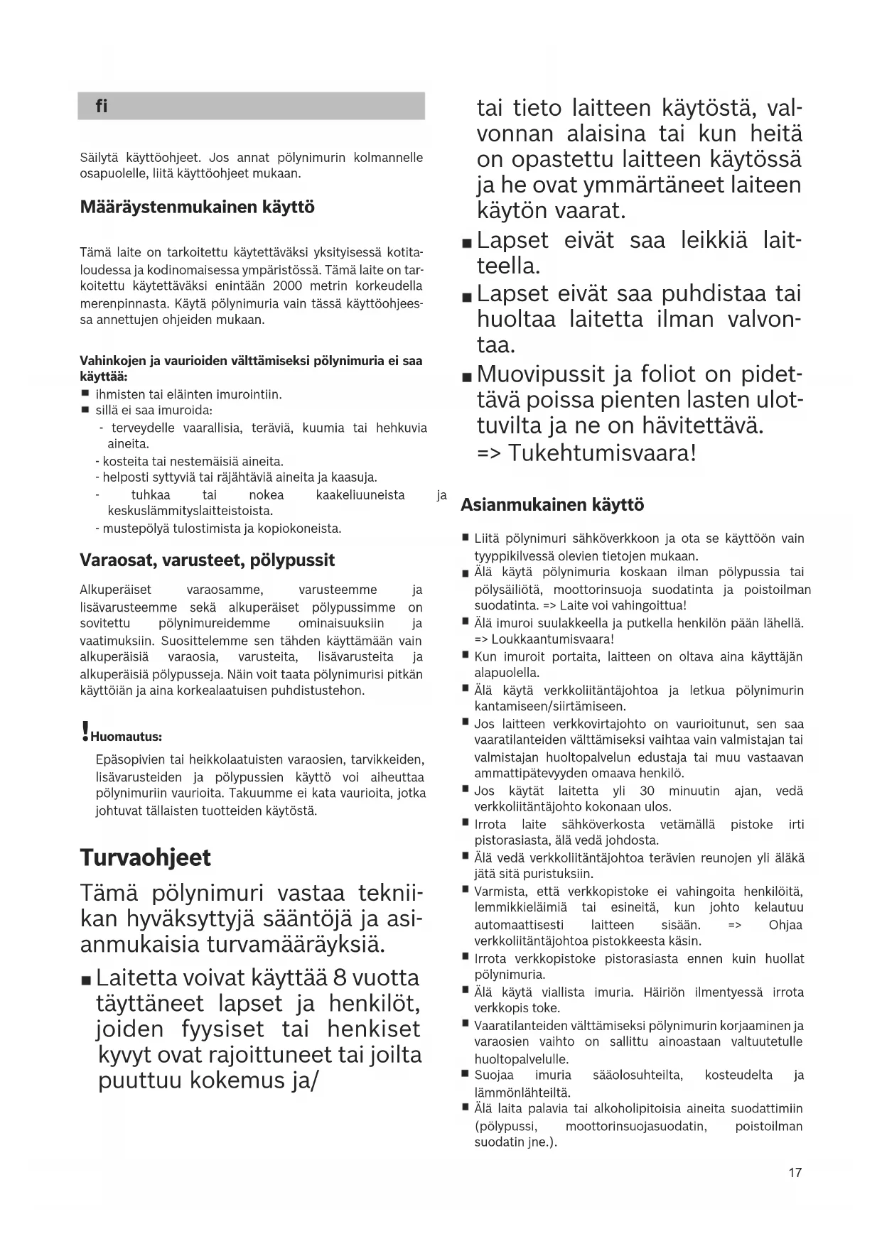 Säilytä käyttöohjeet. Jos annat pölynimurin kolmannelle osapuolelle, liitä käyttöohjeet mukaan. Määräystenmukainen käyttö Tämä laite on tarkoitettu käytettäväksi yksityisessä kotita- loudessa ja kodinomaisessa ympäristössä. Tämä laite on tar- koitettu käytettäväksi enintään 2000 metrin korkeudella merenpinnasta. Käytä pölynimuria vain tässä käyttöohjees- sa annettujen ohjeiden mukaan. Vahinkojen ja vaurioiden välttämiseksi pölynimuria ei saa käyttää: ihmisten tai eläinten imurointiin. sillä ei saa imuroida: - terveydelle vaarallisia, teräviä, kuumia tai hehkuvia aineita. - kosteita tai nestemäisiä aineita. - helposti syttyviä tai räjähtäviä aineita ja kaasuja. - tuhkaa tai nokea kaakeliuuneista ja keskuslämmityslaitteistoista. - mustepölyä tulostimista ja kopiokoneista. Varaosat, varusteet, pölypussit Alkuperäiset varaosamme, varusteemme ja lisävarusteemme sekä alkuperäiset pölypussimme on sovitettu pölynimureidemme ominaisuuksiin ja vaatimuksiin. Suosittelemme sen tähden käyttämään vain alkuperäisiä varaosia, varusteita, lisävarusteita ja alkuperäisiä pölypusseja. Näin voit taata pölynimurisi pitkän käyttöiän ja aina korkealaatuisen puhdistustehon. !Huomautus: Epäsopivien tai heikkolaatuisten varaosien, tarvikkeiden, lisävarusteiden ja pölypussien käyttö voi aiheuttaa pölynimuriin vaurioita. Takuumme ei kata vaurioita, jotka johtuvat tällaisten tuotteiden käytöstä. Turvaohjeet Tämä pölynimuri vastaa teknii- kan hyväksyttyjä sääntöjä ja asi- anmukaisia turvamääräyksiä. Laitetta voivat käyttää 8 vuotta täyttäneet lapset ja henkilöt, joiden fyysiset tai henkiset kyvyt ovat rajoittuneet tai joilta puuttuu kokemus ja/ tai tieto laitteen käytöstä, val- vonnan alaisina tai kun heitä on opastettu laitteen käytössä ja he ovat ymmärtäneet laiteen käytön vaarat. Lapset eivät saa leikkiä lait- teella. Lapset eivät saa puhdistaa tai huoltaa laitetta ilman valvon- taa. Muovipussit ja foliot on pidet- tävä poissa pienten lasten ulot- tuvilta ja ne on hävitettävä. => Tukehtumisvaara! Asianmukainen käyttö Liitä pölynimuri sähköverkkoon ja ota se käyttöön vain tyyppikilvessä olevien tietojen mukaan. Älä käytä pölynimuria koskaan ilman pölypussia tai pölysäiliötä, moottorinsuoja suodatinta ja poistoilman suodatinta. => Laite voi vahingoittua! Älä imuroi suulakkeella ja putkella henkilön pään lähellä. => Loukkaantumisvaara! Kun imuroit portaita, laitteen on oltava aina käyttäjän alapuolella. Älä käytä verkkoliitäntäjohtoa ja letkua pölynimurin kantamiseen/siirtämiseen. Jos laitteen verkkovirtajohto on vaurioitunut, sen saa vaaratilanteiden välttämiseksi vaihtaa vain valmistajan tai valmistajan huoltopalvelun edustaja tai muu vastaavan ammattipätevyyden omaava henkilö. Jos käytät laitetta yli 30 minuutin ajan, vedä verkkoliitäntäjohto kokonaan ulos. Irrota laite sähköverkosta vetämällä pistoke irti pistorasiasta, älä vedä johdosta. Älä vedä verkkoliitäntäjohtoa terävien reunojen yli äläkä jätä sitä puristuksiin. Varmista, että verkkopistoke ei vahingoita henkilöitä, lemmikkieläimiä tai esineitä, kun johto kelautuu automaattisesti laitteen sisään. => Ohjaa verkkoliitäntäjohtoa pistokkeesta käsin. Irrota verkkopistoke pistorasiasta ennen kuin huollat pölynimuria. Älä käytä viallista imuria. Häiriön ilmentyessä irrota verkkopis toke. Vaaratilanteiden välttämiseksi pölynimurin korjaaminen ja varaosien vaihto on sallittu ainoastaan valtuutetulle huoltopalvelulle. Suojaa imuria sääolosuhteilta, kosteudelta ja lämmönlähteiltä. Älä laita palavia tai alkoholipitoisia aineita suodattimiin (pölypussi, moottorinsuojasuodatin, poistoilman suodatin jne.).18 Pölynimuri ei sovellu rakennustyömaakäyttöön. => Rakennusjätteiden imurointi voi vaurioittaa laitetta. Kytke laite pois päältä ja irrota verkkopistoke, kun et imuroi. Käytöstä poistetut laitteet tulee tehdä heti käyttökelvottomiksi ja hävittää määräysten mukaisesti.