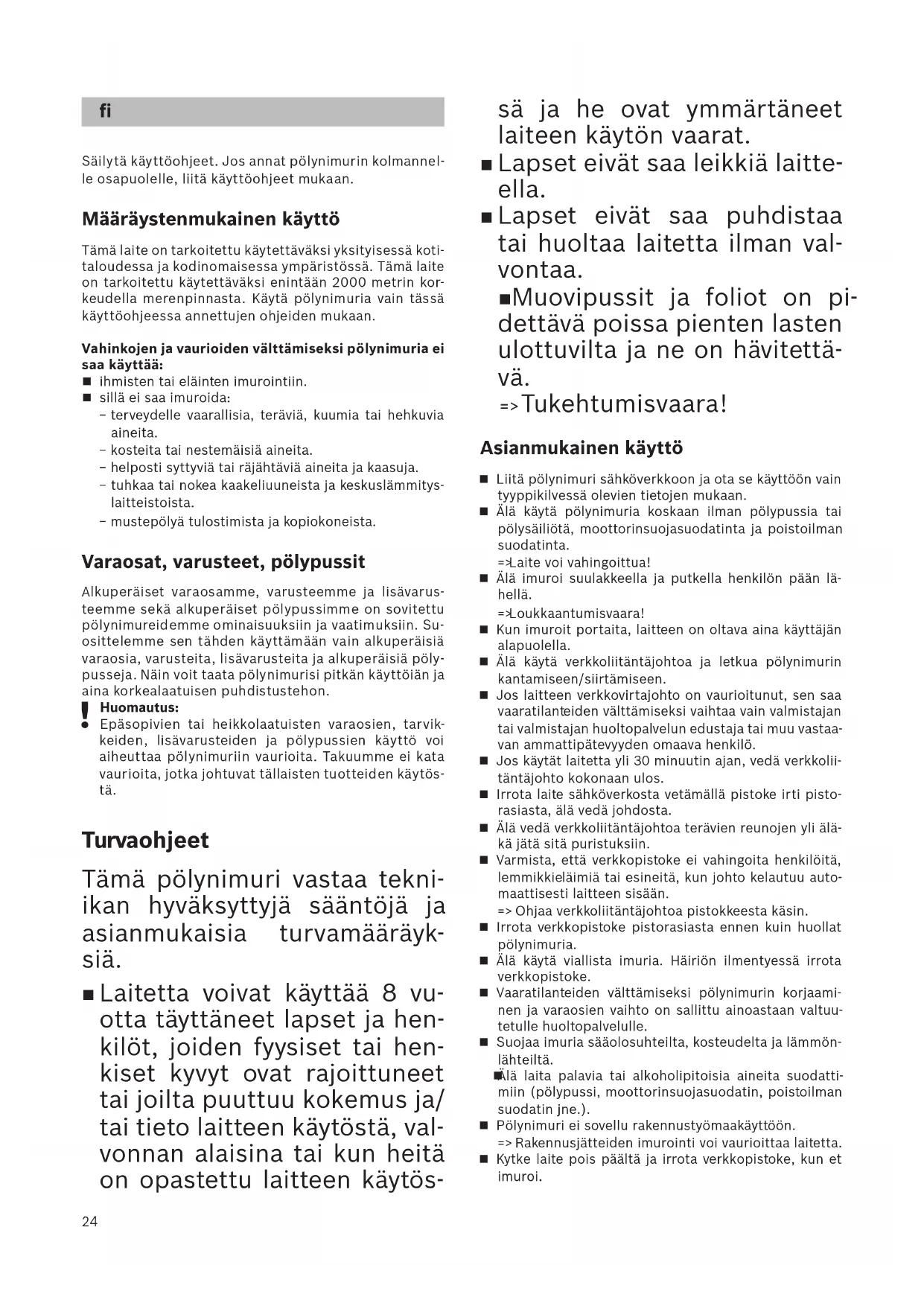 Huomautus: Epäsopivien tai heikkolaatuisten varaosien, tarvik- keiden, lisävarusteiden ja pölypussien käyttö voi aiheuttaa pölynimuriin vaurioita. Takuumme ei kata vaurioita, jotka johtuvat tällaisten tuotteiden käytös- tä. Turvaohjeet Tämä pölynimuri vastaa tekni- ikan hyväksyttyjä sääntöjä ja asianmukaisia turvamääräyk- siä. Laitetta voivat käyttää 8 vu- otta täyttäneet lapset ja hen- kilöt, joiden fyysiset tai hen- kiset kyvyt ovat rajoittuneet tai joilta puuttuu kokemus ja/ tai tieto laitteen käytöstä, val- vonnan alaisina tai kun heitä on opastettu laitteen käytös- sä ja he ovat ymmärtäneet laiteen käytön vaarat. Lapset eivät saa leikkiä laitte- ella. Lapset eivät saa puhdistaa tai huoltaa laitetta ilman val- vontaa. Muovipussit ja foliot on pi- dettävä poissa pienten lasten ulottuvilta ja ne on hävitettä- vä. >= Tukehtumisvaara! Asianmukainen käyttö Liitä pölynimuri sähköverkkoon ja ota se käyttöön vain tyyppikilvessä olevien tietojen mukaan. Älä käytä pölynimuria koskaan ilman pölypussia tai pölysäiliötä, moottorinsuojasuodatinta ja poistoilman suodatinta. >= Laite voi vahingoittua! Älä imuroi suulakkeella ja putkella henkilön pään lä- hellä. >= Loukkaantumisvaara! Kun imuroit portaita, laitteen on oltava aina käyttäjän alapuolella. Älä käytä verkkoliitäntäjohtoa ja letkua pölynimurin kantamiseen/siirtämiseen. Jos laitteen verkkovirtajohto on vaurioitunut, sen saa vaaratilant eiden välttämiseksi vaihtaa vain valmistajan tai valmistajan huoltopalvelun edustaja tai muu vastaa- van ammattipätevyyden omaava henkilö. Jos käytät laitetta yli 30 minuutin ajan, vedä verkkolii- täntäjohto kokonaan ulos. Irrota laite sähköverkosta vetämällä pistoke irti pisto- rasiasta, älä vedä johdosta. Älä vedä verkkoliitäntäjohtoa terävien reunojen yli älä- kä jätä sitä puristuksiin. Varmista, että verkkopistoke ei vahingoita henkilöitä, lemmikkie läimiä tai esineitä, kun johto kelautuu auto- maattisesti laitteen sisään. >= Ohjaa verkkoliitäntäjohtoa pistokkeesta käsin. Irrota verkkopistoke pistorasiasta ennen kuin huollat pölynimuria. Älä käytä viallista imuria. Häiriön ilmentyessä irrota verkkopistoke. Vaaratilanteiden välttämiseksi pölynimurin korjaami- nen ja varaosien vaihto on sallittu ainoastaan valtuu- tetulle huoltopalvelulle. Suojaa imuria sääolosuhteilta, kosteudelta ja lämmön- lähteiltä. Älä laita palavia tai alkoholipitoisia aineita suodatti- miin (pölypussi, moottorinsuojasuodatin, poistoilman suodatin jne.). Pölynimuri ei sovellu rakennustyömaakäyttöön. >= Rakennusjätteiden imurointi voi vaurioittaa laitetta. Kytke laite pois päältä ja irrota verkkopistoke, kun et imuroi. fi25 Käytöstä poistetut laitteet tulee tehdä heti käyttökel- vottomiksi ja hävittää määräysten mukaisesti.