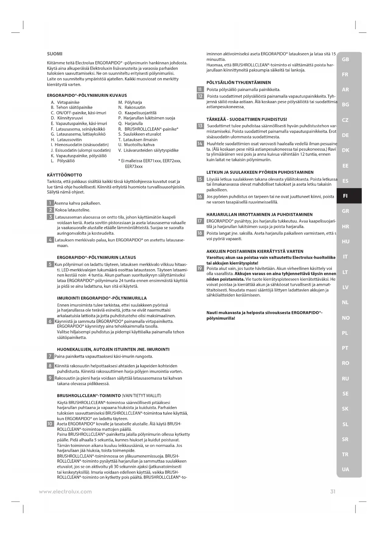 UASUOMI Kiitämme teitä Electrolux ERGORAPIDO® -pölynimurin hankinnan johdosta. Käytä aina alkuperäisiä Elektroluxin lisävarusteita ja varaosia parhaiden tuloksien saavuttamiseksi. Ne on suunniteltu erityisesti pölynimuriisi. Laite on suunniteltu ympäristöä ajatellen. Kaikki muoviosat on merkitty kierrätystä varten.
