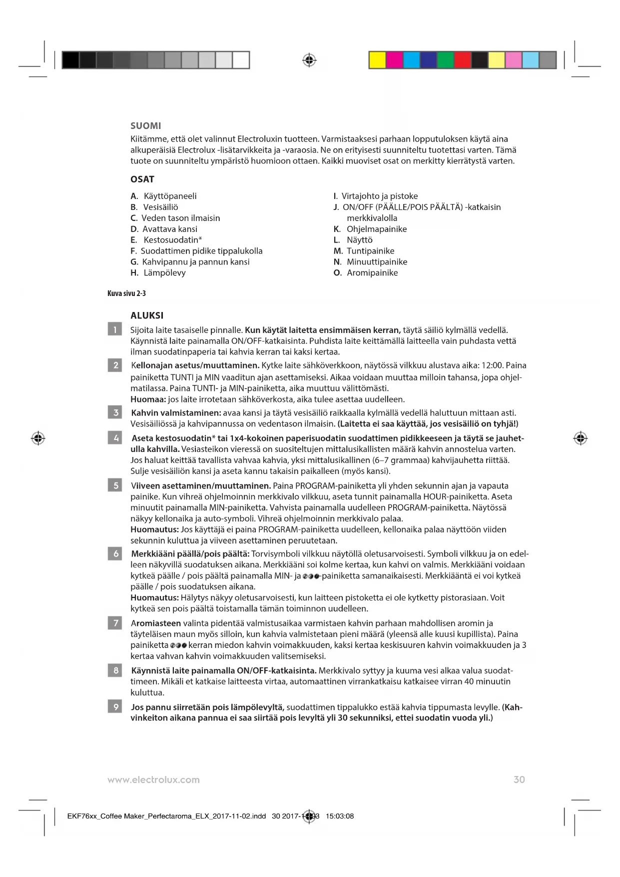 J. ON/OFF (PÄÄLLE/POIS PÄÄLTÄ) -katkaisin merkkivalolla K. Ohjelmapainike L. Näyttö M. Tuntipainike N. Minuuttipainike O. Aromipainike Kuva sivu 2-3 ALUKSI 1 Sijoita laite tasaiselle pinnalle. Kun käytät laitetta ensimmäisen kerran, täytä säiliö kylmällä vedellä. Käynnistä laite painamalla ON/OFF-katkaisinta. Puhdista laite keittämällä laitteella vain puhdasta vettä ilman suodatinpaperia tai kahvia kerran tai kaksi kertaa. 2 Kellonajan asetus/muuttaminen. Kytke laite sähköverkkoon, näytössä vilkkuu alustava aika: 12:00. Paina painiketta TUNTI ja MIN vaaditun ajan asettamiseksi. Aikaa voidaan muuttaa milloin tahansa, jopa ohjel- matilassa. Paina TUNTI- ja MIN-painiketta, aika muuttuu välittömästi. Huomaa: jos laite irrotetaan sähköverkosta, aika tulee asettaa uudelleen. 3 Kahvin valmistaminen: avaa kansi ja täytä vesisäiliö raikkaalla kylmällä vedellä haluttuun mittaan asti. Vesisäiliössä ja kahvipannussa on vedentason ilmaisin. (Laitetta ei saa käyttää, jos vesisäiliö on tyhjä!) 4 Aseta kestosuodatin* tai 1x4-kokoinen paperisuodatin suodattimen pidikkeeseen ja täytä se jauhet- ulla kahvilla. Vesiasteikon vieressä on suositeltujen mittalusikallisten määrä kahvin annostelua varten. Jos haluat keittää tavallista vahvaa kahvia, yksi mittalusikallinen (6–7 grammaa) kahvijauhetta riittää. Sulje vesisäiliön kansi ja aseta kannu takaisin paikalleen (myös kansi). 5 Viiveen asettaminen/muuttaminen. Paina PROGRAM-painiketta yli yhden sekunnin ajan ja vapauta painike. Kun vihreä ohjelmoinnin merkkivalo vilkkuu, aseta tunnit painamalla HOUR-painiketta. Aseta minuutit painamalla MIN-painiketta. Vahvista painamalla uudelleen PROGRAM-painiketta. Näytössä näkyy kellonaika ja auto-symboli. Vihreä ohjelmoinnin merkkivalo palaa. Huomautus: Jos käyttäjä ei paina PROGRAM-painiketta uudelleen, kellonaika palaa näyttöön viiden sekunnin kuluttua ja viiveen asettaminen peruutetaan. 6 Merkkiäänipäällä/pois päältä: Torvisymboli vilkkuu näytöllä oletusarvoisesti. Symboli vilkkuu ja on edel- leennäkyvillä suodatuksen aikana. Merkkiäänisoi kolme kertaa, kun kahvi on valmis. Merkkiäänivoidaan kytkeä päälle / pois päältä painamalla MIN- ja -painiketta samanaikaisesti. Merkkiääntä ei voi kytkeä päälle / poissuodatuksen aikana. Huomautus:Hälytys näkyy oletusarvoisesti, kun laitteen pistoketta ei ole kytketty pistorasiaan. Voit kytkeäsen pois päältä toistamalla tämän toiminnon uudelleen. 7 Aromiasteen valinta pidentää valmistusaikaa varmistaen kahvin parhaan mahdollisen aromin ja täyteläisen maun myös silloin, kun kahvia valmistetaan pieni määrä (yleensä alle kuusi kupillista). Paina painiketta kerran miedon kahvin voimakkuuden, kaksi kertaa keskisuuren kahvin voimakkuuden ja 3 kertaa vahvan kahvin voimakkuuden valitsemiseksi. 8 Käynnistä laite painamalla ON/OFF-katkaisinta. Merkkivalo syttyy ja kuuma vesi alkaa valua suodat- timeen. Mikäli et katkaise laitteesta virtaa, automaattinen virrankatkaisu katkaisee virran 40 minuutin kuluttua. 9 Jos pannu siirretään pois lämpölevyltä, suodattimen tippalukko estää kahvia tippumasta levylle. (Kah- vinkeiton aikana pannua ei saa siirtää pois levyltä yli 30 sekunniksi, ettei suodatin vuoda yli.) EKF76xx_Coffee Maker_Perfectaroma_ELX_2017-11-02.indd 30 2017-11-03 15:03:0831 www.electrolux.com