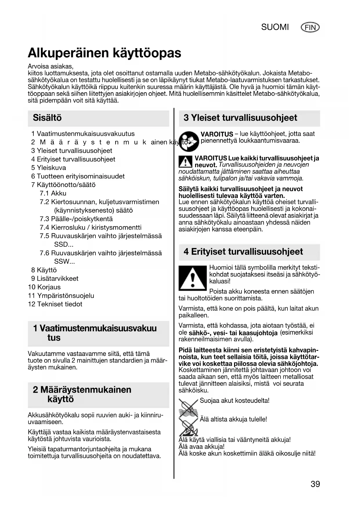 FIN 1 Vaatimustenmukaisuusvakuutus 2Määräystenmukainen käyttö 3 Yleiset turvallisuusohjeet 4 Erityiset turvallisuusohjeet 5 Yleiskuva 6 Tuotteen erityisominaisuudet 7 Käyttöönotto/säätö