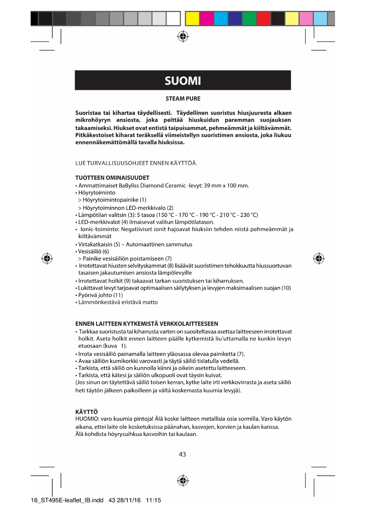 - Oppbevar rettetangen med platene sammenpresset for å gi dem eektiv beskyttelse ved hjelp av platenes låsesystem (10). 16_ST495E-leaflet_IB.indd 42 28/11/16 11:1543 SUOMI STEAM PURE Suoristaa tai kihartaa täydellisesti. Täydellinen suoristus hiusjuuresta alkaen mikrohöyryn ansiosta, joka peittää hiuskuidun paremman suojauksen takaamiseksi. Hiukset ovat entistä taipuisammat, pehmeämmät ja kiiltävämmät. Pitkäkestoiset kiharat teräksellä viimeistellyn suoristimen ansiosta, joka liukuu ennennäkemättömällä tavalla hiuksissa. LUE TURVALLISUUSOHJEET ENNEN KÄYTTÖÄ. TUOTTEEN OMINAISUUDET