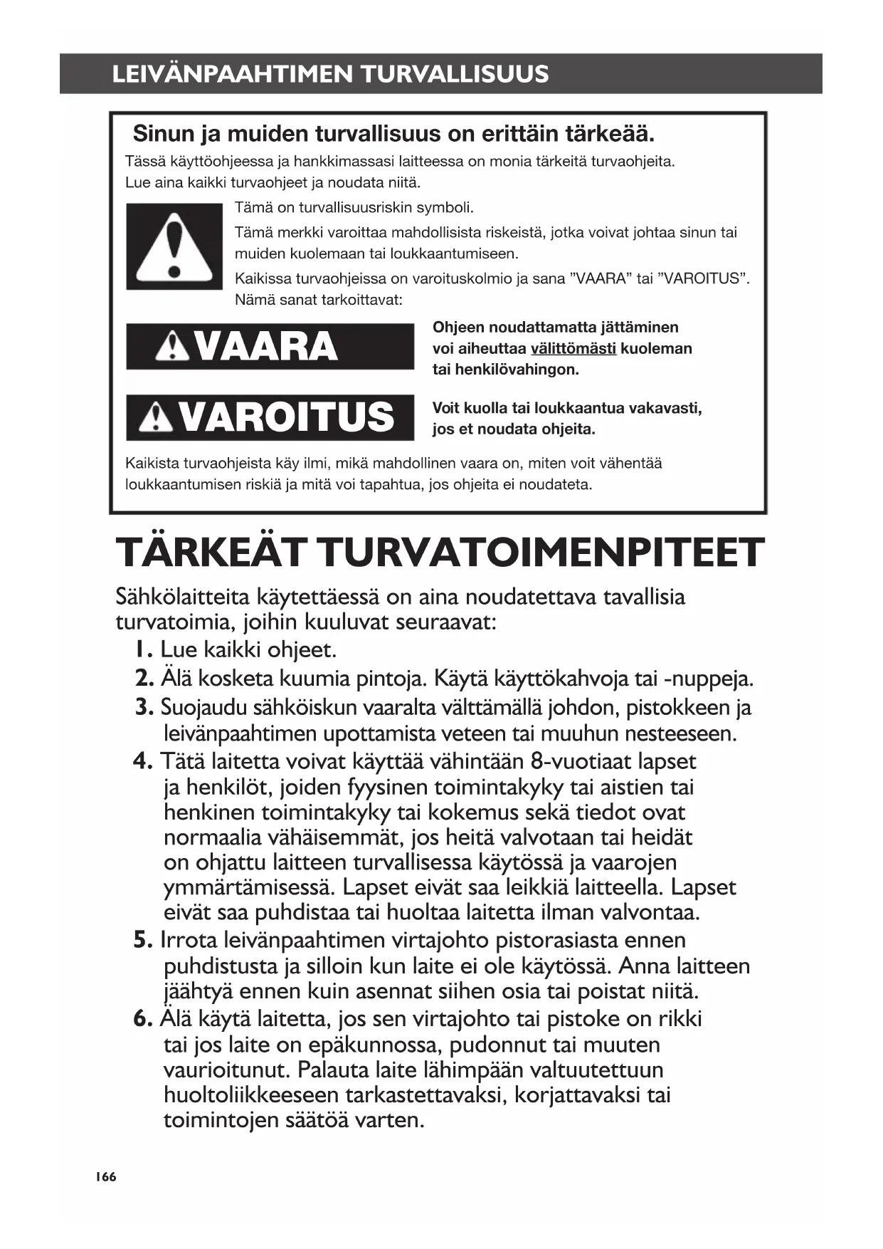 Sinun ja muiden turvallisuus on erittäin tärkeää. Tässä käyttöohjeessa ja hankkimassasi laitteessa on monia tärkeitä turvaohjeita. Lue aina kaikki turvaohjeet ja noudata niitä.Tämä on turvallisuusriskin symboli.Tämä merkki varoittaa mahdollisista riskeistä, jotka voivat johtaa sinun tai muiden kuolemaan tai loukkaantumiseen.Kaikissa turvaohjeissa on varoituskolmio ja sana ”VAARA” tai ”VAROITUS”. Nämä sanat tarkoittavat:Ohjeen noudattamatta jättäminen voi aiheuttaa välittömästi kuoleman tai henkilövahingon.Voit kuolla tai loukkaantua vakavasti, jos et noudata ohjeita.Kaikista turvaohjeista käy ilmi, mikä mahdollinen vaara on, miten voit vähentää loukkaantumisen riskiä ja mitä voi tapahtua, jos ohjeita ei noudateta. VAARA VAROITUS Sähkölaitteita käytettäessä on aina noudatettava tavallisia turvatoimia, joihin kuuluvat seuraavat: