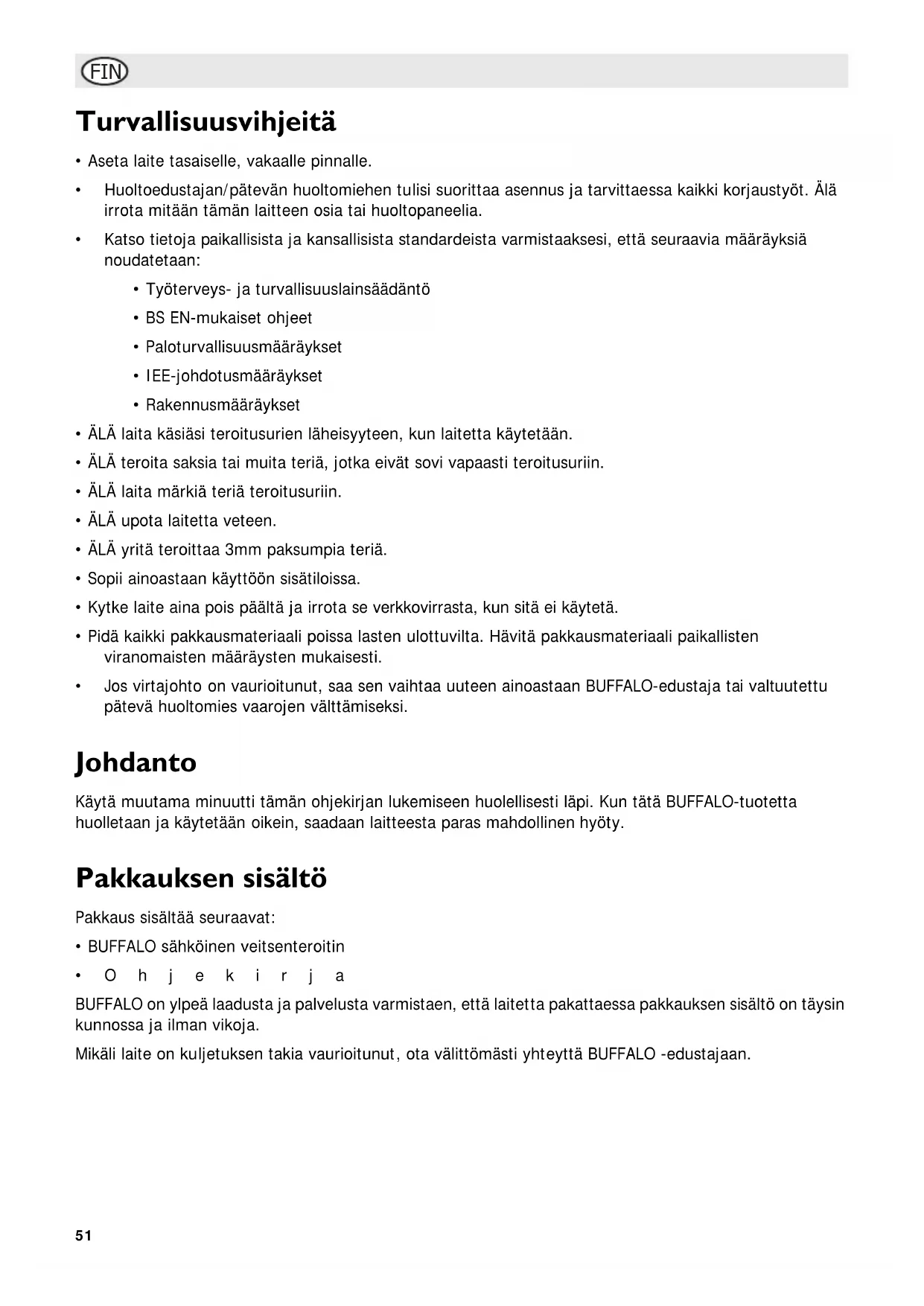 - Jos virtajohto on vauroitunut, saa sen vaihtaa uuteen ainoastaan BUFFALO-edustaja tai valtuutettu pätevä huoltomies vaarojen valttämiseksi.