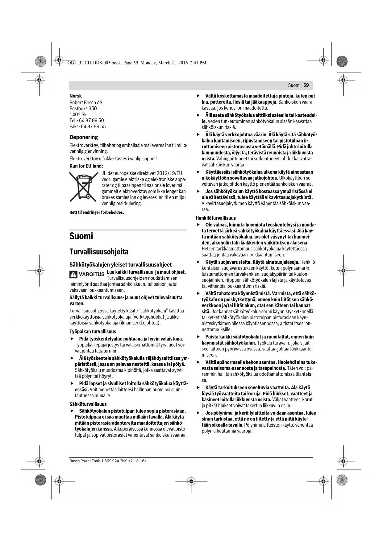 i informa- sjonen fra produsenten av innsatsverktøyet. Dette må ikke være under det maksimale turtallet til elektroverktøyet. Støv-/sponavsuging Støv fra materialer som blyholdig maling, noen tresorter, mineraler og metall kan være helsefarlige. Berøring eller innånding av støv kan utløse allergiske reaksjoner og/eller åndedrettssykdommer hos brukeren eller personer som befinner seg i nærheten. Visse typer støv som eik- eller bøkstøv gjelder som kreft- fremkallende, spesielt i kombinasjon med tilsetningsstof- fer til trebearbeidelse (kromat, trebeskyttelsesmidler). Asbestholdig materiale må kun bearbeides av fagfolk. – Sørg for god ventilasjon av arbeidsplassen. – Det anbefales å bruke en støvmaske med filterklasse P2. Følg ditt lands gyldige forskrifter for de materialene som skal bearbeides. Unngå støv på arbeidsplassen. Støv kan lett antennes. Bruk Igangsetting Ta hensyn til strømspenningen! Spenningen til strøm- kilden må stemme overens med angivelsene på elek- troverktøyets typeskilt. Inn-/utkobling For å ta i bruk elektroverktøyet skyver du først av/på-bryte- ren 4 forover, og trykker deretter på den og holder den inne. Til låsing av den trykte på-/av-bryteren 4 skyver du på-/av- bryteren 4 enda mer fremover. Til utkobling av elektroverktøyet slipper du på-/av-bryteren 4 hhv. – hvis den er låst trykker du på-/av-bryteren 4 ett øye- blikk og slipper den deretter. Kontroller slipeverktøyene før bruk. Slipeverktøyet må være feilfritt montert og kunne dreie seg fritt. Utfør en prøvekjøring på minst 1 minutt uten belastning. Ikke bruk skadede, urunde eller vibrerende slipeverk- tøy. Skadede slipeverktøy kan brekke og forårsake skader. Slå elektroverktøyet kun på når du bruker det for å spare energi. Arbeidshenvisninger Beveg slipeskiven jevnt frem og tilbake med svakt trykk for å oppnå et optimalt arbeidsresultat. For sterkt trykk reduserer ytelsesevnen til el-verktøyet og slipeskiven slites hurtigere. Oppbevar slipeverktøyet slik at det er beskyttet mot støt. Service og vedlikehold Vedlikehold og rengjøring Før alle arbeider på elektroverktøyet utføres må støp- selet trekkes ut av stikkontakten. Hold elektroverktøyet og ventilasjonsspaltene alltid rene, for å kunne arbeide bra og sikkert. Ved ekstreme bruksvilkår må du om mulig alltid bruke et avsugsanlegg. I slike tilfeller blåser du ventilasjons- spaltene ofte rene, og kobler til en jordfeilbryter (PRCD). Ved bearbeidelse av metall kan det sette seg le- dedyktig støv inne i elektroverktøyet. Beskyttelsesisola- sjonen til elektroverktøyet kan innskrenkes. Tilbehøret må lagres og behandles med omhu. Hvis det er nødvendig å skifte ut tilkoplingsledningen, må det- te gjøres av Bosch eller Bosch-serviceverksteder, slik at det ikke oppstår fare for sikkerheten. Kundeservice og rådgivning ved bruk Kundeservicen svarer på dine spørsmål om reparasjon og vedlikehold av produktet samt om reservedeleler. Spreng- skisser og informasjon om reservedeler finner du også på: www.bosch-pt.com Bosch rådgivningsteamet hjelper deg gjerne ved spørsmål an- gående våre produkter og deres tilbehør. Ved alle forespørsler og reservedelsbestillinger må du oppgi det 10-sifrede produktnummeret som er angitt på produktets typeskilt. Henk Becker Executive Vice President Engineering Helmut Heinzelmann Head of Product Certification PT/ETM9 OBJ_BUCH-1048-005.book Page 58 Monday, March 21, 2016 2:41 PMSuomi | 59 Bosch Power Tools 1 609 92A 2NY | (21.3.16) Norsk Robert Bosch AS Postboks 350 1402 Ski Tel.: 64 87 89 50 Faks: 64 87 89 55 Deponering Elektroverktøy, tilbehør og emballasje må leveres inn til miljø- vennlig gjenvinning. Elektroverktøy må ikke kastes i vanlig søppel! Kun for EU-land: Jf. det europeiske direktivet 2012/19/EU vedr. gamle elektriske og elektroniske appa- rater og tilpassingen til nasjonale lover må gammelt elektroverktøy som ikke lenger kan brukes samles inn og leveres inn til en miljø- vennlig resirkulering. Rett til endringer forbeholdes. Suomi Turvallisuusohjeita Sähkötyökalujen yleiset turvallisuusohjeet Lue kaikki turvallisuus- ja muut ohjeet. Turvallisuusohjeiden noudattamisen laiminlyönti saattaa johtaa sähköiskuun, tulipaloon ja/tai vakavaan loukkaantumiseen. Säilytä kaikki turvallisuus- ja muut ohjeet tulevaisuutta varten. Turvallisuusohjeissa käytetty käsite ”sähkötyökalu” käsittää verkkokäyttöisiä sähkötyökaluja (verkkojohdolla) ja akku- käyttöisiä sähkötyökaluja (ilman verkkojohtoa). Työpaikan turvallisuus Pidä työskentelyalue puhtaana ja hyvin valaistuna. Työpaikan epäjärjestys tai valaisemattomat työalueet voi- vat johtaa tapaturmiin. Älä työskentele sähkötyökalulla räjähdysalttiissa ym- päristössä, jossa on palavaa nestettä, kaasua tai pölyä. Sähkötyökalu muodostaa kipinöitä, jotka saattavat sytyt- tää pölyn tai höyryt. Pidä lapset ja sivulliset loitolla sähkötyökalua käyttä- essäsi. Voit menettää laitteesi hallinnan huomiosi suun- tautuessa muualle. Sähköturvallisuus Sähkötyökalun pistotulpan tulee sopia pistorasiaan. Pistotulppaa ei saa muuttaa millään tavalla. Älä käytä mitään pistorasia-adaptereita maadoitettujen sähkö- työkalujen kanssa. Alkuperäisessä kunnossa olevat pisto- tulpat ja sopivat pistorasiat vähentävät sähköiskun vaaraa. Vältä koskettamasta maadoitettuja pintoja, kuten put- kia, pattereita, liesiä tai jääkaappeja. Sähköiskun vaara kasvaa, jos kehosi on maadoitettu. Älä aseta sähkötyökalua alttiiksi sateelle tai kosteudel- le. Veden tunkeutuminen sähkötyökalun sisään kasvattaa sähköiskun riskiä. Älä käytä verkkojohtoa väärin. Älä käytä sitä sähkötyö- kalun kantamiseen, ripustamiseen tai pistotulpan ir- rottamiseen pistorasiasta vetämällä. Pidä johto loitolla kuumuudesta, öljystä, terävistä reunoista ja liikkuvista osista. Vahingoittuneet tai sotkeutuneet johdot kasvat