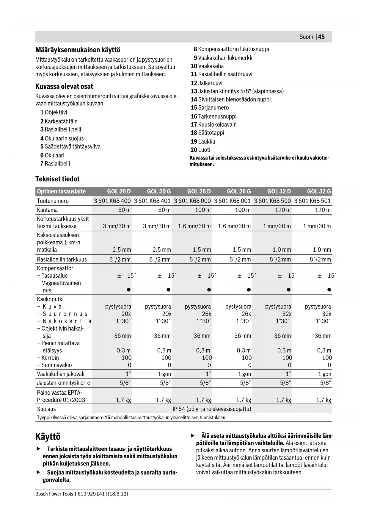 OBJ_BUCH-1239-002.book Page 44 Monday, June 18, 2012 10:51 AMSuomi | 45 Bosch Power Tools 1 619 929 L41 | (18.6.12) Määräyksenmukainen käyttö Mittaustyökalu on tarkoitettu vaakasuorien ja pystysuorien korkeusjuoksujen mittaukseen ja tarkistukseen. Se soveltuu myös korkeuksien, etäisyyksien ja kulmien mittaukseen. Kuvassa olevat osat Kuvassa olevien osien numerointi viittaa grafiikka-sivussa ole- vaan mittaustyökalun kuvaan. 1 Objektiivi 2 Karkeatähtäin 3 Rasialibelli peili 4 Okulaarin suojus 5 Säädettävä tähtäysviiva 6 Okulaari 7 Rasialibelli 8 Kompensaattorin lukitusnuppi 9 Vaakakehän lukumerkki 10 Vaakakehä 11 Rasialibellin säätöruuvi 12 Jalkaruuvi 13 Jalustan kiinnitys 5/8" (alapinnassa) 14 Sivuttaisen hienosäädön nuppi 15 Sarjanumero 16 Tarkennusnuppi 17 Kuusiokoloavain 18 Säätötappi 19 Laukku 20 Luoti Kuvassa tai selostuksessa esiintyvä lisätarvike ei kuulu vakiotoi- mitukseen. Tekniset tiedot Käyttö f Tarkista mittauslaitteen tasaus- ja näyttötarkkuus ennen jokaista työn aloittamista sekä mittaustyökalun pitkän kuljetuksen jälkeen. f Suojaa mittaustyökalu kosteudelta ja suoralta aurin- gonvalolta. f Älä aseta mittaustyökalua alttiiksi äärimmäisille läm- pötiloille tai lämpötilan vaihteluille. Älä esim. jätä sitä pitkäksi aikaa autoon. Anna suurten lämpötilavaihtelujen jälkeen mittaustyökalun lämpötilan tasaantua, ennen kuin käytät sitä. Äärimmäiset lämpötilat tai lämpötilavaihtelut voivat vaikuttaa mittaustyökalun tarkkuuteen. Optinen tasauslaite GOL 20 D GOL 20 G GOL 26 D GOL 26 G GOL 32 D GOL 32 G Tuotenumero 3 601 K68 400 3 601 K68 401 3 601 K68 000 3 601 K68 001 3 601 K68 500 3 601 K68 501 Kantama 60 m 60 m 100 m 100 m 120 m 120 m Korkeustarkkuus yksit- täismittauksessa 3 mm/30 m 3 mm/30 m 1,6 mm/30 m 1,6 mm/30 m 1 mm/30 m 1 mm/30 m Kaksoistasauksen poikkeama 1 km:n matkalla 2,5 mm 2,5 mm 1,5 mm 1,5 mm 1,0 mm 1,0 mm Rasialibellin tarkkuus 8´/2 mm 8´/2 mm 8´/2 mm 8´/2 mm 8´/2 mm 8´/2 mm Kompensaattori – Tasausalue – Magneettivaimen- nus ± 15´