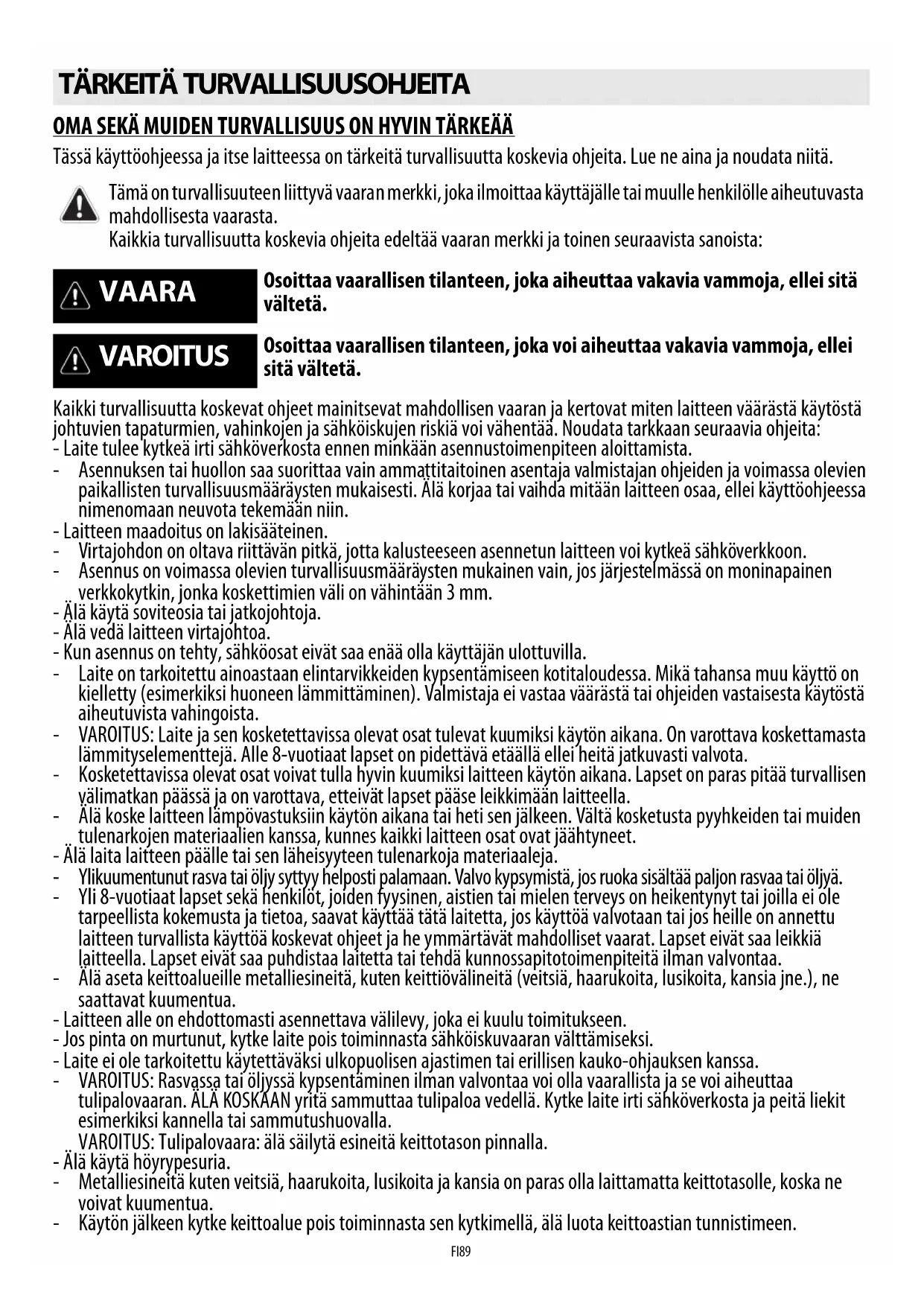 Ideel til varmholdning af netop færdige retter, vending af risotto med de sidste ingredienser og varmholdning af serveringsfade (med tilbehør egnet til induktion) OFF Ingen varme Støtteflade Kogesektionen er i standby eller slukket (mulig restvarme efter tilberedningen, vises med H)FI89 OMA SEKÄ MUIDEN TURVALLISUUS ON HYVIN TÄRKEÄÄ Tässä käyttöohjeessa ja itse laitteessa on tärkeitä turvallisuutta koskevia ohjeita. Lue ne aina ja noudata niitä. Kaikki turvallisuutta koskevat ohjeet mainitsevat mahdollisen vaaran ja kertovat miten laitteen väärästä käytöstä johtuvien tapaturmien, vahinkojen ja sähköiskujen riskiä voi vähentää. Noudata tarkkaan seuraavia ohjeita: - Laite tulee kytkeä irti sähköverkosta ennen minkään asennustoimenpiteen aloittamista. - Asennuksen tai huollon saa suorittaa vain ammattitaitoinen asentaja valmistajan ohjeiden ja voimassa olevien paikallisten turvallisuusmääräysten mukaisesti. Älä korjaa tai vaihda mitään laitteen osaa, ellei käyttöohjeessa nimenomaan neuvota tekemään niin. - Laitteen maadoitus on lakisääteinen. - Virtajohdon on oltava riittävän pitkä, jotta kalusteeseen asennetun laitteen voi kytkeä sähköverkkoon. - Asennus on voimassa olevien turvallisuusmääräysten mukainen vain, jos järjestelmässä on moninapainen verkkokytkin, jonka koskettimien väli on vähintään 3 mm. - Älä käytä soviteosia tai jatkojohtoja. - Älä vedä laitteen virtajohtoa. - Kun asennus on tehty, sähköosat eivät saa enää olla käyttäjän ulottuvilla. - Laite on tarkoitettu ainoastaan elintarvikkeiden kypsentämiseen kotitaloudessa. Mikä tahansa muu käyttö on kielletty (esimerkiksi huoneen lämmittäminen). Valmistaja ei vastaa väärästä tai ohjeiden vastaisesta käytöstä aiheutuvista vahingoista. - VAROITUS: Laite ja sen kosketettavissa olevat osat tulevat kuumiksi käytön aikana. On varottava koskettamasta lämmityselementtejä. Alle 8-vuotiaat lapset on pidettävä etäällä ellei heitä jatkuvasti valvota. - Kosketettavissa olevat osat voivat tulla hyvin kuumiksi laitteen käytön aikana. Lapset on paras pitää turvallisen välimatkan päässä ja on varottava, etteivät lapset pääse leikkimään laitteella. - Älä koske laitteen lämpövastuksiin käytön aikana tai heti sen jälkeen. Vältä kosketusta pyyhkeiden tai muiden tulenarkojen materiaalien kanssa, kunnes kaikki laitteen osat ovat jäähtyneet. - Älä laita laitteen päälle tai sen läheisyyteen tulenarkoja materiaaleja. - Ylikuumentunut rasva tai öljy syttyy helposti palamaan. Valvo kypsymistä, jos ruoka sisältää paljon rasvaa tai öljyä. - Yli 8-vuotiaat lapset sekä henkilöt, joiden fyysinen, aistien tai mielen terveys on heikentynyt tai joilla ei ole tarpeellista kokemusta ja tietoa, saavat käyttää tätä laitetta, jos käyttöä valvotaan tai jos heille on annettu laitteen turvallista käyttöä koskevat ohjeet ja he ymmärtävät mahdolliset vaarat. Lapset eivät saa leikkiä laitteella. Lapset eivät saa puhdistaa laitetta tai tehdä kunnossapitotoimenpiteitä ilman valvontaa. - Älä aseta keittoalueille metalliesineitä, kuten keittiövälineitä (veitsiä, haarukoita, lusikoita, kansia jne.), ne saattavat kuumentua. - Laitteen alle on ehdottomasti asennettava välilevy, joka ei kuulu toimitukseen. - Jos pinta on murtunut, kytke laite pois toiminnasta sähköiskuvaaran välttämiseksi. - Laite ei ole tarkoitettu käytettäväksi ulkopuolisen ajastimen tai erillisen kauko-ohjauksen kanssa. - VAROITUS: Rasvassa tai öljyssä kypsentäminen ilman valvontaa voi olla vaarallista ja se voi aiheuttaa tulipalovaaran. ÄLÄ KOSKAAN yritä sammuttaa tulipaloa vedellä. Kytke laite irti sähköverkosta ja peitä liekit esimerkiksi kannella tai sammutushuovalla. VAROITUS: Tulipalovaara: älä säilytä esineitä keittotason pinnalla. - Älä käytä höyrypesuria. - Metalliesineitä kuten veitsiä, haarukoita, lusikoita ja kansia on paras olla laittamatta keittotasolle, koska ne voivat kuumentua. - Käytön jälkeen kytke keittoalue pois toiminnasta sen kytkimellä, älä luota keittoastian tunnistimeen.