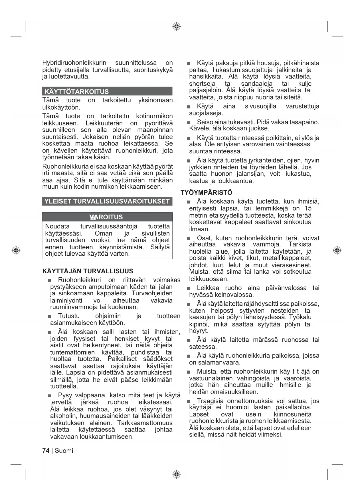 Tämä tuote on tarkoitettu yksinomaan ulkokäyttöön. Tämä tuote on tarkoitettu kotinurmikon leikkuuseen. Leikkuuterän on pyörittävä suunnilleen sen alla olevan maanpinnan suuntaisesti. Jokaisen neljän pyörän tulee koskettaa maata ruohoa leikattaessa. Se on kävellen käytettävä ruohonleikkuri, jota työnnetään takaa käsin. Ruohonleikkuria ei saa koskaan käyttää pyörät irti maasta, sitä ei saa vetää eikä sen päällä saa ajaa. Sitä ei tule käyttämään minkään muun kuin kodin nurmikon leikkaamiseen. YLEISET TURVALLISUUSVAROITUKSET VAROITUS Noudata turvallisuussääntöjä tuotetta käyttäessäsi. Oman ja sivullisten turvallisuuden vuoksi, lue nämä ohjeet ennen tuotteen käynnistämistä. Säilytä ohjeet tulevaa käyttöä varten.