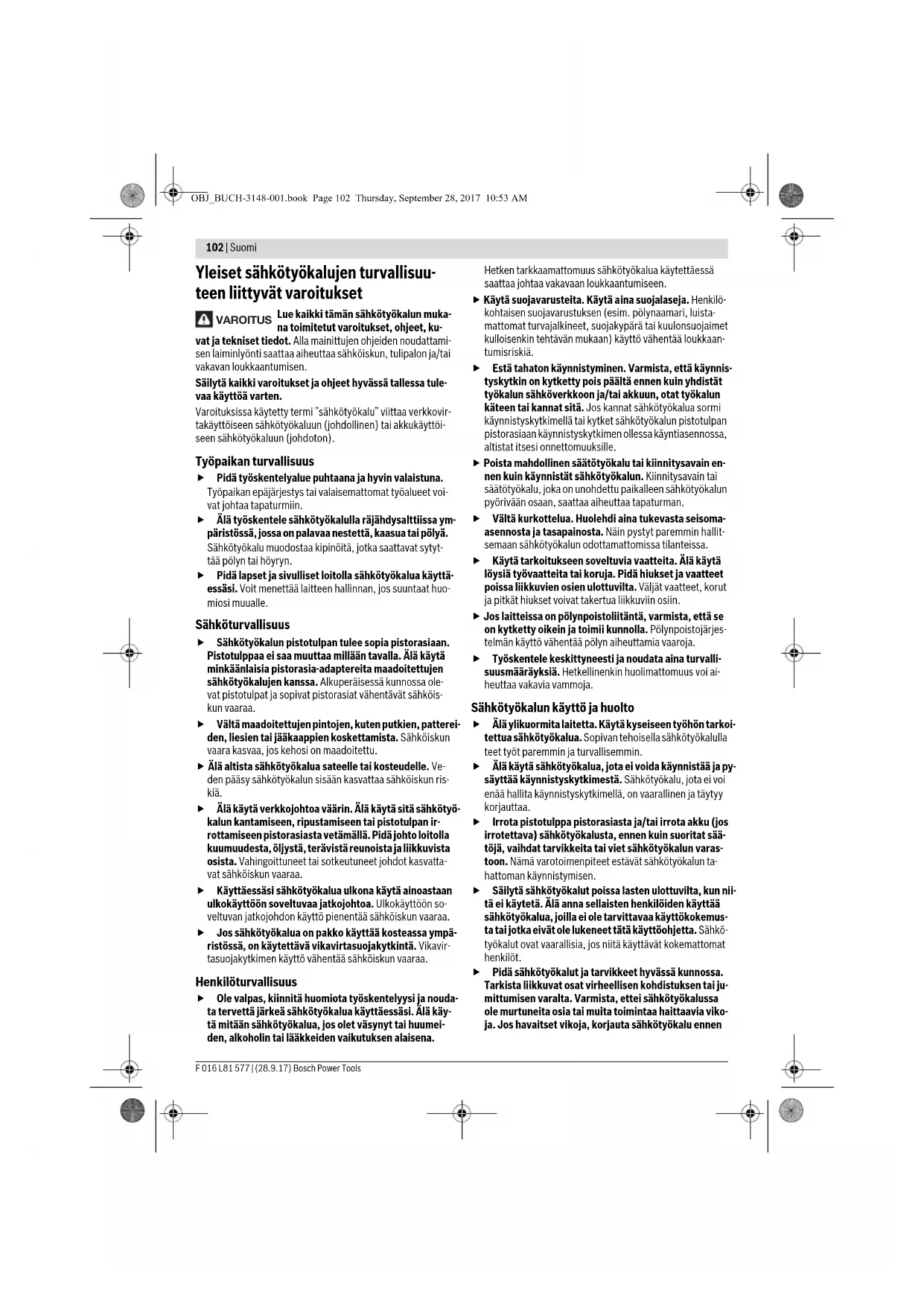 Tehtävä Kuva Sivu OBJ_BUCH-3148-001.book Page 107 Thursday, September 28, 2017 10:53 AM108 | Suomi F 016 L81 577 | (28.9.17) Bosch Power Tools Näyttöelinten merkitys (AL 1815 CV) Akun latauksen vilkkuva merkkivalo Lataustapahtuma osoitetaan vilkkuvalla akun latauksen merkkivalolla . Akun latauksen jatkuva merkkivalo Jatkuva valo akun latauksen merkkivalossa osoittaa, että akku on ladattu täyteen tai että akun lämpötila on sallitun latauslämpötila-alu- een ulkopuolella, eikä sitä voi ladata. Heti, kun sallittu lämpö- tilaalue on saavutettu, akku ladataan. Ilman asennettua akkua osoittaa jatkuva valo akun latauksen merkkivalossa , että pistotulppa on liitetty pistorasiaan ja lata- uslaite on käyttövalmis. Viat – Syyt ja korjaus Latausohjeita Jatkuvassa käytössä tai usean peräkkäisen tauottoman la- tausjakson aikana saattaa latauslaite lämmetä. Tämä ei kui- tenkin ole latauslaitteen tekninen vika. Laitteen huomattavasti lyhentynyt käyttöaika latauksen jäl- keen osoittaa, että akku on loppuunkäytetty ja täytyy vaihtaa uuteen. Asennus Irrota akku laitteesta ennen kaikkia laitteeseen kohdis- tuvia töitä (esim. huolto, työkalun vaihto jne.) sekä lai- tetta kuljetettaessa ja säilytettäessä. Käynnistyskytki- men ja lukitusnupin tahaton painallus muodostaa loukkaantumisvaaran. Laitteen kokoaminen (katso kuvat C+E) Yhdistä pensasleikkurin pää ja teleskooppikahva toisiinsa ja lukitse ne kiertämällä liitoskappaletta 3. Varmista, että mo- lemmat osat on asennettu oikein ja ovat lukittuina. Kiinnitä kantohihna 8 kahvoissa oleviin kantohihnan silmuk- koihin 7/9. Ota huomioon, että kantohihnassa on kaksi eriko- koista hakasta. Varmista että kantohihnan isompi hakanen 16 kiinnitetään takakahvan kantohihnan silmukkaan 9 ja pienem- pi hakanen 15 etukahvan kantohihnan silmukkaan 7. Poista teränsuojus. Teleskooppikorkeuden asetus (katso kuva F) Avaa teleskooppikorkeussäädin 5 kiertämällä, aseta tele- skooppiputki 4 halutulle pituudelle ja kierrä taas teleskooppi- korkeussäädin 5 kiinni. Käytön ja pensasaidan korkeuden mukaan teleskooppiputki 4 voidaan asettaa 2,1 m - 2,60 m pituuteen. Kääntyvän pään asetus (katso kuva H) Paina samanaikaisesti kahta säätönuppia 2, aseta kääntyvä pää haluttuun asentoon liikuttamalla pensasleikkurin pään ylös tai alas, päästä säätönupit 2 vapaiksi ja tarkista, että pen- sasleikkurin pää on lukkiutunut asianmukaisesti. Kääntyvän pään voi lukita 10 eri asentoon. Käyttöohjeet Käynnistys ja pysäytys (katso kuva I) Käynnistä laite painamalla ensin lukituspainiketta 10 ja sen jälkeen käynnistyskytkintä 12. Pidä käynnistyskytkin painet- tuna laitteen käytön aikana. Laitteen ollessa käynnissä voit päästää lukituspainikkeen vapaaksi. Pysäytä sähkötyökalu päästämällä käynnistyskytkin 12 va- paaksi. Käynnistä energiansäästön takia sähkötyökalu vain, kun käy- tät sitä. ”Electronic Cell Protection (ECP)” suojaa litiumioniakkua sy- väpurkaukselta. Akun tyhjetessä suojakytkentä pysäyttää sähkötyökalun: Laite ei toimi enää. Työskentelyohjeita (katso kuva J) Anti-tukkeutumismekanismi Tämä laite on varustettu lukkiutumisen estojärjestelmällä käyttäjän hyödyksi. Moottorin kuorma kasvaa, jos leikkuuterä osuu kovaan ainekseen. Älykäs mikroelektroniikka tunnistaa ylikuormituksen ja muuttaa moottorin kytkennän usean ker- ran pensasleikkurin lukkiutumisen estämiseksi ja materiaalin katkaisemiseksi. Tämä kuuluva vaihtokytkentä kestää jopa 3 s. Katkaisun jälkeen laite jatkaa normaalitilassa, tai sitten leik- kuuterä jää automaattisesti avattuun tilaan (esim. Jos vahin- gossa pala metalliaitaa on lukinnut puutarhalaitteen). Syy Korjaus Akun latauksen merkkivalo palaa pysyvästi Akun latauksen punainen merkkivalo vilkkuu Lataus ei ole mahdollinen Akku ei (oikein) paikallaan Asenna akku kunnolla pai- kalleen Akun kosketuspinnat ovat li- kaisia Puhdista akun kosketuspin- nat esim. asentamalla ja ir- rottamalla akku useamman kerran, vaihda tarvittaessa akku uuteen Akku on viallinen Vaihda akku uuteen Akun latauksen merkkivalo tai ei pala Latauslaitteen verkkopisto- tulppaa ei ole liitetty (oikein) Liitä pistotulppa (kunnolla) pistorasiaan Pistorasia, verkkojohto tai latauslaite on viallinen Tarkista verkkojännite, anna Bosch-sopimushuollon tar- kistaa latauslaite OBJ_BUCH-3148-001.book Page 108 Thursday, September 28, 2017 10:53 AMSuomi | 109 Bosch Power Tools F 016 L81 577 | (28.9.17) Vianetsintä Seuraavassa taulukossa on vikaoireita, mahdolliset syyt sekä oikeat korjaustoimenpiteet siltä varalta, että puutarhalaitteesi jos- kus ei toimisi moitteettomasti. Ellet näiden avulla pysty paikallistamaan ja korjaamaan vikaa, tulee sinun kääntyä huoltokorjaa- mosi puoleen. Huomio: Pysäytä puutarhalaite ja irrota akku ennen vianetsintää. Vian oire Mahdolliset vikalähteet Korjaus Leikkuuaika latausta kohti on liian lyhyt Liikaa kitkaa puuttuvan voitelun takia Ruiskuta voiteluöljyä (1 609 200 399) Terä on puhdistettava Puhdista terä huono leikkaustekniikka katso ”Työohjeet” Akku ei ole täydessä latauksessa Lataa akku, katso myös akun ”Latausohjeita” Akun lämpötilanvalvoja on lauennut Anna akun jäähtyä ja käynnistä uudelleen Terät liikkuvat hitaasti tai anti-tukkeutumismekanis- mi ei toimi Akun on purkautunut Anna akun jäähtyä ja käynnistä uudelleen Akku on varastoitu sallitun lämpötila-alueen ul- kopuolella Anna akun lämmetä huoneenlämpötilaan (akun sallitun lämpötila-alueen 0 –45° puitteessa) Pensasleikkuri ei toimi Akun on purkautunut Lataa akku, katso myös akun ”Latausohjeita” Käynnistysvarmistinta ei ole lukittu oikein katso ”Käyttöönotto” Pensasleikkuri käy katko- naisesti Moottorin kiertosuunta vaihtuu jatkuvasti ja se pysähtyy n. 3 s kuluttua katso ”Työskentelyohjeet” (Anti-tukkeutumis- mekanismi) Puutarhalaitteen sisäisessä johdotuksessa vika Käänny Bosch-sopim