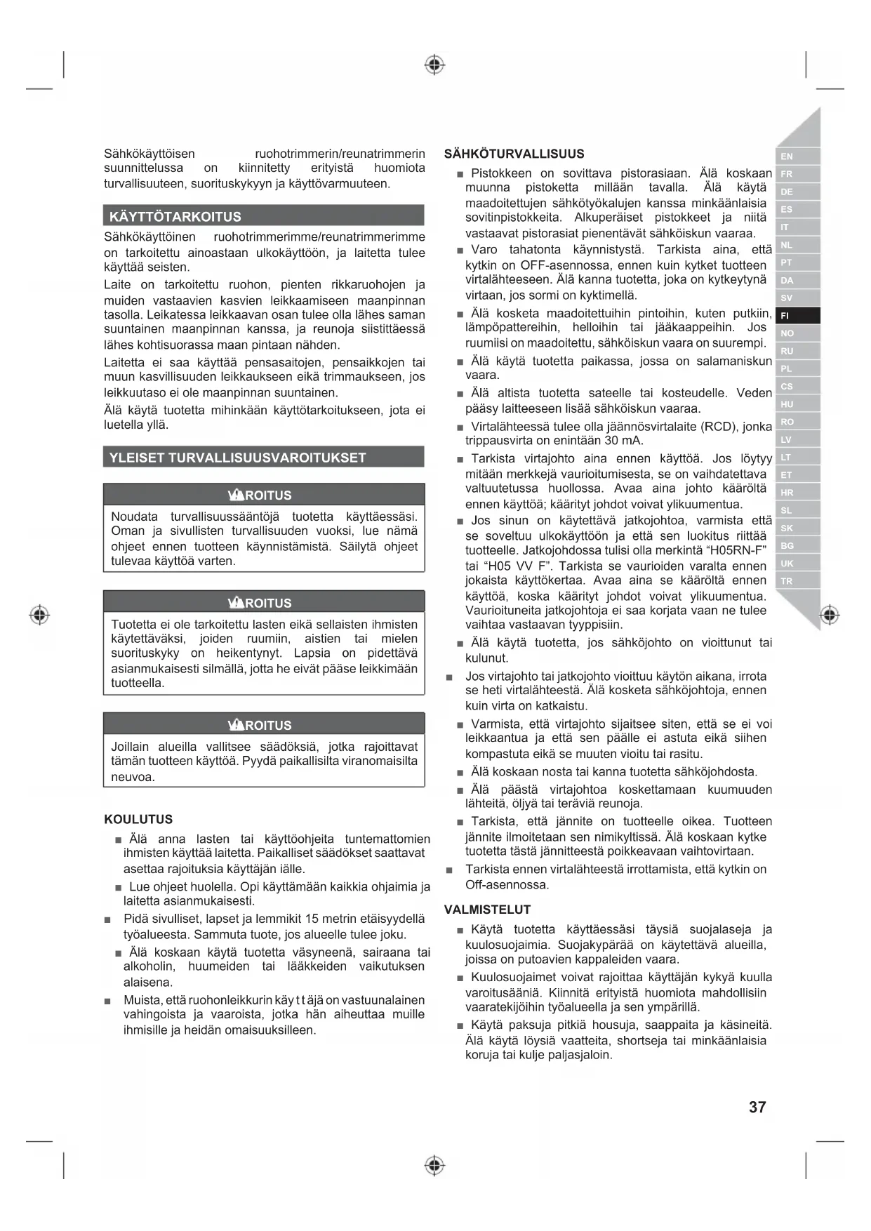 Sähkökäyttöinen ruohotrimmerimme/reunatrimmerimme on tarkoitettu ainoastaan ulkokäyttöön, ja laitetta tulee käyttää seisten. Laite on tarkoitettu ruohon, pienten rikkaruohojen ja muiden vastaavien kasvien leikkaamiseen maanpinnan tasolla. Leikatessa leikkaavan osan tulee olla lähes saman suuntainen maanpinnan kanssa, ja reunoja siistittäessä lähes kohtisuorassa maan pintaan nähden. Laitetta ei saa käyttää pensasaitojen, pensaikkojen tai muun kasvillisuuden leikkaukseen eikä trimmaukseen, jos leikkuutaso ei ole maanpinnan suuntainen. Älä käytä tuotetta mihinkään käyttötarkoitukseen, jota ei luetella yllä. YLEISET TURVALLISUUSVAROITUKSET VAROITUS Noudata turvallisuussääntöjä tuotetta käyttäessäsi. Oman ja sivullisten turvallisuuden vuoksi, lue nämä ohjeet ennen tuotteen käynnistämistä. Säilytä ohjeet tulevaa käyttöä varten. VAROITUS Tuotetta ei ole tarkoitettu lasten eikä sellaisten ihmisten käytettäväksi, joiden ruumiin, aistien tai mielen suorituskyky on heikentynyt. Lapsia on pidettävä asianmukaisesti silmällä, jotta he eivät pääse leikkimään tuotteella. VAROITUS Joillain alueilla vallitsee säädöksiä, jotka rajoittavat tämän tuotteen käyttöä. Pyydä paikallisilta viranomaisilta neuvoa. KOULUTUS ■ Älä anna lasten tai käyttöohjeita tuntemattomien ihmisten käyttää laitetta. Paikalliset säädökset saattavat asettaa rajoituksia käyttäjän iälle. ■ Lue ohjeet huolella. Opi käyttämään kaikkia ohjaimia ja laitetta asianmukaisesti. ■ Pidä sivulliset, lapset ja lemmikit 15 metrin etäisyydellä työalueesta. Sammuta tuote, jos alueelle tulee joku. ■ Älä koskaan käytä tuotetta väsyneenä, sairaana tai alkoholin, huumeiden tai lääkkeiden vaikutuksen alaisena. ■ Muista, että ruohonleikkurin käy t t äjä on vastuunalainen vahingoista ja vaaroista, jotka hän aiheuttaa muille ihmisille ja heidän omaisuuksilleen.
