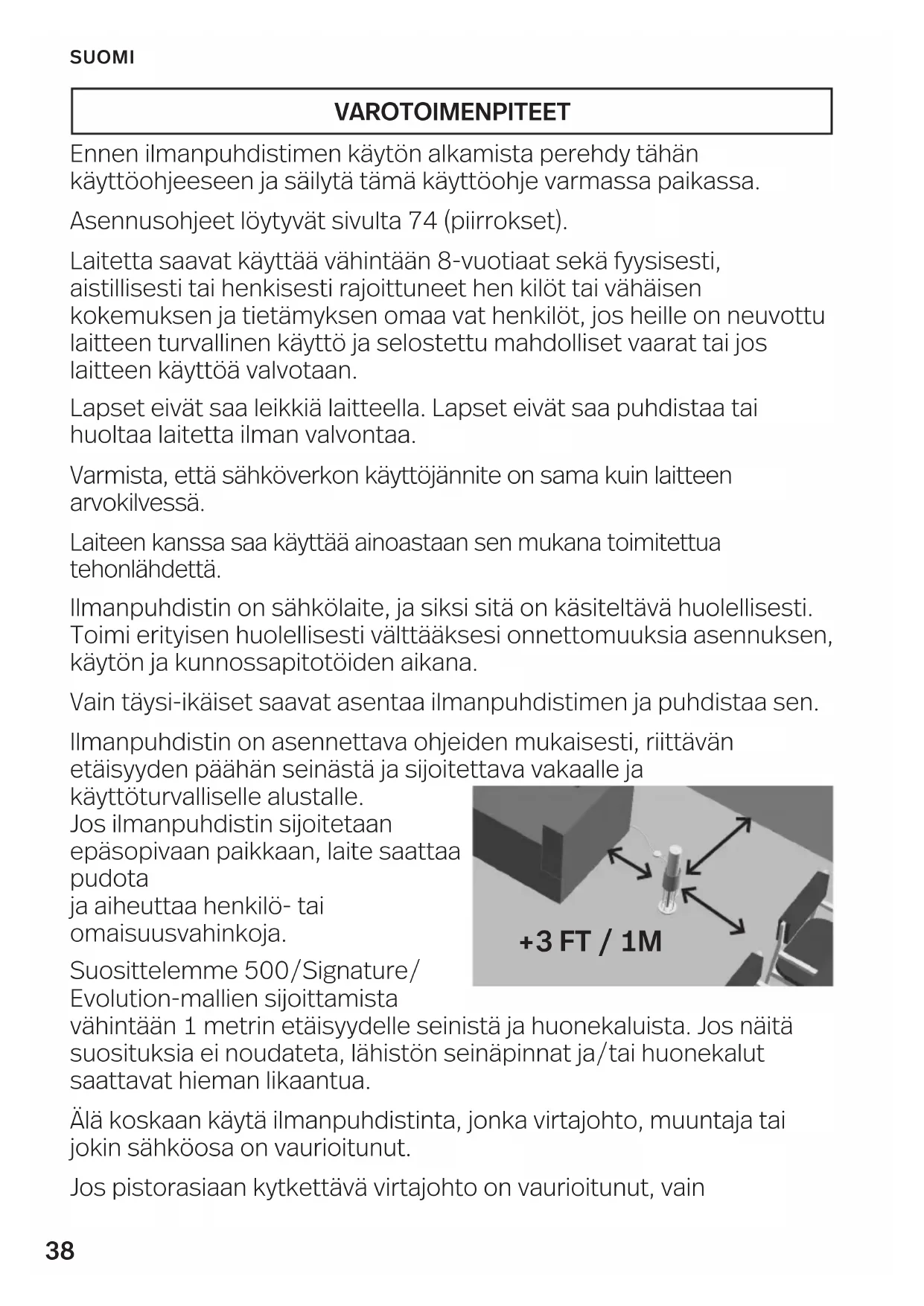 IonFlow 500, Signature og Evolution: 1 iongenerator (over: 3 koronanåler, under: utløp og metallkrok) 1 beholder 1 akrylsokkel 1 bryter 1 transformator 4 dekorative lys 1 berøringsbeskyttelse (32 ribber og 2 monteringsringer) 1 børste for Corona-nåler37 NORSK Se www.lifeair.com for garanti 4 dekorative lys Beskyttelsesutstyr TILBEHØR TIL IONFLOW 500, SIGNATURE OG EVOLUTION: Riktig deponering av dette produktet: Dette merket angir at apparatet ikke skal kastes i restavfall i EU. For å forhindre mulig skade på miljøet eller menneskers helse på grunn av ukontrollert avfallsdeponering skal apparatet resirkuleres på en ansvarlig måte for å bidra til bærekraftig gjenbruk av materialressurser. Lever det brukte apparatet til gjenvinning via lokale retur- og innsamlingssystemer, eller kontakt forhandleren der du kjøpte produktet. Forhandleren kan ta imot produktet til miljøvennlig gjenvinning.38 VAROTOIMENPITEET Ennen ilmanpuhdistimen käytön alkamista perehdy tähän käyttöohjeeseen ja säilytä tämä käyttöohje varmassa paikassa. Asennusohjeet löytyvät sivulta 74 (piirrokset). Laitetta saavat käyttää vähintään 8-vuotiaat sekä fyysisesti, aistillisesti tai henkisesti rajoittuneet hen kilöt tai vähäisen kokemuksen ja tietämyksen omaa vat henkilöt, jos heille on neuvottu laitteen turvallinen käyttö ja selostettu mahdolliset vaarat tai jos laitteen käyttöä valvotaan. Lapset eivät saa leikkiä laitteella. Lapset eivät saa puhdistaa tai huoltaa laitetta ilman valvontaa. Varmista, että sähköverkon käyttöjännite on sama kuin laitteen arvokilvessä. Laiteen kanssa saa käyttää ainoastaan sen mukana toimitettua tehonlähdettä. Ilmanpuhdistin on sähkölaite, ja siksi sitä on käsiteltävä huolellisesti. Toimi erityisen huolellisesti välttääksesi onnettomuuksia asennuksen, käytön ja kunnossapitotöiden aikana. Vain täysi-ikäiset saavat asentaa ilmanpuhdistimen ja puhdistaa sen. Ilmanpuhdistin on asennettava ohjeiden mukaisesti, riittävän etäisyyden päähän seinästä ja sijoitettava vakaalle ja käyttöturvalliselle alustalle. Jos ilmanpuhdistin sijoitetaan epäsopivaan paikkaan, laite saattaa pudota ja aiheuttaa henkilö- tai omaisuusvahinkoja. Suosittelemme 500/Signature/ Evolution-mallien sijoittamista vähintään 1 metrin etäisyydelle seinistä ja huonekaluista. Jos näitä suosituksia ei noudateta, lähistön seinäpinnat ja/tai huonekalut saattavat hieman likaantua. Älä koskaan käytä ilmanpuhdistinta, jonka virtajohto, muuntaja tai jokin sähköosa on vaurioitunut. Jos pistorasiaan kytkettävä virtajohto on vaurioitunut, vain +3 FT / 1M SUOMI39 SUOMI ammattitaitoinen henkilö saa vaihtaa sen uuteen. Sähköiskujen, palovaaran, henkilövammojen ja muiden vaaratilanteiden välttämiseksi ilmanpuhdistinta ja sen muuntajaa ei saa upottaa veteen tai muihin nesteisiin. Älä sijoita ilmanpuhdistinta tai sen virtajohtoa lämmönlähteen läheisyyteen. Älä käytä ilmanpuhdistinta ulkona. Älä käytä ilmanpuhdistinta kosteissa tiloissa. Älä käytä ilmanpuhdistinta samaan aikaan kuin värillinen tai öljypohjainen kynttilä palaa, koska ne erittävät seiniin ja huonekaluihin helposti tarttuvaa nokea. Keräintä kosketettaessa saattaa tuntua pieni sähköpurkaus. Tämä on vaaratonta! Jos sähköpurkaus tuntuu epämiellyttävältä, irrota laitteen virtapistoke pistorasiasta ennen kuin alat käsitellä laitetta ja käytä toiminnassa olevan ilmanpuhdistimen edessä suojusta. Huomaa, että suojus on lisävaruste eikä turvallisuuden kannalta välttämätön. Huomautus: LifeAir ei ole vastuussa seurannaisvahingoista, joita suositusten laiminlyönneistä seuraa.40 SUOMI Virransyöttö TÄYTYY aina katkaista ja ilmanpuhdistin on kytkettävä pois päältä ennen laitteen puhdistustöiden aloittamista. Keräintä EI saa pestä astianpesukoneessa. Ilmanpuhdistinta EI saa puhdistaa alkoholia, ammoniakkia tai emäksisiä aineita sisältävillä tuotteilla, koska ne voivat vaurioittaa laitetta. Keräin on puhdistettava noin kahden viikon välein tai tarvittaessa. Jos käyttöympäristössä on paljon ilmansaasteita, keräin saatetaan joutua puhdistamaan useamminkin. Keräimen puhdistus: