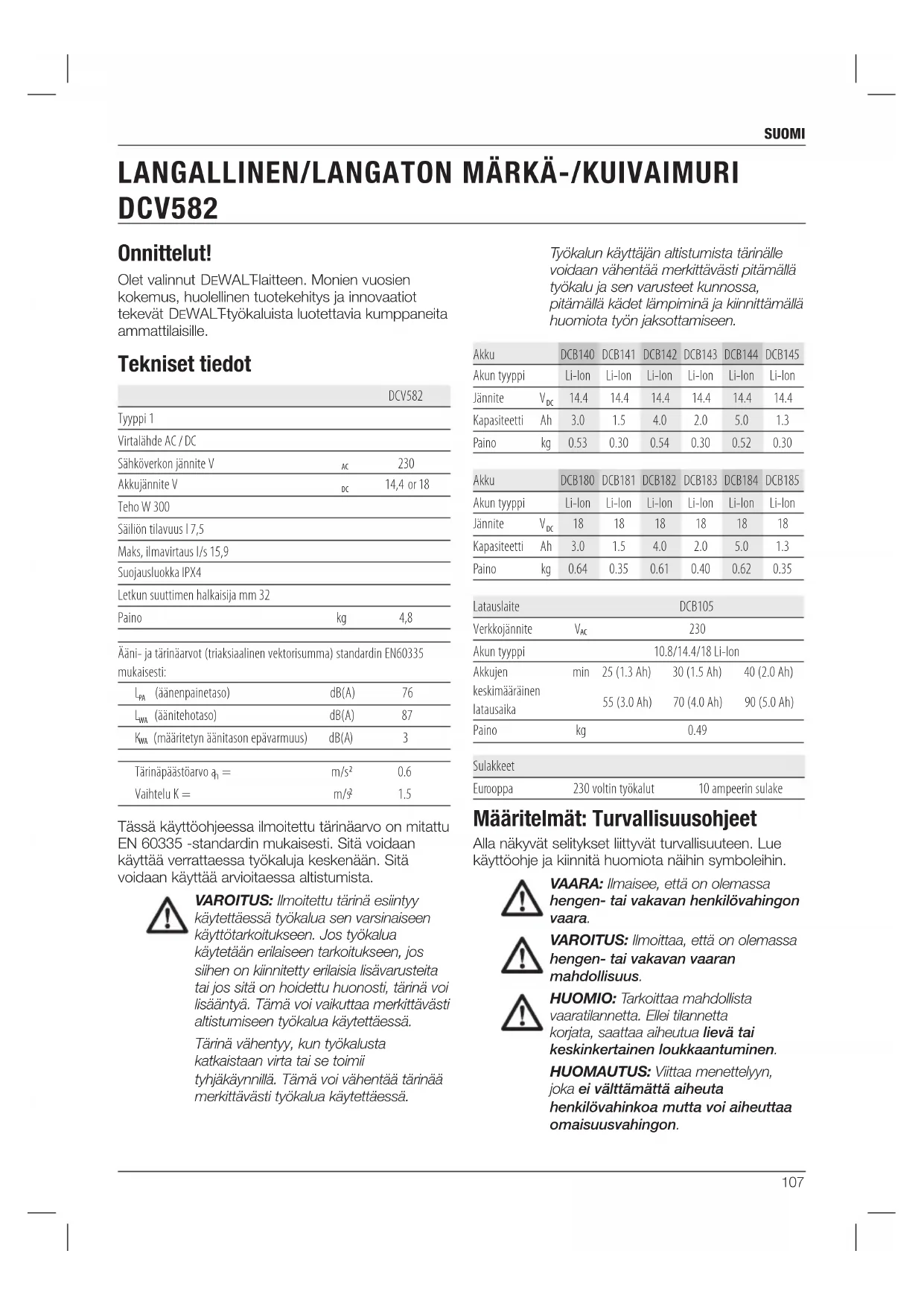 Akun tyyppi 10.8/14.4/18 Li-Ion Akkujen keskimääräinen latausaika min 25 (1.3 Ah) 30 (1.5 Ah) 40 (2.0 Ah) 55 (3.0 Ah) 70 (4.0 Ah) 90 (5.0 Ah) Paino kg 0.49 Sulakkeet Eurooppa 230 voltin työkalut 10 ampeerin sulake Määritelmät: Turvallisuusohjeet Alla näkyvät selitykset liittyvät turvallisuuteen. Lue käyttöohje ja kiinnitä huomiota näihin symboleihin. VAARA: Ilmaisee, että on olemassa hengen- tai vakavan henkilövahingon vaara. VAROITUS: Ilmoittaa, että on olemassa hengen- tai vakavan vaaran mahdollisuus. HUOMIO: Tarkoittaa mahdollista vaaratilannetta. Ellei tilannetta korjata, saattaa aiheutua lievä tai keskinkertainen loukkaantuminen. HUOMAUTUS: Viittaa menettelyyn, joka ei välttämättä aiheuta henkilövahinkoa mutta voi aiheuttaa omaisuusvahingon.108 suomi