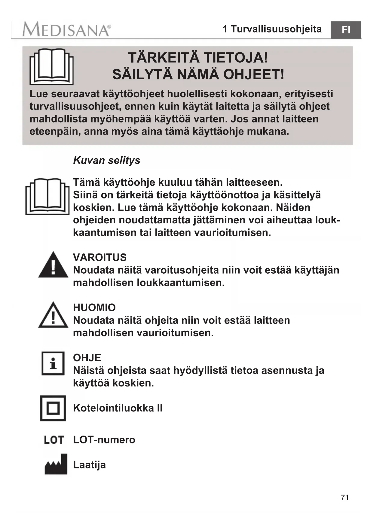 TÄRKEITÄ TIETOJA! SÄILYTÄ NÄMÄ OHJEET! Lue seuraavat käyttöohjeet huolellisesti kokonaan, erityisesti turvallisuusohjeet, ennen kuin käytät laitetta ja säilytä ohjeet mahdollista myöhempää käyttöä varten. Jos annat laitteen eteenpäin, anna myös aina tämä käyttäohje mukana. Kuvan selitys Tämä käyttöohje kuuluu tähän laitteeseen. Siinä on tärkeitä tietoja käyttöönottoa ja käsittelyä koskien. Lue tämä käyttöohje kokonaan. Näiden ohjeiden noudattamatta jättäminen voi aiheuttaa louk- kaantumisen tai laitteen vaurioitumisen. VAROITUS Noudata näitä varoitusohjeita niin voit estää käyttäjän mahdollisen loukkaantumisen. HUOMIO Noudata näitä ohjeita niin voit estää laitteen mahdollisen vaurioitumisen. OHJE Näistä ohjeista saat hyödyllistä tietoa asennusta ja käyttöä koskien. Kotelointiluokka II72 1 Turvallisuusohjeita