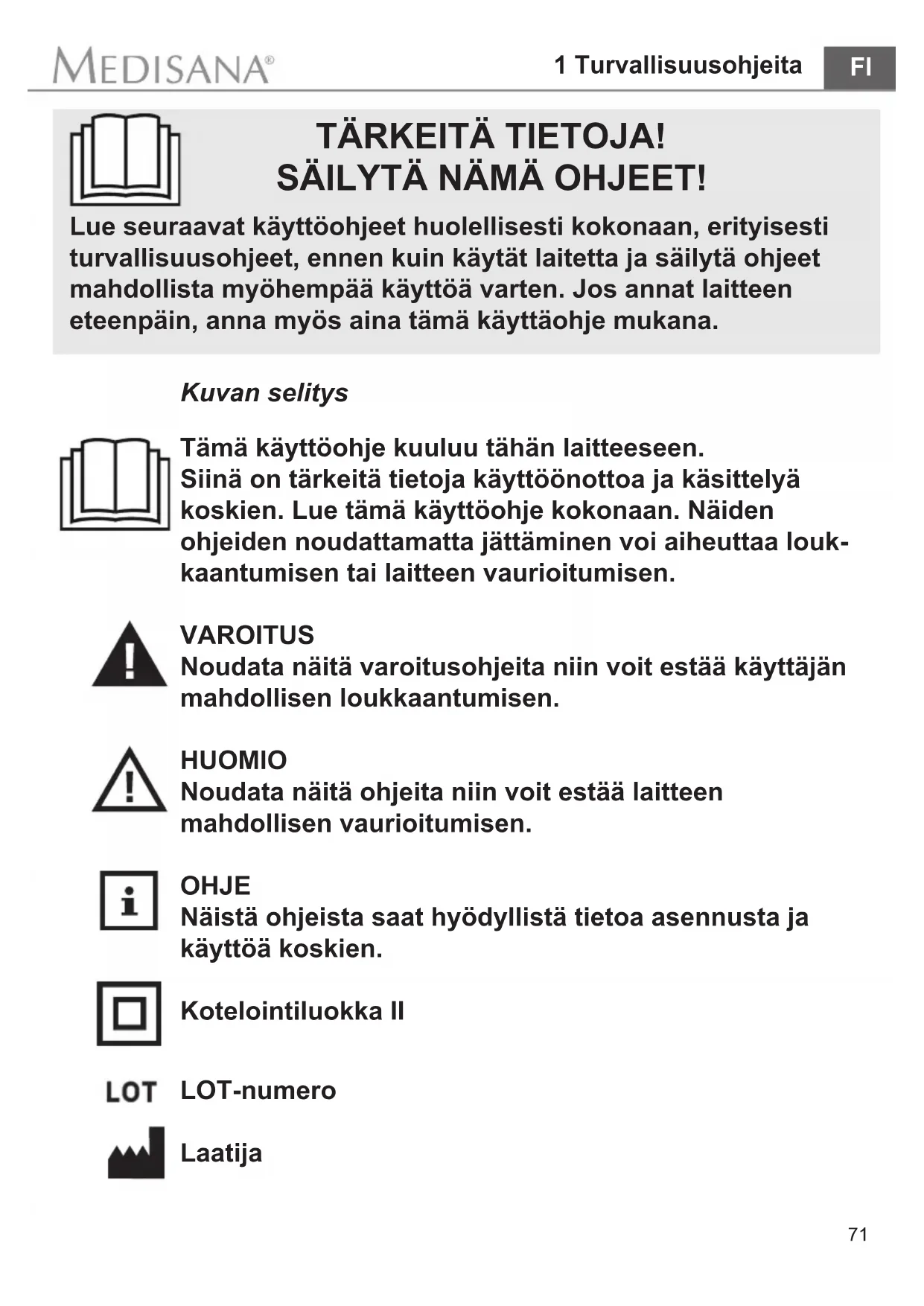 TÄRKEITÄ TIETOJA! SÄILYTÄ NÄMÄ OHJEET! Lue seuraavat käyttöohjeet huolellisesti kokonaan, erityisesti turvallisuusohjeet, ennen kuin käytät laitetta ja säilytä ohjeet mahdollista myöhempää käyttöä varten. Jos annat laitteen eteenpäin, anna myös aina tämä käyttäohje mukana. Kuvan selitys Tämä käyttöohje kuuluu tähän laitteeseen. Siinä on tärkeitä tietoja käyttöönottoa ja käsittelyä koskien. Lue tämä käyttöohje kokonaan. Näiden ohjeiden noudattamatta jättäminen voi aiheuttaa louk- kaantumisen tai laitteen vaurioitumisen. VAROITUS Noudata näitä varoitusohjeita niin voit estää käyttäjän mahdollisen loukkaantumisen. HUOMIO Noudata näitä ohjeita niin voit estää laitteen mahdollisen vaurioitumisen. OHJE Näistä ohjeista saat hyödyllistä tietoa asennusta ja käyttöä koskien. Kotelointiluokka II72 1 Turvallisuusohjeita