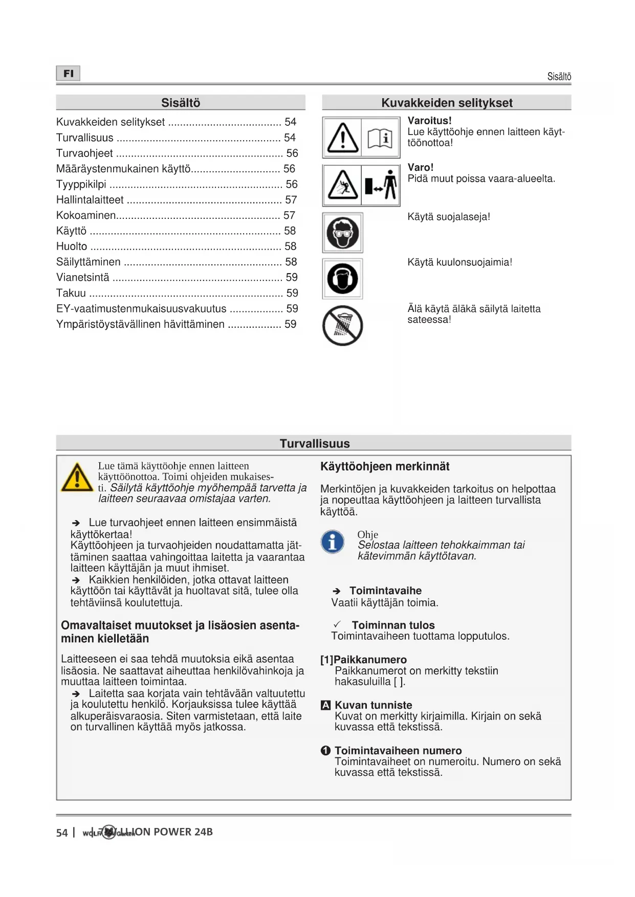 - Ympäristöystävällinen hävittäminen Turvallisuus Kuvakkeiden selitykset Varoitus! Lue käyttöohje ennen laitteen käyt- töönottoa! Varo! Pidä muut poissa vaara-alueelta. Käytä suojalaseja! Käytä kuulonsuojaimia! Älä käytä äläkä säilytä laitetta sateessa!Turvaohjeet p. 59
