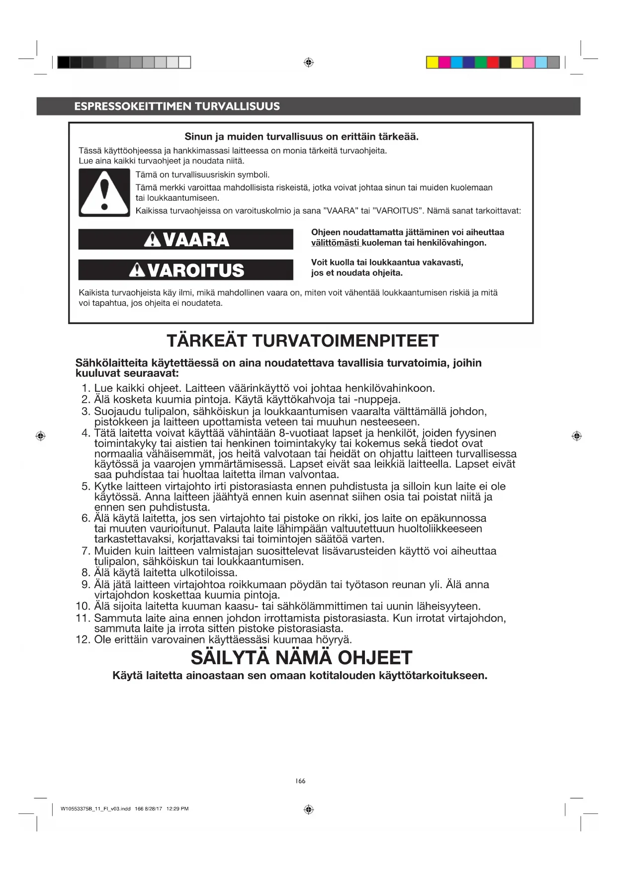 Käytä laitetta ainoastaan sen omaan kotitalouden käyttötarkoitukseen. Tässä käyttöohjeessa ja hankkimassasi laitteessa on monia tärkeitä turvaohjeita. Lue aina kaikki turvaohjeet ja noudata niitä.Tämä on turvallisuusriskin symboli.Tämä merkki varoittaa mahdollisista riskeistä, jotka voivat johtaa sinun tai muiden kuolemaan tai loukkaantumiseen.Kaikissa turvaohjeissa on varoituskolmio ja sana ”VAARA” tai ”VAROITUS”. Nämä sanat tarkoittavat:Ohjeen noudattamatta jättäminen voi aiheuttaa välittömästi kuoleman tai henkilövahingon.Voit kuolla tai loukkaantua vakavasti, jos et noudata ohjeita.Voit kuolla tai loukkaantua vakavasti, jos et noudata ohjeita.Kaikista turvaohjeista käy ilmi, mikä mahdollinen vaara on, miten voit vähentää loukkaantumisen riskiä ja mitä voi tapahtua, jos ohjeita ei noudateta. Sinun ja muiden turvallisuus on erittäin tärkeää. VAROITUS VAARA ESPRESSOKEITTIMEN TURVALLISUUS