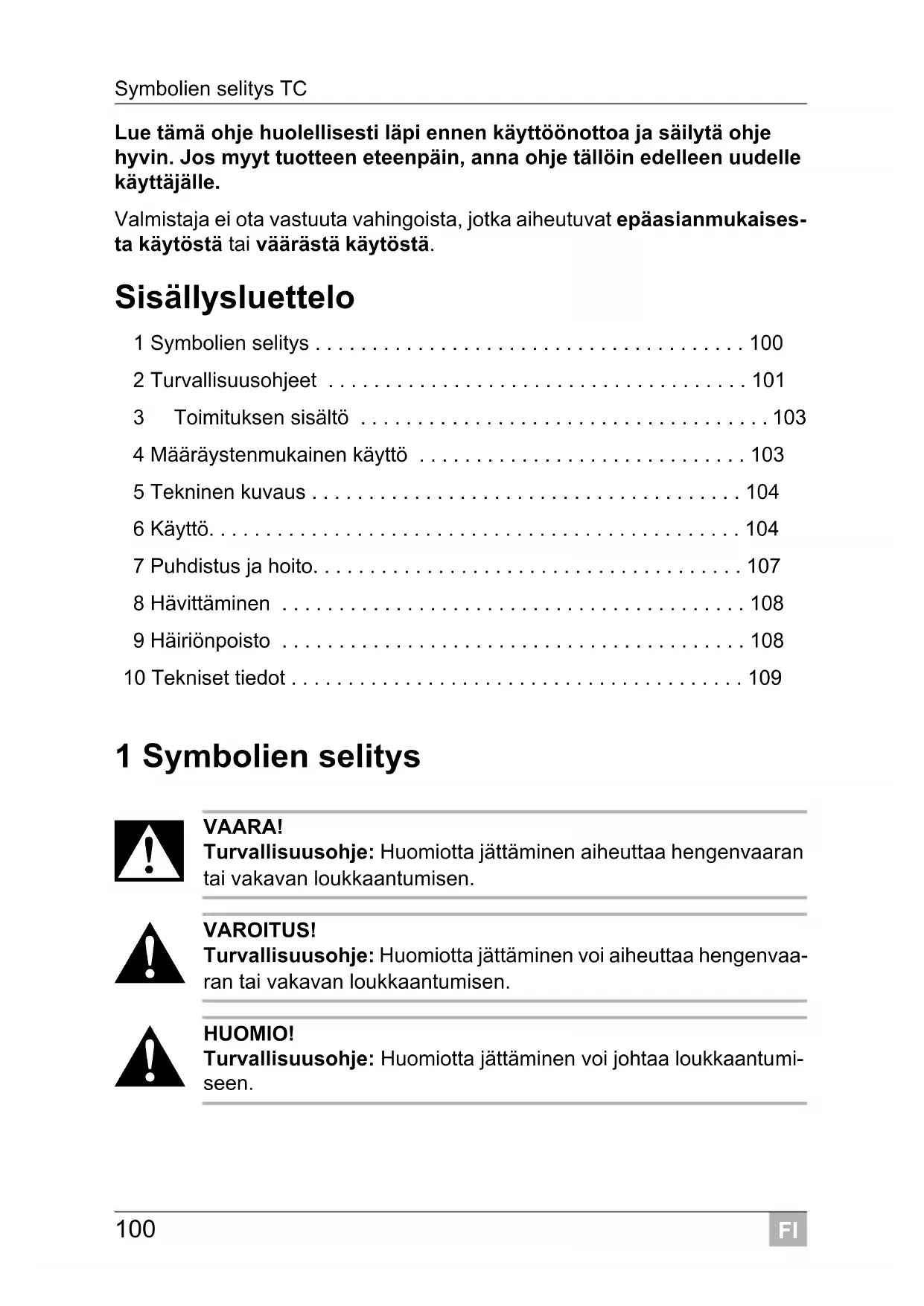 HUOMIO! Turvallisuusohje: Huomiotta jättäminen voi johtaa loukkaantumi- seen.FI TC Turvallisuusohjeet