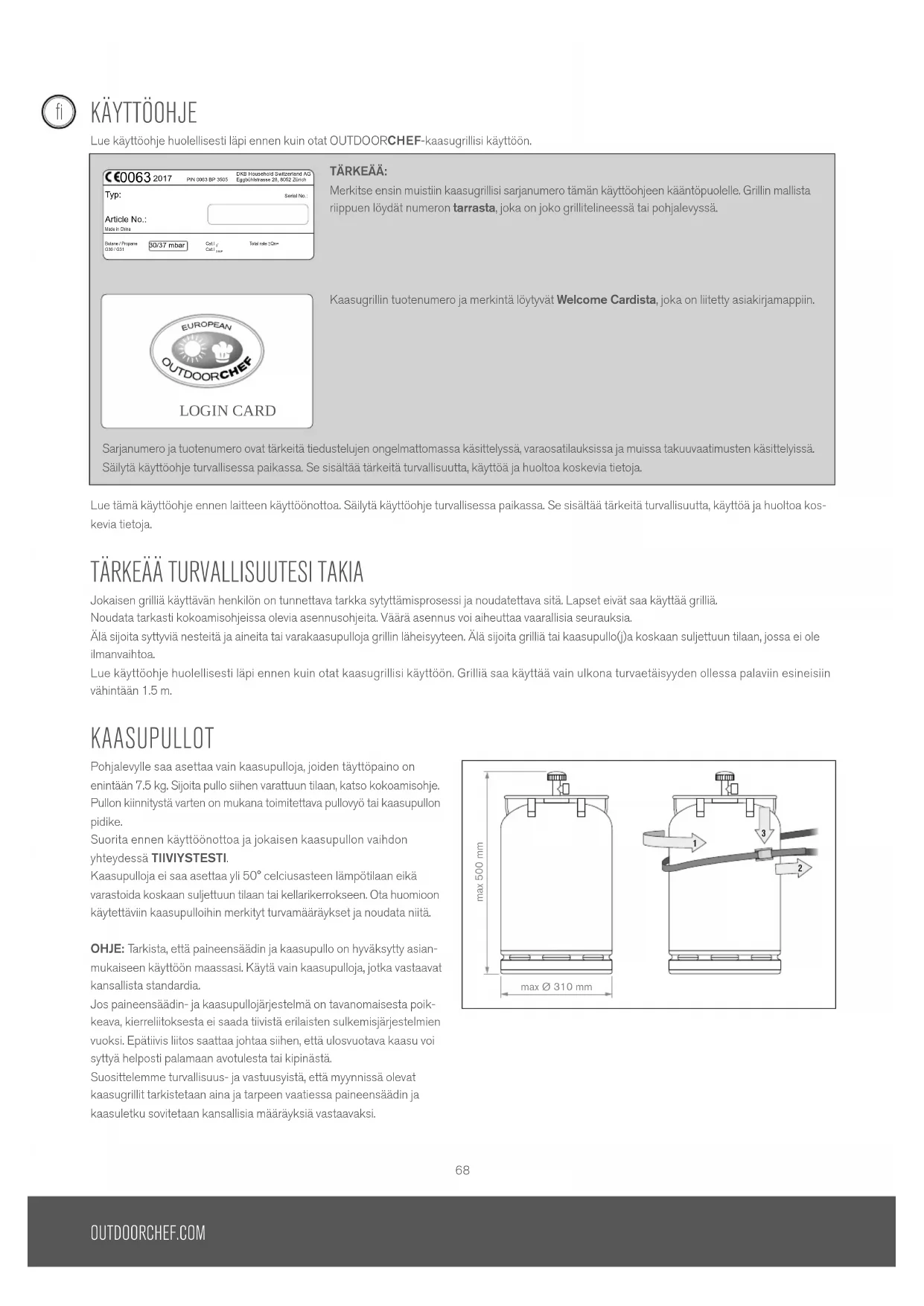Jokaisen grilliä käyttävän henkilön on tunnettava tarkka sytyttämisprosessi ja noudatettava sitä. Lapset eivät saa käyttää grilliä. Noudata tarkasti kokoamisohjeissa olevia asennusohjeita. Väärä asennus voi aiheuttaa vaarallisia seurauksia. Älä sijoita syttyviä nesteitä ja aineita tai varakaasupulloja grillin läheisyyteen. Älä sijoita grilliä tai kaasupullo(j)a koskaan suljettuun tilaan, jossa ei ole ilmanvaihtoa. Lue käyttöohje huolellisesti läpi ennen kuin otat kaasugrillisi käyttöön. Grilliä saa käyttää vain ulkona turvaetäisyyden ollessa palaviin esineisiin vähintään 1.5 m. KAASUPULLOT Pohjalevylle saa asettaa vain kaasupulloja, joiden täyttöpaino on enintään 7.5 kg. Sijoita pullo siihen varattuun tilaan, katso kokoamisohje. Pullon kiinnitystä varten on mukana toimitettava pullovyö tai kaasupullon pidike.Suorita ennen käyttöönottoa ja jokaisen kaasupullon vaihdon yhteydessä TIIVIYSTESTI.Kaasupulloja ei saa asettaa yli 50° celciusasteen lämpötilaan eikä varastoida koskaan suljettuun tilaan tai kellarikerrokseen. Ota huomioon käytettäviin kaasupulloihin merkityt turvamääräykset ja noudata niitä. OHJE: Tarkista, että paineensäädin ja kaasupullo on hyväksytty asian- mukaiseen käyttöön maassasi. Käytä vain kaasupulloja, jotka vastaavat kansallista standardia.Jos paineensäädin- ja kaasupullojärjestelmä on tavanomaisesta poik-keava, kierreliitoksesta ei saada tiivistä erilaisten sulkemisjärjestelmien vuoksi. Epätiivis liitos saattaa johtaa siihen, että ulosvuotava kaasu voi syttyä helposti palamaan avotulesta tai kipinästä.Suosittelemme turvallisuus- ja vastuusyistä, että myynnissä olevat kaasugrillit tarkistetaan aina ja tarpeen vaatiessa paineensäädin ja kaasuletku sovitetaan kansallisia määräyksiä vastaavaksi.max 500 mmmax Ø 310 mm