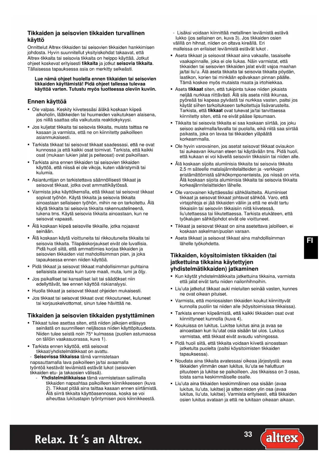 Tikkaiden ja seisovien tikkaiden turvallinen käyttö Onnittelut Altrex-tikkaiden tai seisovien tikkaiden hankkimisen johdosta. Hyvin suunnitellut yksityiskohdat takaavat, että Altrex-tikkaita tai seisovia tikkaita on helppo käyttää. Jotkut ohjeet koskevat erityisesti tikkaita ja jotkut seisovia tikkaita. Tällaisessa tapauksessa asia on merkitty selkeästi. Lue nämä ohjeet huolella ennen tikkaiden tai seisovien tikkaiden käyttämistä! Pidä ohjeet tallessa tulevaa käyttöä varten. Tutustu myös tuotteessa oleviin kuviin. Ennen käyttöä Ole valpas. Keskity kiivetessäsi äläkä koskaan kiipeä alkoholin, lääkkeiden tai huumeiden vaikutuksen alaisena, jos niillä saattaa olla vaikutusta reaktiokykyysi. Jos kuljetat tikkaita tai seisovia tikkaita, muista taittaa ne kasaan ja varmista, että ne on kiinnitetty paikoilleen asianmukaisesti. Tarkista tikkaat tai seisovat tikkaat saadessasi, että ne ovat kunnossa ja että kaikki osat toimivat. Tarkista, että kaikki osat (mukaan lukien jalat ja peiteosat) ovat paikoillaan. Tarkista aina ennen tikkaiden tai seisovien tikkaiden käyttöä, että niissä ei ole vikoja, kuten vääristymiä tai kulumia. Asiantuntijan on tarkistettava säännöllisesti tikkaat ja seisovat tikkaat, jotka ovat ammattikäytössä. Varmista joka käyttökerralla, että tikkaat tai seisovat tikkaat sopivat työhön. Käytä tikkaita ja seisovia tikkaita ainoastaan sellaiseen työhön, mihin ne on tarkoitettu. Älä käytä tikkaita tai seisovia tikkaita rakennustelineenä, tukena tms. Käytä seisovia tikkaita ainoastaan, kun ne seisovat vapaasti. Älä koskaan kiipeä seisoville tikkaille, jotka nojaavat seinään. Älä koskaan käytä vioittuneita tai rikkoutuneita tikkaita tai seisovia tikkaita. Tilapäiskorjaukset eivät ole luvallisia. Pidä huoli siitä, että ammattimies korjaa tikkaiden ja seisovien tikkaiden viat mahdollisimman pian, ja joka tapauksessa ennen niiden käyttöä. Pidä tikkaat ja seisovat tikkaat mahdollisimman puhtaina sellaisista aineista kuin tuore maali, muta, lumi ja öljy. Jos paikalliset tai kansalliset lait tai säädökset niin edellyttävät, tee ennen käyttöä riskianalyysi. Huolla tikkaat ja seisovat tikkaat ohjeiden mukaisesti. Jos tikkaat tai seisovat tikkaat ovat rikkoutuneet, kuluneet tai korjauskelvottomat, sinun tulee hävittää ne. Tikkaiden ja seisovien tikkaiden pystyttäminen Tikkaat tulee asettaa siten, että niiden jalkojen etäisyys seinästä on suunnilleen neljäsosa niiden käyttöpituudesta. Niiden tulee seistä noin 75° kulmassa (puolien astumaosa on tällöin vaakasuorassa, kuva 1). Tarkista ennen käyttöä, että seisovat tikkaat/yhdistelmätikkaat on avattu. - Seisovissa tikkaissa tämä varmistetaan napsauttamalla lava paikoilleen ja/tai avaamalla työntöä kestävät leviämistä estävät lukot (seisovien tikkaiden etu- ja takaosien välissä). - Yhdistelmätikkaissa tämä varmistetaan sallimalla tikkaiden napsahtaa paikoilleen kiinnikkeeseen (kuva 2). Tikkaat pitää aina taittaa kasaan ennen siirtämistä. Älä siirrä tikkaita käyttöasennossa, koska se voi aiheuttaa lukitustapin työntymisen pois kiinnikkeestä.