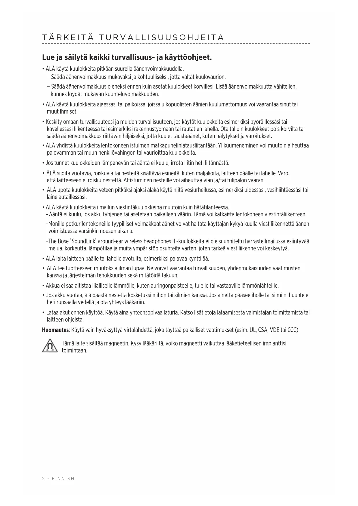 Bose Corporation vakuuttaa täten, että tämä tuote täyttää direktiivin 2014/53/EU sekä muiden sovellettavien EU-direktiivien vaatimukset. Täydellinen vaatimustenmukaisuusvakuutus on osoitteessa www.Bose.com/compliance. Eurooppa: Käytön taajuusalue 2 400–2 483,5 MHz. Bluetooth: Enimmäislähetysteho alle 20 dBm EIRP. Bluetooth Low Energy: Suurin tehospektritiheys alle 10 dBm/MHz EIRP. Tämä symboli merkitsee, että tuotetta ei saa hävittää kotitalousjätteen mukana, vaan se on toimitettava kierrätykseen. Kierrättäminen auttaa estämään vahingollisia seurauksia ympäristölle, luonnolle ja ihmisten terveydelle. Saat lisätietoja kierrättämisestä paikallisilta viranomaisilta, kotitalousjätteen kierrätyspalvelusta tai liikkeestä, josta tuote ostettiin. Hävitä käytetyt akut ja paristot paikallisten viranomaisten ohjeiden mukaisesti. Ei saa polttaa. Vain pätevä ammattilainen saa irrottaa ladattavan litiumioniakun tästä laitteesta. Lisätietoja saat paikalliselta Bose-jälleenmyyjältä tai osoitteesta products.bose.com/static/compliance/index.html. Huomautus: Tämä laite on testattu ja todettu luokan B digitaalilaitetta koskevien FCC:n sääntöjen osan 15 rajoitusten mukaiseksi. Nämä rajoitukset on tarkoitettu antamaan kohtuullinen suoja haitallisia häiriöitä vastaan kotioloissa. Tämä laite tuottaa, käyttää ja voi säteillä energiaa radiotaajuudella, ja jos sitä ei ole asennettu tai käytetä ohjeiden mukaan, sevoi aiheuttaa vahingollista häiriötä radioliikenteelle. Kuitenkaan ei voida taata, ettei missään yksittäisessä asennuksessa aiheutuisi häiriöitä. Jos tämä laite aiheuttaa radio- tai televisiovastaanotossa häiriöitä, jotka ovat helposti todettavissa kytkemällä laitteeseen virta ja sammuttamalla se, käyttäjän tulisi yrittää poistaa häiriöt seuraavilla toimenpiteillä: