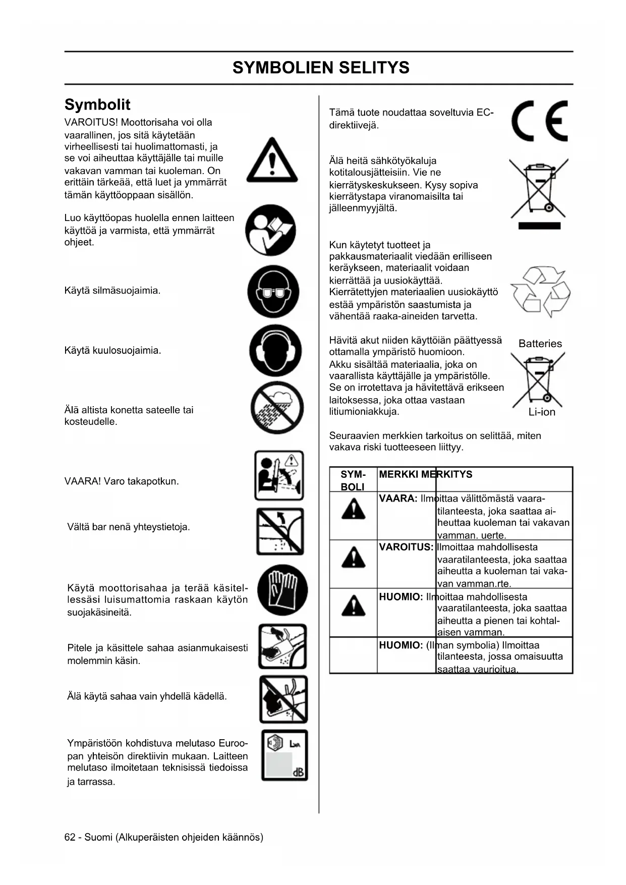 Terälevy ja ketju kuumenevat ja savuavat. Tarkista, että teräketju ei ole liian kireällä. Kiristä teräketju. Viittaa sivulle 12. Öljysäiliössä ei ole öljyä. Täytä öljysäiliö öljyllä. Roskat ovat tukkineet poistoaukon. Irrota terälevy ja poista roskat käyttöoppaan ohjeiden mukaisesti. Roskat tukkivat öljysäiliön. Puhdista öljysäiliö ja täytä se puhtaalla öljyllä. Roskat tukkivat terälevyn ja teräketjun öljysäiliön korkin. Poista roskat öljysäiliön päältä. Roskat tukkivat ketjupyörän tai ohjauspyörät. Puhdista ja poista roskat ketjupyörästä ja ohjauspyöristä. Moottori käy, mutta ketju ei pyöri. Teräketju on liian kireällä. Viittaa kohtaan Teräketjun kireysopas aiemmin tässä käyttöoppaassa. Tarkista terälevy ja teräketju. Viittaa sivulle 12. Tarkista terälevy ja teräketju vaurioiden varalta. Irrota akku laitteesta. Irrota terälevyn suojus ja irrota terälevy ja teräketju. Puhdista roskat moottorisahasta. Kun roskat on poistettu, kytke akku ja käytä moottorisahaa. Jos ketjupyörä pyörii, moottori on kunnossa. Jos ketjupyörä ei pyöri, soita asiakaspalveluun. Moottori käy, ketju pyörii mutta se ei leikkaa. Tylsä ketju. Teroita tai vaihda teräketju. Ketju on asennettu takoperin. Viittaa kohtaan Terälevy- ja teräketjukokoonpanon vaihtaminen aiemmin tässä käyttöoppaassa. Ketju saattaa olla liian kireällä tai liian löysällä. Viittaa kohtaan Teräketjun kireyden säätö tässä käyttöoppaassa. Moottorisaha ei käynnisty. Ketjujarru on päällä. Vedä ketjujarrua itseäsi kohti, kunnes se vapautuu. Moottorisahan ja akun välillä ei ole sähkökontaktia. Muista akkua kiinnittäessäsi napsauttaa akkutilan päällä olevat salvat paikoilleen. Akku on tyhjä. Lataa akku. Lukitusvipua ja liipaisinta ei paineta samanaikaisesti. Paina lukitusvipu alas ja pidä sitä painettuna ja paina sitten liipaisinta käynnistääksesi moottorisahan. Akku ja sähkötyökalu ovat liian kuumia tai liian kylmiä. Viittaa akun ja laturin huoltokappaleeseen tässä käyttöoppaassa. Moottori käy mutta saha leikkaa epätavallisesti. Moottori sammuu noin 3 sekunnin kuluttua. Lataa akku. Jos laite sammuu ja piippaa sahaamisen aikana, se on siirtynyt suojaustilaan. Tämä suojaa piirilevyä vaurioilta. Vapauta liipaisin ja käynnistä moottorisaha uudelleen. Anna moottorisahan tehdä työ äläkä pakota sitä leikkaamaan. Akku ei ole ladattu. Lataa akku. Asianmukainen latausmenettely on kuvattu akun ja laturin käyttöoppaassa. Teräketju vaatii voitelua, ja kitka kasvaa, jos sitä ei huolleta asianmukaisesti. Pidä ketju aina voideltuna varmistamalla, että terälevyn ja ketjun öljy ei koskaan pääse liian vähiin. Akun säilytyslämpötila ei ole oikea. Anna akun jäähtyä huoneenlämpötilaan.76 - Suomi (Alkuperäisten ohjeiden käännös) TEKNISET TIEDOT Tekniset tiedot Tyyppi Johdoton, akkukäyttöinen Akku Li 402A Laturi Li 40CGR Latausaika 60 min. Terälevyn pituus 356 mm Ketjujako 9.5 mm Ketjun leveys 1.09 mm Ketjutyyppi 90PX052X Terälevytyyppi 144MLEA041 Ketjun öljysäiliön tilavuus 0.09L Laitteen paino (ilman akkua) 3.8 kg Laitteen paino (akun kanssa) 4.7 kg EC-SÄÄNNÖSTEN NOUDATTAMINEN (koskee vain Eurooppaa) Valmistaja:Changzhou Globe Co., Ltd. Osoite: No. 65 Xinggang Rd., Zhonglou Zone, Changzhou, Jiangsu, China Sen henkilön nimi ja osoite, jolla on lupa koota tekninen tiedosto: Nimi: Gary Gao Naixin (Ulkokäyttökoneiden osaston päällikkö) Osoite: Greenworks Tools Europe GmbH, Wankelstrasse 40. 50996 Koln Germany Ilmoitamme täten, että tuote Luokka ................................................................................................... JOHDOTON MOOTTORISAHA Malli................................................................................................................................................Li 40CS Sarjanumero ................................................................................................. Viittaa tuotteen nimikilpeen Valmistusvuosi ...............................................................................................Viittaa tuotteen nimikilpeen ■ noudattaa konedirektiivin (2006/42/EC) asianmukaisia edellytyksiä ■ noudattaa seuraavien EC-direktiivien edellytyksiä: EMC-direktiivi (2014/30/EU), Meludirektiivi (2000/14/EC muunnettu direktiivillä 2005/88/EC). RoHS-direktiivi 2011/65/EC Ilmoitamme edelleen, että ■ olemme käyttäneet seuraavia eurooppalaisia yhdenmukaisia standardeja (osittain/lauseittain): EN 60745-1, EN 60745-2-13, EN 55014-1, EN 55014-2, EN ISO 3744 Mitattu äänenteho LWA: 102.7 dB(A) Taattu äänenteho 106 dB(A) Säännösten noudattaminen tarkastettu direktiivin 2000/14/EC liitteen V mukaisesti EC-tyyppisen tarkastussertikaatin numero: XXXXXXXX, julkaissut Intertek Deutschland GmbH(ilmoittava elin 0905). Paikka, päiväys: Changzhou, 22/07/2016 Allekirjoitus: Gary Gao Naixin (BEng, CEng, MIET) Varapresidentti, SuunnitteluosastoDeutsch (Übersetzung der originalen anleitungen) - 77 SYMBOLERKLÄRUNG Symbole WARNUNG! Eine Kettensäge kann gefährlich sein, und schwere oder sogar tödliche Verletzungen des Benutzers oder anderer Personen verursachen, wenn sie falsch oder fahrlässig benutzt wird. Es ist äußerst wichtig, dass Sie den Inhalt dieser Bedienungsanleitung lesen und verstehen. Bitte lesen Sie die Bedienungsanleitung sorgfältig und stellen sicher, dass Sie die Anweisungen verstehen, bevor Sie die Maschine benutzen. Tragen Sie einen Augenschutz. Tragen Sie einen Gehörschutz. Nicht Regen oder feuchten Bedingungen aussetzen. ACHTUNG! Hüten Sie sich vor Rückschlag. Vermeiden Sie Bar-Nase-Kontakt. Tragen Sie rutschfeste, strapazierfähige Handschuhe, wenn Sie diese Kettensäge bedienen. Halten und bedienen Sie die Kettensäge mit beiden Händen. Bedienen Sie die Kettensäge nicht mit nur einer Hand. Geräuschemissionen gemäß Richtlinie der Europäischen Gemeinschaft. Die Emission der Maschine wird in dem Kapi- tel Tech