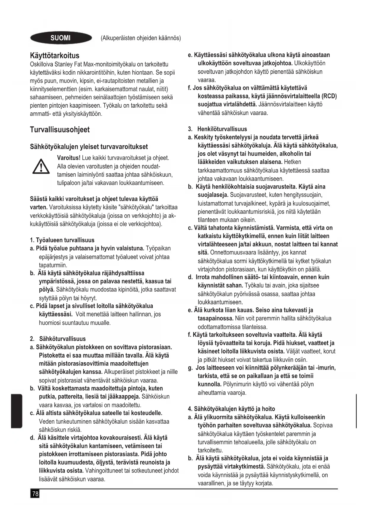 (Alkuperäisten ohjeiden käännös) SUOMI Käyttötarkoitus Oskilloiva Stanley Fat Max-monitoimityökalu on tarkoitettu käytettäväksi kodin nikkarointitöihin, kuten hiontaan. Se sopii myös puun, muovin, kipsin, ei-rautapitoisten metallien ja kiinnityselementtien (esim. karkaisemattomat naulat, niitit) sahaamiseen, pehmeiden seinälaattojen työstämiseen sekä pienten pintojen kaapimiseen. Työkalu on tarkoitettu sekä ammatti- että yksityiskäyttöön. Turvallisuusohjeet Sähkötyökalujen yleiset turvavaroitukset