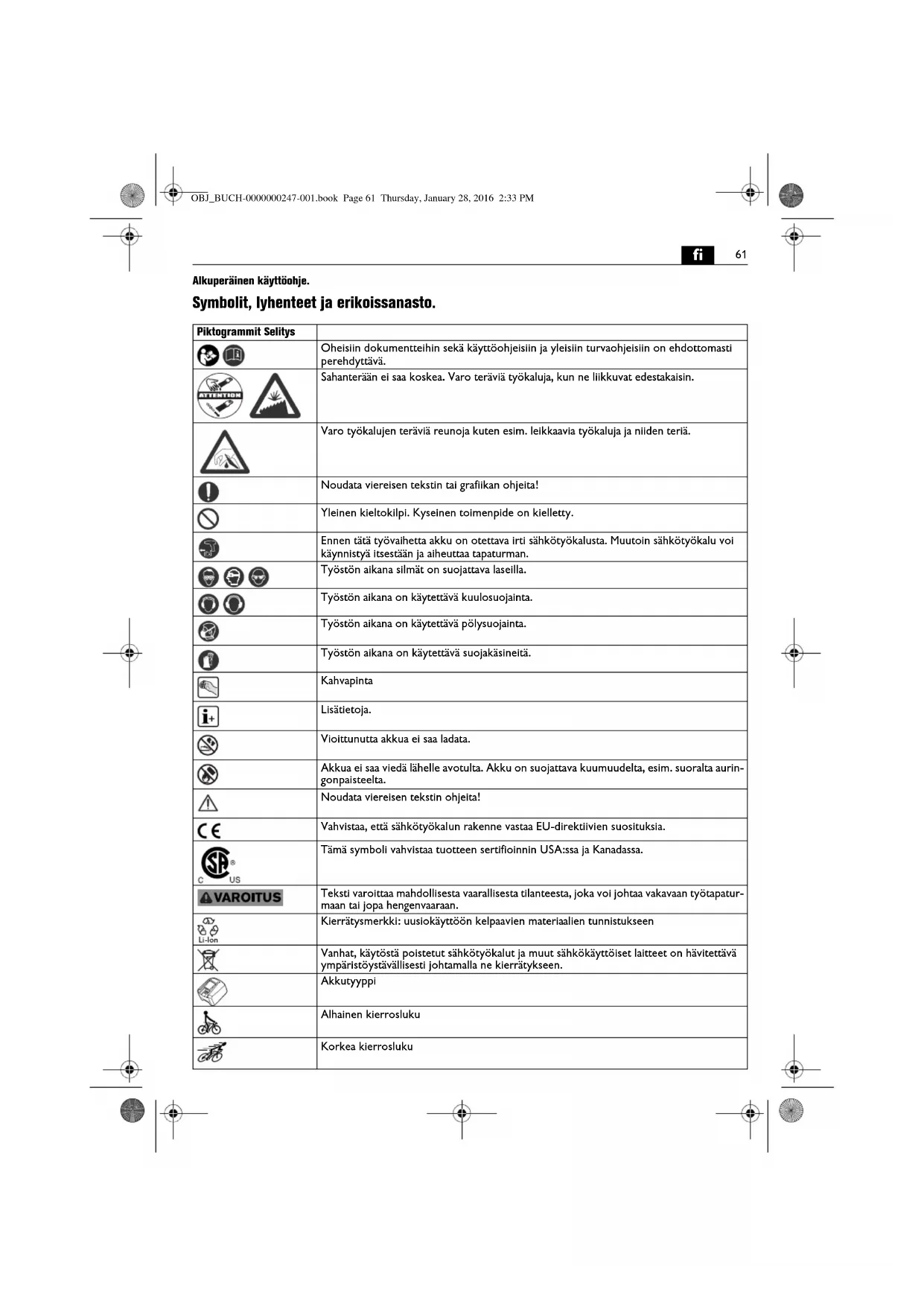 Alkuperäinen käyttöohje. Symbolit, lyhenteet ja erikoissanasto. Piktogrammit Selitys Oheisiin dokumentteihin sekä käyttöohjeisiin ja yleisiin turvaohjeisiin on ehdottomasti perehdyttävä. Sahanterään ei saa koskea. Varo teräviä työkaluja, kun ne liikkuvat edestakaisin. Varo työkalujen teräviä reunoja kuten esim. leikkaavia työkaluja ja niiden teriä. Noudata viereisen tekstin tai grafiikan ohjeita! Yleinen kieltokilpi. Kyseinen toimenpide on kielletty. Ennen tätä työvaihetta akku on otettava irti sähkötyökalusta. Muutoin sähkötyökalu voi käynnistyä itsestään ja aiheuttaa tapaturman. Työstön aikana silmät on suojattava laseilla. Työstön aikana on käytettävä kuulosuojainta. Työstön aikana on käytettävä pölysuojainta. Työstön aikana on käytettävä suojakäsineitä. Kahvapinta Lisätietoja. Vioittunutta akkua ei saa ladata. Akkua ei saa viedä lähelle avotulta. Akku on suojattava kuumuudelta, esim. suoralta aurin- gonpaisteelta. Noudata viereisen tekstin ohjeita! Vahvistaa, että sähkötyökalun rakenne vastaa EU-direktiivien suosituksia. Tämä symboli vahvistaa tuotteen sertifioinnin USA:ssa ja Kanadassa. Teksti varoittaa mahdollisesta vaarallisesta tilanteesta, joka voi johtaa vakavaan työtapatur- maan tai jopa hengenvaaraan. Kierrätysmerkki: uusiokäyttöön kelpaavien materiaalien tunnistukseen Vanhat, käytöstä poistetut sähkötyökalut ja muut sähkökäyttöiset laitteet on hävitettävä ympäristöystävällisesti johtamalla ne kierrätykseen. Akkutyyppi Alhainen kierrosluku Korkea kierrosluku OBJ_BUCH-0000000247-001.book Page 61 Thursday, January 28, 2016 2:33 PM62