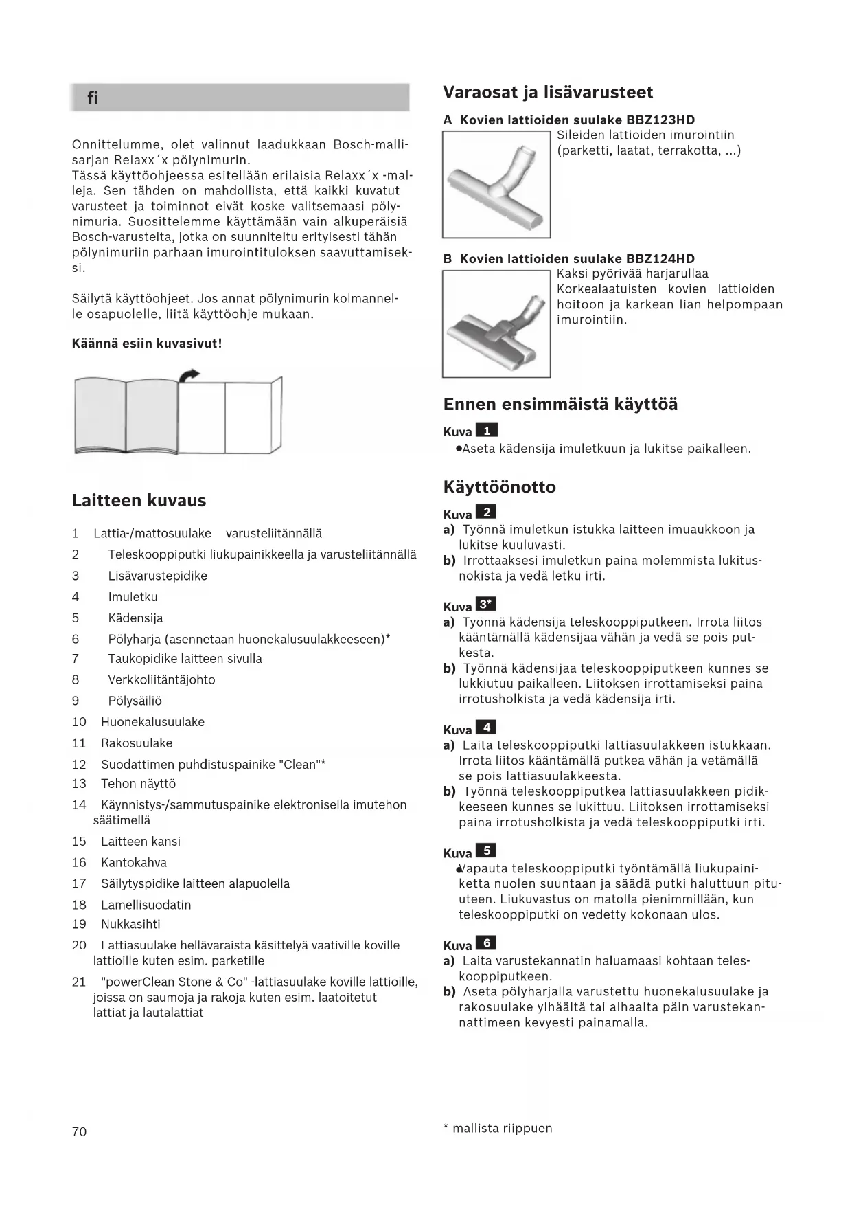 Obs! Använd inte skurmedel, fönsterputs eller all- rent. Sänk aldrig ner dammsugaren i vatten. Med förbehåll för tekniska ändringar.70 Onnittelumme, olet valinnut laadukkaan Bosch-malli- sarjan Relaxx´x pölynimurin. Tässä käyttöohjeessa esitellään erilaisia Relaxx´x -mal- leja. Sen tähden on mahdollista, että kaikki kuvatut varusteet ja toiminnot eivät koske valitsemaasi pöly- nimuria. Suosittelemme käyttämään vain alkuperäisiä Bosch-varusteita, jotka on suunniteltu erityisesti tähän pölynimuriin parhaan imurointituloksen saavuttamisek- si. Säilytä käyttöohjeet. Jos annat pölynimurin kolmannel- le osapuolelle, liitä käyttöohje mukaan. Käännä esiin kuvasivut! Laitteen kuvaus 1 Lattia-/mattosuulake varusteliitännällä 2 Teleskooppiputki liukupainikkeella ja varusteliitännällä 3 Lisävarustepidike 4 Imuletku 5 Kädensija 6 Pölyharja (asennetaan huonekalusuulakkeeseen)* 7 Taukopidike laitteen sivulla 8 Verkkoliitäntäjohto 9 Pölysäiliö 10 Huonekalusuulake 11 Rakosuulake 12 Suodattimen puhdistuspainike "Clean"* 13 Tehon näyttö 14 Käynnistys-/sammutuspainike elektronisella imutehon säätimellä 15 Laitteen kansi 16 Kantokahva 17 Säilytyspidike laitteen alapuolella 18 Lamellisuodatin 19 Nukkasihti 20 Lattiasuulake hellävaraista käsittelyä vaativille koville lattioille kuten esim. parketille 21 "powerClean Stone & Co" -lattiasuulake koville lattioille, joissa on saumoja ja rakoja kuten esim. laatoitetut lattiat ja lautalattiat Varaosat ja lisävarusteet A Kovien lattioiden suulake BBZ123HD Sileiden lattioiden imurointiin (parketti, laatat, terrakotta, ...) B Kovien lattioiden suulake BBZ124HD Kaksi pyörivää harjarullaa Korkealaatuisten kovien lattioiden hoitoon ja karkean lian helpompaan imurointiin. Ennen ensimmäistä käyttöä Kuva