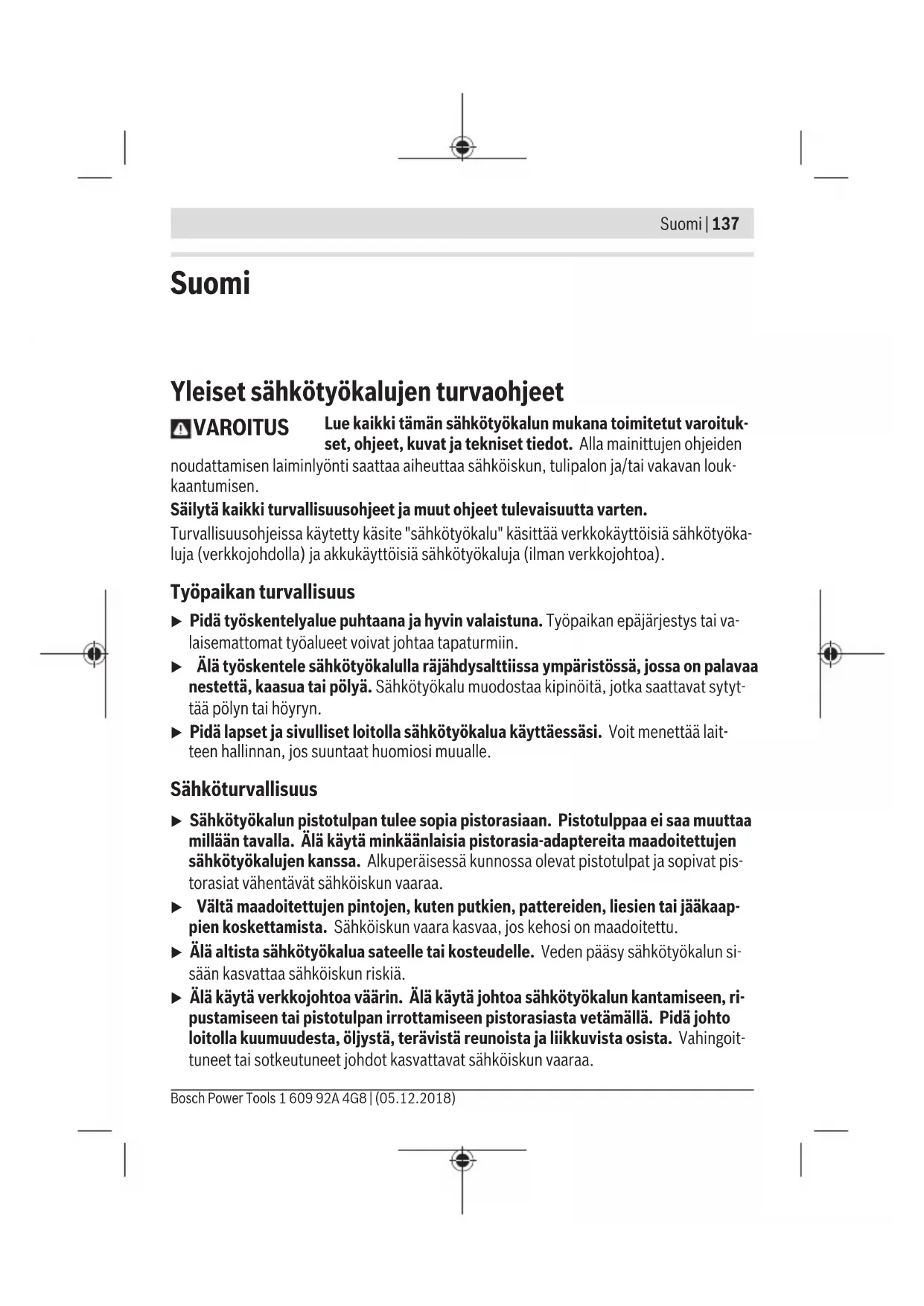 -kontakten (8) er lukket under drift. Slik unngår du at støv trenger inn. Stille inn driftsmåte Ønsket driftsmodus kan stilles inn med bryteren for driftsmodus (3). Sett bryteren på ønsket driftsmodus. Symbol Driftsmodus Skruing = høyrerotasjon + 1. gir Boring = høyrerotasjon + 2. gir R = venstrerotasjon + 1. gir Inn-/utkobling For å slå på elektroverktøyet trykker du på av/på-bryteren (4) og holder den inne. For å slå av elektroverktøyet slipper du av/på-bryteren (4). Service og vedlikehold Vedlikehold og rengjøring u Ta alltid batteriet ut av elektroverktøyet før arbeider på elektroverktøyet utføres (f.eks. vedlikehold, verktøyskifte osv.) og før transport og oppbevaring. Det er fare for skader hvis du trykker på av/på-bryteren ved en feiltagelse. u Hold selve elektroverktøyet og ventilasjonsslissene alltid rene, for å kunne arbeide bra og sikkert. Kundeservice og kundeveiledning Kundeservice hjelper deg ved spørsmål om reparasjon og vedlikehold av produktet ditt og reservedelene. Du finner også sprengskisser og informasjon om reservedeler på www.bosch-pt.com Bosch Power Tools 1 609 92A 4G8 | (05.12.2018)136 | Norsk Boschs kundeveilederteam hjelper deg gjerne hvis du har spørsmål om våre produkter og tilbehør. Ved alle forespørsler og reservedelsbestillinger må du oppgi det 10‑sifrede produktnummeret som er angitt på produktets typeskilt. Norsk Robert Bosch AS Postboks 350 1402 Ski Tel.: 64 87 89 50 Faks: 64 87 89 55 Transport Li-ion-batteriene i verktøyet underligger kravene for farlig gods. Batteriene kan transporteres på veier av brukeren uten ytterligere krav. Ved forsendelse gjennom tredje personer (f.eks.: lufttransport eller spedisjon) må det oppfylles spesielle krav til emballasje og merking. Du må konsultere en ekspert for farlig gods ved forberedelse av forsendelsen. Send batterier kun hvis huset ikke er skadet. Lim igjen de åpne kontaktene og pakk batteriet slik at det ikke beveger seg i emballasjen. Ta også hensyn til videreførende nasjonale forskrifter. Deponering Elektroverktøy, batterier, tilbehør og emballasje må leveres inn til miljøvennlig gjenvinning. Elektroverktøy og batterier må ikke kastes i vanlig søppel! Bare for land i EU: Iht. det europeiske direktivet 2012/19/EU om brukt elektrisk utstyr og iht. det europeiske direktivet 2006/66/EC må defekte eller brukte batterier/oppladbare batterier samles adskilt og leveres inn for miljøvennlig resirkulering. (Oppladbare) batterier: Li-ion: Se informasjonen i avsnittet Transport (se „Transport“, Side136). 1 609 92A 4G8 | (05.12.2018) Bosch Power ToolsSuomi | 137 Suomi Yleiset sähkötyökalujen turvaohjeet VAROITUS Lue kaikki tämän sähkötyökalun mukana toimitetut varoituk- set, ohjeet, kuvat ja tekniset tiedot. Alla mainittujen ohjeiden noudattamisen laiminlyönti saattaa aiheuttaa sähköiskun, tulipalon ja/tai vakavan louk- kaantumisen. Säilytä kaikki turvallisuusohjeet ja muut ohjeet tulevaisuutta varten. Turvallisuusohjeissa käytetty käsite "sähkötyökalu" käsittää verkkokäyttöisiä sähkötyöka- luja (verkkojohdolla) ja akkukäyttöisiä sähkötyökaluja (ilman verkkojohtoa). Työpaikan turvallisuus u Pidä työskentelyalue puhtaana ja hyvin valaistuna. Työpaikan epäjärjestys tai va- laisemattomat työalueet voivat johtaa tapaturmiin. u Älä työskentele sähkötyökalulla räjähdysalttiissa ympäristössä, jossa on palavaa nestettä, kaasua tai pölyä. Sähkötyökalu muodostaa kipinöitä, jotka saattavat sytyt- tää pölyn tai höyryn. u Pidä lapset ja sivulliset loitolla sähkötyökalua käyttäessäsi. Voit menettää lait- teen hallinnan, jos suuntaat huomiosi muualle. Sähköturvallisuus u Sähkötyökalun pistotulpan tulee sopia pistorasiaan. Pistotulppaa ei saa muuttaa millään tavalla. Älä käytä minkäänlaisia pistorasia-adaptereita maadoitettujen sähkötyökalujen kanssa. Alkuperäisessä kunnossa olevat pistotulpat ja sopivat pis- torasiat vähentävät sähköiskun vaaraa. u Vältä maadoitettujen pintojen, kuten putkien, pattereiden, liesien tai jääkaap- pien koskettamista. Sähköiskun vaara kasvaa, jos kehosi on maadoitettu. u Älä altista sähkötyökalua sateelle tai kosteudelle. Veden pääsy sähkötyökalun si- sään kasvattaa sähköiskun riskiä. u Älä käytä verkkojohtoa väärin. Älä käytä johtoa sähkötyökalun kantamiseen, ri- pustamiseen tai pistotulpan irrottamiseen pistorasiasta vetämällä. Pidä johto loitolla kuumuudesta, öljystä, terävistä reunoista ja liikkuvista osista. Vahingoit- tuneet tai sotkeutuneet johdot kasvattavat sähköiskun vaaraa. Bosch Power Tools 1 609 92A 4G8 | (05.12.2018)138 | Suomi u Käyttäessäsi sähkötyökalua ulkona käytä ainoastaan ulkokäyttöön soveltuvaa jatkojohtoa. Ulkokäyttöön soveltuvan jatkojohdon käyttö pienentää sähköiskun vaa- raa. u Jos sähkötyökalua on pakko käyttää kosteassa ympäristössä, on käytettävä vi- kavirtasuojakytkintä. Vikavirtasuojakytkimen käyttö vähentää sähköiskun vaaraa. Henkilöturvallisuus u Ole valpas, kiinnitä huomiota työskentelyysi ja noudata tervettä järkeä sähkö- työkalua käyttäessäsi. Älä käytä mitään sähkötyökalua, jos olet väsynyt tai huu- meiden, alkoholin tai lääkkeiden vaikutuksen alaisena. Hetken tarkkaamattomuus sähkötyökalua käytettäessä saattaa johtaa vakavaan loukkaantumiseen. u Käytä henkilökohtaisia suojavarusteita. Käytä aina suojalaseja. Henkilökohtai- sen suojavarustuksen (esim. pölynaamari, luistamattomat turvajalkineet, suojakypärä tai kuulonsuojaimet kulloisenkin tehtävän mukaan) käyttö vähentää loukkaantumisris- kiä. u Estä tahaton käynnistyminen. Varmista, että käynnistyskytkin on kytketty pois päältä ennen kuin yhdistät työkalun sähköverkkoon ja/tai akkuun, otat työkalun käteen tai kannat sitä. Jos kannat sähkötyökalua sormi käynnistyskytkimellä tai kyt- ket sähkötyökalun pistotulpan pi