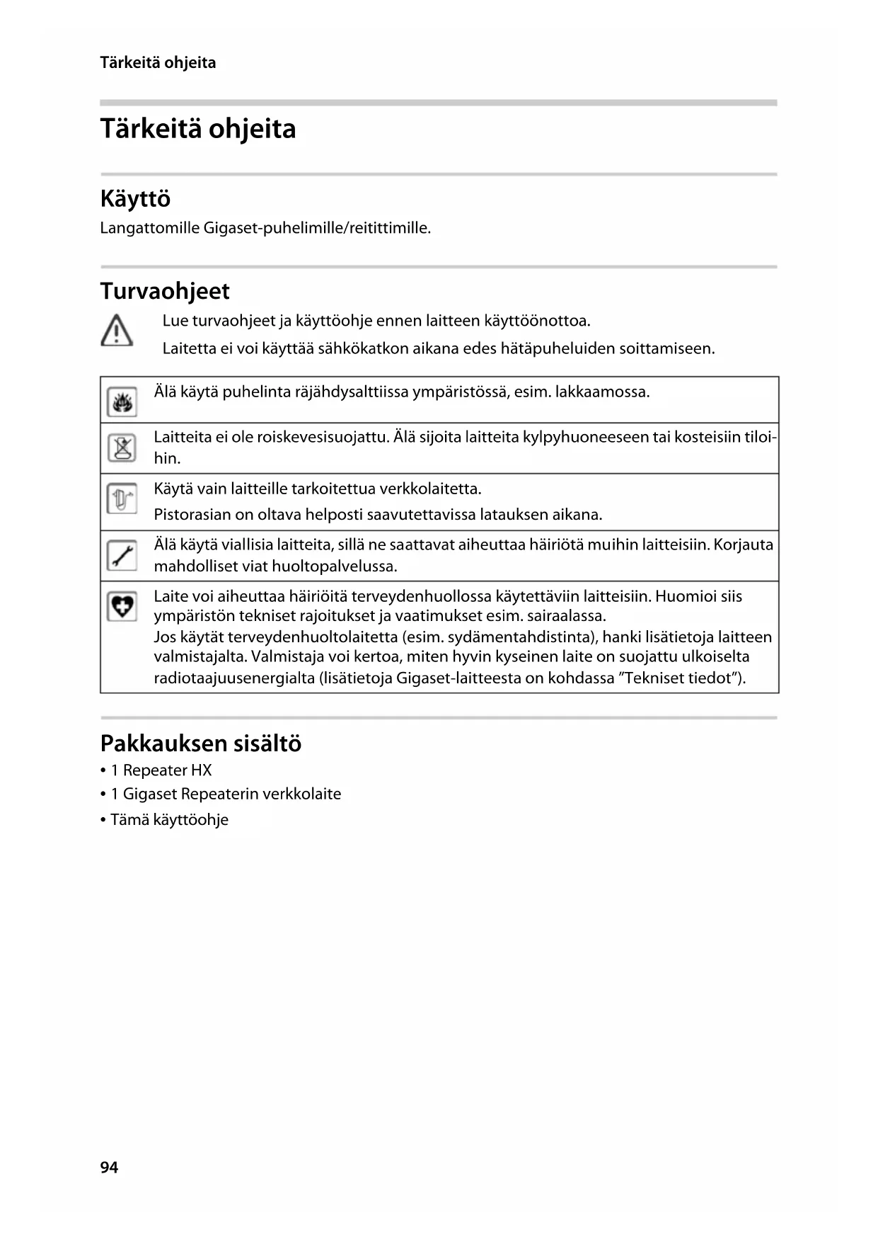- Tämä käyttöohje Lue turvaohjeet ja käyttöohje ennen laitteen käyttöönottoa. Laitetta ei voi käyttää sähkökatkon aikana edes hätäpuheluiden soittamiseen. Älä käytä puhelinta räjähdysalttiissa ympäristössä, esim. lakkaamossa. Laitteita ei ole roiskevesisuojattu. Älä sijoita laitteita kylpyhuoneeseen tai kosteisiin tiloi- hin. Käytä vain laitteille tarkoitettua verkkolaitetta. Pistorasian on oltava helposti saavutettavissa latauksen aikana. Älä käytä viallisia laitteita, sillä ne saattavat aiheuttaa häiriötä muihin laitteisiin. Korjauta mahdolliset viat huoltopalvelussa. Laite voi aiheuttaa häiriöitä terveydenhuollossa käytettäviin laitteisiin. Huomioi siis ympäristön tekniset rajoitukset ja vaatimukset esim. sairaalassa. Jos käytät terveydenhuoltolaitetta (esim. sydämentahdistinta), hanki lisätietoja laitteen valmistajalta. Valmistaja voi kertoa, miten hyvin kyseinen laite on suojattu ulkoiselta radiotaajuusenergialta (lisätietoja Gigaset-laitteesta on kohdassa ”Tekniset tiedot”).95 Repeater HX / ALL IM fi / A31008-N603-R101-1-SU19 / Grep-fin_HX.fm / 3/28/19 Template Go, Version 1, 01.07.2014 / ModuleVersion 1.0 Johdanto SUOMI Johdanto Gigaset Repeaterilla voit laajentaa tukiaseman kuuluvuusaluetta. Voit liittää jopa kuusi Gigaset Repeateria yhtä aikaa yhteen tukiasemaan. Lukumäärä riippuu tukiasemasta ja DECT-tekniikasta (salattu/salaamaton). Laajennetulla kuuluvuusalueella voidaan puhua yhtä aikaa enintään kahta puhelua. Gigaset Repeater ei vaikuta tukiasemaan rekisteröitävien luurien lukumäärään. Repeater HX:n ominaisuudet: