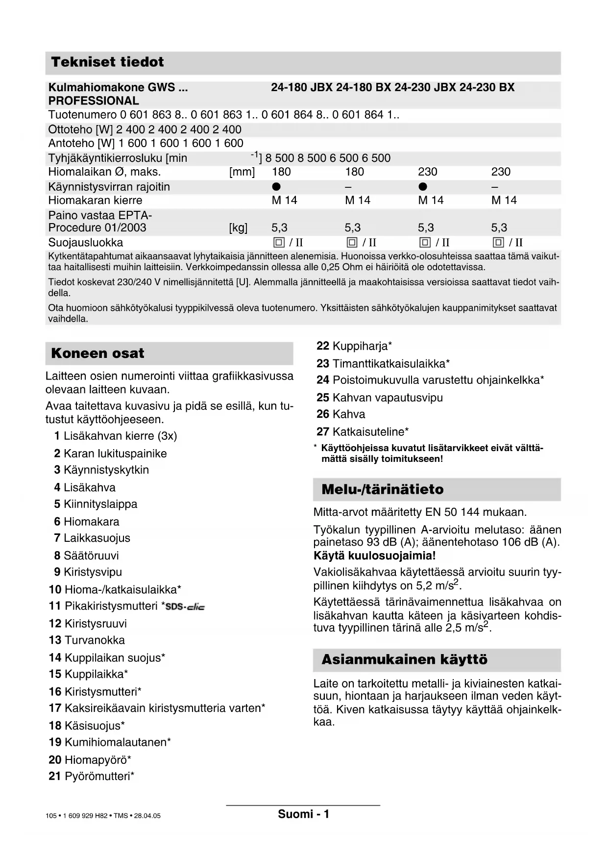 ] 8 500 8 500 6 500 6 500 Hiomalaikan Ø, maks. [mm] 180 180 230 230 Käynnistysvirran rajoitin ● – ● – Hiomakaran kierre M 14 M 14 M 14 M 14 Paino vastaa EPTA- Procedure 01/2003 [kg] 5,3 5,3 5,3 5,3 Suojausluokka / II / II / II / II Kytkentätapahtumat aikaansaavat lyhytaikaisia jännitteen alenemisia. Huonoissa verkko-olosuhteissa saattaa tämä vaikut- taa haitallisesti muihin laitteisiin. Verkkoimpedanssin ollessa alle 0,25 Ohm ei häiriöitä ole odotettavissa. Tiedot koskevat 230/240 V nimellisjännitettä [U]. Alemmalla jännitteellä ja maakohtaisissa versioissa saattavat tiedot vaih- della. Ota huomioon sähkötyökalusi tyyppikilvessä oleva tuotenumero. Yksittäisten sähkötyökalujen kauppanimitykset saattavat vaihdella. Koneen osat Melu-/tärinätieto Asianmukainen käyttö 1 609 929 H82.book Seite 1 Dienstag, 3. Mai 2005 3:11 15 105 • 1 609 929 H82 • TMS • 28.04.05Suomi - 2 Kantavien seinien lovia säätelevät standardi DIN 1053 osa 1 ja kansalliset määräykset. Nämä ohjeet on ehdottomasti noudatettava. En- nen työn aloittamista on neuvoteltava vastaavan staatikon, arkkitehdin tai asianomaisen raken- nusjohdon kanssa. Kaikki ohjeet täytyy lukea. Alla ole- vien ohjeiden noudattamisen laimin- lyönti saattaa johtaa sähköiskuun, tulipaloon ja/tai vakavaan loukkaan- tumiseen. Lisäksi tulee noudattaa liitteenä tai tämän käyttö- ohjeen keskellä olevan vihkon yleisiä turvalli- suusohjeita. SÄILYTÄ NÄMÄ OHJEET HYVIN. Käytä suojalaseja. Käytä kuulonsuojainta. ■ Pidä työn aikana sähkötyökalua kaksin kä- sin ja ota tukeva seisoma-asento. Sähkö- työkalua pystyy ohjaamaan varmemmin kah- della kädellä. ■ Varmista työkappale. Kiinnityslaitteilla tai ruuvipenkissä kiinnitetty työkappale pysyy tu- kevammin paikoillaan, kuin kädessä pidettynä. ■ Noudata suojatoimenpiteitä, jos työssä saattaa syntyä terveydelle vaarallista, pala- vaa tai räjähdysaltista pölyä. Esimerkiksi: Monia pölyjä pidetään karsinogeenisina. Käytä pölyn-/lastunimua ja pölynsuojanaama- ria. ■ Pidä työpaikka puhtaana. Materiaalien se- koitukset ovat erityisen vaarallisia. Kevyt- metallipöly saattaa syttyä palamaan tai räjäh- tää. ■ Älä koskaan työstä asbestipitoista ainetta. Asbestia pidetään karsinogeenisena. ■ Älä koskaan käytä sähkötyökalua, jonka verkkojohto on viallinen. Älä kosketa vauri- oitunutta johtoa ja irrota pistotulppa pisto- rasiasta, jos johto vaurioituu työn aikana. Vahingoittunut johto kasvattaa sähköiskun vaaraa. ■ Liitä laitteet, joita käytetään ulkona, vika- virta-suojakytkimen (FI-) kautta. Yhteiset turvallisuusohjeet hiomista, hiekka- paperihiomista, työskentelyä teräsharjan kanssa, kiillotusta ja katkaisuhiontaa varten: ■ Tätä sähkötyökalua tulee käyttää hiomako- neena, hiekkapaperihiomakoneena, teräs- harja-, kiillotus- ja katkaisuhiomakoneena. Ota huomioon kaikki varo-ohjeet, ohjeet, piirustukset ja tiedot, joita saat sähkötyö- kalun kanssa. Ellet noudata seuraavia oh- jeita, saattaa se johtaa sähköiskuun, tulipa- loon ja/tai vaikeisiin loukkaantumisiin. ■ Älä käytä mitään lisälaitteita, joita ei val- mistaja ole tarkoittanut tai suositellut ni- menomaan tälle sähkötyökalulle. Vain se, että pystyt kiinnittämään lisätarvikkeen sähkö- työkaluusi ei takaa sen turvallista käyttöä. ■ Vaihtotyökalun sallitun kierrosluvun tulee olla vähintään yhtä suuri kuin sähkötyöka- lussa mainittu suurin kierrosluku. Lisätar- vike, joka pyörii sallittua suuremmalla nopeu- della, saattaa tuhoutua. ■ Vaihtotyökalun ulkohalkaisijan ja paksuu- den tulee vastata sähkötyökalun mittatie- toja. Väärin mitoitettuja vaihtotyökaluja ei voida suojata tai hallita riittävästi. ■ Hiomalaikkojen, laippojen, hiomalautasten ja muitten lisätarvikkeiden tulee sopia tar- kasti sähkötyökalusi hiomakaraan. Vaihto- työkalut, jotka eivät sovi tarkkaan sähkötyöka- lun hiomakaraan pyörivät epätasaisesti, täri- sevät voimakkaasti ja saattavat johtaa työkalun hallinnan menettämiseen. ■ Älä käytä vaurioituneita vaihtotyökaluja. Tarkista ennen jokaista käyttöä, ettei vaih- totyökalussa, kuten hiomalaikoissa ole pirstoutumia tai halkemia, hiomalauta- sessa halkeamia tai voimakasta kulumista, teräsharjassa irtonaisia tai katkenneita lan- koja. Jos sähkötyökalu tai vaihtotyökalu putoaa, tulee tarkistaa, että se on kun- nossa tai sitten käyttää ehjää vaihtotyöka- lua. Kun olet tarkistanut ja asentanut vaih- totyökalun, pidä itsesi ja lähistöllä olevat henkilöt poissa pyörivän vaihtotyökalun ta- sosta ja anna sähkötyökalun käydä mi- nuutti täydellä kierrosluvulla. Vaurioituneet vaihtotyökalut menevät yleensä rikki tässä ajassa. Statiikkaohjeita Työturvallisuus 1 609 929 H82.book Seite 2 Dienstag, 3. Mai 2005 3:11 15 106 • 1 609 929 H82 • TMS • 28.04.05Suomi - 3 ■ Käytä henkilökohtaisia suojavarusteita. Käytä käytöstä riippuen kokokasvonaa- miota, silmäsuojusta tai suojalaseja. Jos mahdollista, käytä pölynaamaria, kuulon- suojainta, suojakäsineitä tai erikoissuoja- vaatetta, joka suojaa sinut pieniltä hioma- ja materiaalihiukkasilta. Silmät tulee suojata lenteleviltä vierailta esineiltä, jotka saattavat syntyä eri käytössä. Pöly- tai hengityssuoja- naamareiden täytyy suodattaa pois työstössä syntyvä pöly. Jos olet pitkään alttiina voimak- kaalle melulle, saattaa se vaikuttaa heikentä- västi kuuloon. ■ Varmista, että muut henkilöt pysyvät tur- vallisella etäisyydellä työalueeltasi. Jokai- sella, joka tulee työalueelle, tulee olla hen- kilökohtaiset suojavarusteet. Työkappaleen tai murtuneen vaihtotyökalun osia saattavat sinkoutua kauemmas ja vahingoittaa ihmisiä myös varsinaisen työalueen ulkopuolella. ■ Tartu sähkötyökaluun ainoastaan eriste- tyistä pinnoista, tehdessäsi työtä, jossa saattaisit osua piilossa olevaan sähköjoh- toon tai sahan omaan 
