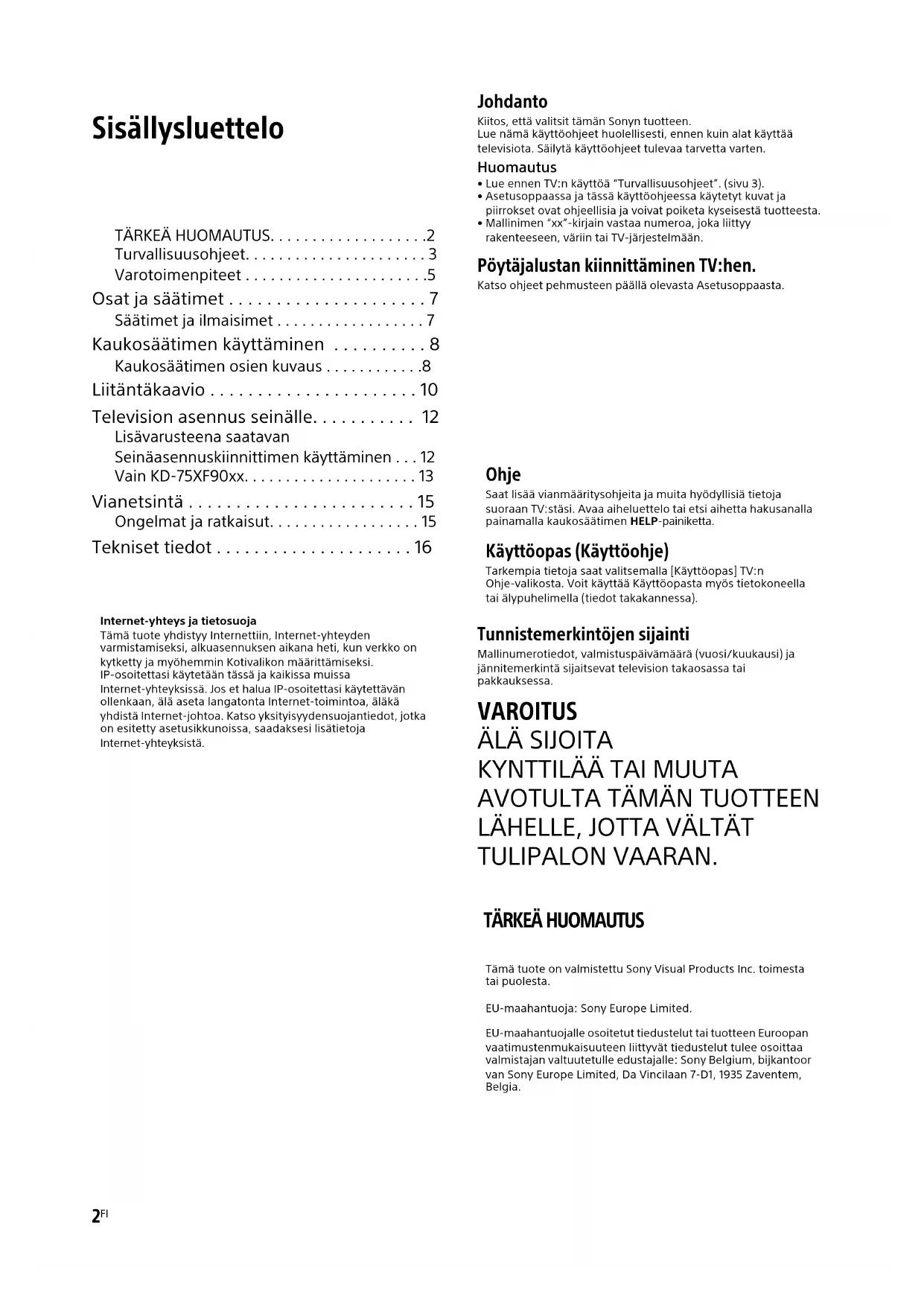 Internet-yhteys ja tietosuojaTämä tuote yhdistyy Internettiin, Internet-yhteyden varmistamiseksi, alkuasennuksen aikana heti, kun verkko on kytketty ja myöhemmin Kotivalikon määrittämiseksi. IP-osoitettasi käytetään tässä ja kaikissa muissa Internet-yhteyksissä. Jos et halua IP-osoitettasi käytettävän ollenkaan, älä aseta langatonta Internet-toimintoa, äläkä yhdistä Internet-johtoa. Katso yksityisyydensuojantiedot, jotka on esitetty asetusikkunoissa, saadaksesi lisätietoja Internet-yhteyksistä. Ohje Saat lisää vianmääritysohjeita ja muita hyödyllisiä tietoja suoraan TV:stäsi. Avaa aiheluettelo tai etsi aihetta hakusanalla painamalla kaukosäätimen HELP-painiketta. Käyttöopas (Käyttöohje) Tarkempia tietoja saat valitsemalla [Käyttöopas] TV:n Ohje-valikosta. Voit käyttää Käyttöopasta myös tietokoneella tai älypuhelimella (tiedot takakannessa).Tämä tuote on valmistettu Sony Visual Products Inc. toimesta tai puolesta.EU-maahantuoja: Sony Europe Limited.EU-maahantuojalle osoitetut tiedustelut tai tuotteen Euroopan vaatimustenmukaisuuteen liittyvät tiedustelut tulee osoittaa valmistajan valtuutetulle edustajalle: Sony Belgium, bijkantoor van Sony Europe Limited, Da Vincilaan 7-D1, 1935 Zaventem, Belgia.C:\Users\CHAILING_2\Desktop\CU\EU-2\10FI\4733119112_10FI.fm master page: Right KD-75XF90xx / 65XF90xx / 55XF90xx / 49XF90xx 4-733-119-11(2)