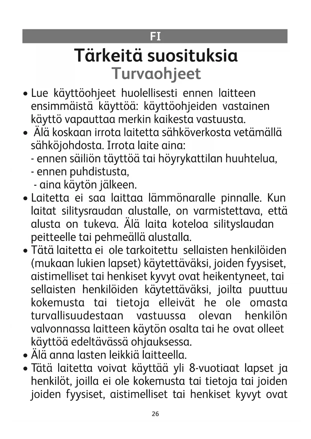- Tätä laitetta ei ole tarkoitettu sellaisten henkilöiden (mukaan lukien lapset) käytettäväksi, joiden fyysiset, aistimelliset tai henkiset kyvyt ovat heikentyneet, tai sellaisten henkilöiden käytettäväksi, joilta puuttuu kokemusta tai tietoja elleivät he ole omasta turvallisuudestaan vastuussa olevan henkilön valvonnassa laitteen käytön osalta tai he ovat olleet käyttöä edeltävässä ohjauksessa.