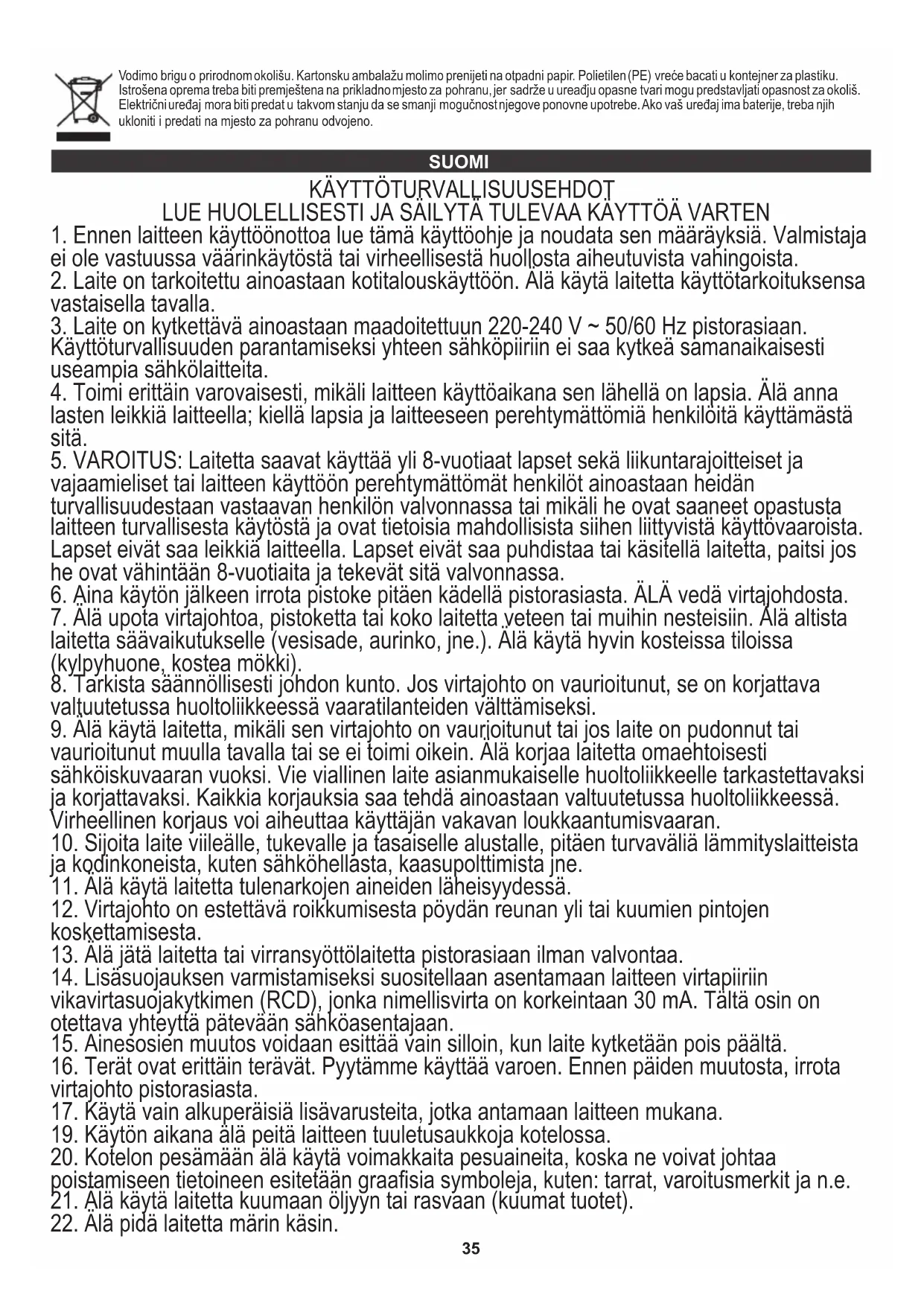 4. Joitakin vihanneksia esim. porkkanat voivat jättää värillinen likaa laitteeseen. Jotta poistaa se käytä liina kostutettu kasviöljyssä. Teho: 200 W Kantakaamme huolta ympäristöstä. Pahvipakkauksen pyydämme laittamaan paperikierrätykseen. Polyeteenipussit (PE) tulee laittaa muovien kierrätysastiaan. Loppuun käytetyt laitteet tulee toimittaa asianmukaiseen keräyspisteeseen, koska laitteen sisältämät vaaralliset aineosat voivat olla ympäristölle vahingollisia. Sähkölaite tulee toimittaa siten, että sen uudelleenkäyttö on estetty. Jos laitteessa on paristo, paristo tulee poistaa ja toimittaa erillisesti keräyspisteeseen. SVENSKA 3.Apparaten bör anslutas till ett eluttag med jordledning 220-240 V ~ 50/60 Hz. För att förbättra användningens säkerhet, bör man inte ansluta samtidigt många elektriska anordningar till en strömkrets.