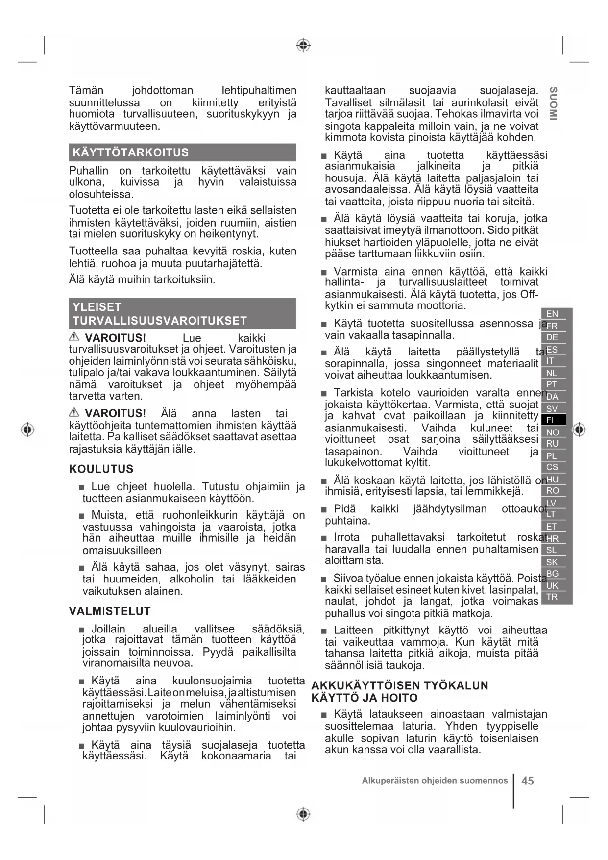 ■ Käytä lataukseen ainoastaan valmistajan suosittelemaa laturia. Yhden tyyppiselle akulle sopivan laturin käyttö toisenlaisen akun kanssa voi olla vaarallista.46 Alkuperäisten ohjeiden suomennos ■ Käytä sähkötyökalua ainoastaan sitä varten suunniteltujen akkujen kanssa. Muiden akkujen käyttö voi johtaa loukkaantumiseen ja tulipaloon. ■ Kun akkua ei käytetä, pidä se erillään metalliesineistä, kuten paperiliittimistä, kolikoista, avaimista, nauloista, ruuveista ja muista pienistä metalliesineistä, jotka voivat yhdistää akun navat. Akun napojen oikosulkeminen voi aiheuttaa palovammoja ja tulipalon. ■ Jos akkua käsitellään väärin, siitä voi vuotaa nestettä; älä kosketa sitä. Jos kosketat sitä vahingossa, huuhtele se vedellä. Jos nestettä pääsee silmiin, hakeudu välittömästi lääkärin hoitoon. Akusta vuotanut neste voi ärsyttää ihoa ja aiheuttaa palovammoja. ■ Vaurioitunutta tai muunneltua akkua tai työkalua ei saa käyttää. Vaurioituneet tai muunnellut akut voivat käyttäytyä odottamattomasti, ja ne voivat johtaa tulipaloon, räjähdykseen, vaaraan tai tapaturmaan. ■ Älä altista akkua tai työkalua tulelle tai liian korkealle lämpötilalle. Tulelle tai yli 130°C:n lämpötilalle altistuminen voi johtaa räjähdykseen. ■ Noudata kaikkia latausohjeita äläkä lataa akkua tai työkalua muissa kuin ohjeissa määritellyissä lämpötilaolosuhteissa. Virheellinen lataus tai määritellyistä poikkeavat lämpötilat saattavat johtaa akun vaurioitumiseen ja lisätä tulipalon vaaraa. KÄYTTÖ ■ Käytä laitetta ainoastaan säädylliseen aikaan – ei aikaisin aamulla tai myöhään yöllä, jolloin se voi häiritä muita. ■ Älä koskaan käytä tuotetta räjähdysalttiissa ympäristössä. ■ Älä käytä tuotetta huonolla säällä, erityisesti kun on salamien vaara. ■ Pidä sivulliset, lapset ja lemmikit 15 metrin etäisyydellä työalueesta. Sammuta tuote, jos alueelle tulee joku. ■ Älä käytä laitetta huonosti valaistuissa olosuhteissa. Käyttäjällä on oltava esteetön näkyvyys työalueelle, jotta hän näkee mahdolliset vaaratekijät. ■ Samankaltaisten laitteiden käyttö lähettyvillä kasvattaa kuulovaurion riskiä sekä vaaraa, että joku muu tulee työalueellesi. ■ Seiso rinteissä aina tukevasti. Kävele, älä koskaan juokse. ■ Pidä vakaa tasapaino. Älä kurkota liian pitkälle. Liian pitkälle kurkotta minen saattaa johtaa tasapainon menettämiseen. ■ Älä koskaan käytä laitetta, jos suojat tai suojukset ovat epäkunnossa tai ilman suojalaitteita. ■ Liikkuvien osien kanssa kosketuksiin joutumiseen liittyvän tapaturmavaaran välttämiseksi laite on aina sammutettava ja akkupakkaus poistettava. Varmista, että kaikki liikkuvat osat ovat pysähtyneet täysin: ● ennen laitteen luota poistumista ● ennen tukosten selvittämistä ● ennen tuotteen tarkastusta, puhdistusta ja huoltoa ● ennen laitteen tarkastusta vierasesineen ilmaantumisen jälkeen ● Jos tuote alkaa täristä epänormaalisti (tarkista välittömästi). ■ Katkaise laitteesta virta välittömästi onnettomuuden tai toimintahäiriön sattuessa. Älä käytä laitetta ennen kuin se on perusteellisesti tutkittu valtuutetussa huoltoliikkeessä. ■ Älä muunna laitetta millään tavoin tai käytä osia tai lisävarusteita, jotka eivät ole valmistajan suosittelemia. ■ Jos tuote putoaa, saa kovan iskun tai alkaa täristä normaalia enemmän, sammuta se heti ja tarkista se vaurioiden varalta tai paikanna tärinän syy. Vaurioituneet osat on korjattava tai vaihdettava valtuutetussa huoltoliikkeessä. VAROITUS! Laitteen mukana voidaan toimittaa valjaat. Säädä valjaat huolella siten, että ne auttavat mukavasti tukemaan tuotteen painon. Paikanna pikavapautusmekanismi ja harjoittele sen käyttöä ennen kuin alat käyttää laitetta. Sen asianmukainen käyttö voi hätätilanteessa estää vakavan loukkaantumisen. Älä koskaan pidä valjaiden päällä vaatteita äläkä rajoita muilla tavoin pääsyä pikavapautusmekanismiin. PUHALTIMEN TURVALLISUUSVAROITUKSET ■ Käytä pölyisissä paikoissa hengityssuodatinta, jotta pölyn hengittämisestä aiheutuvat riskit pienenisivät.SUOMI