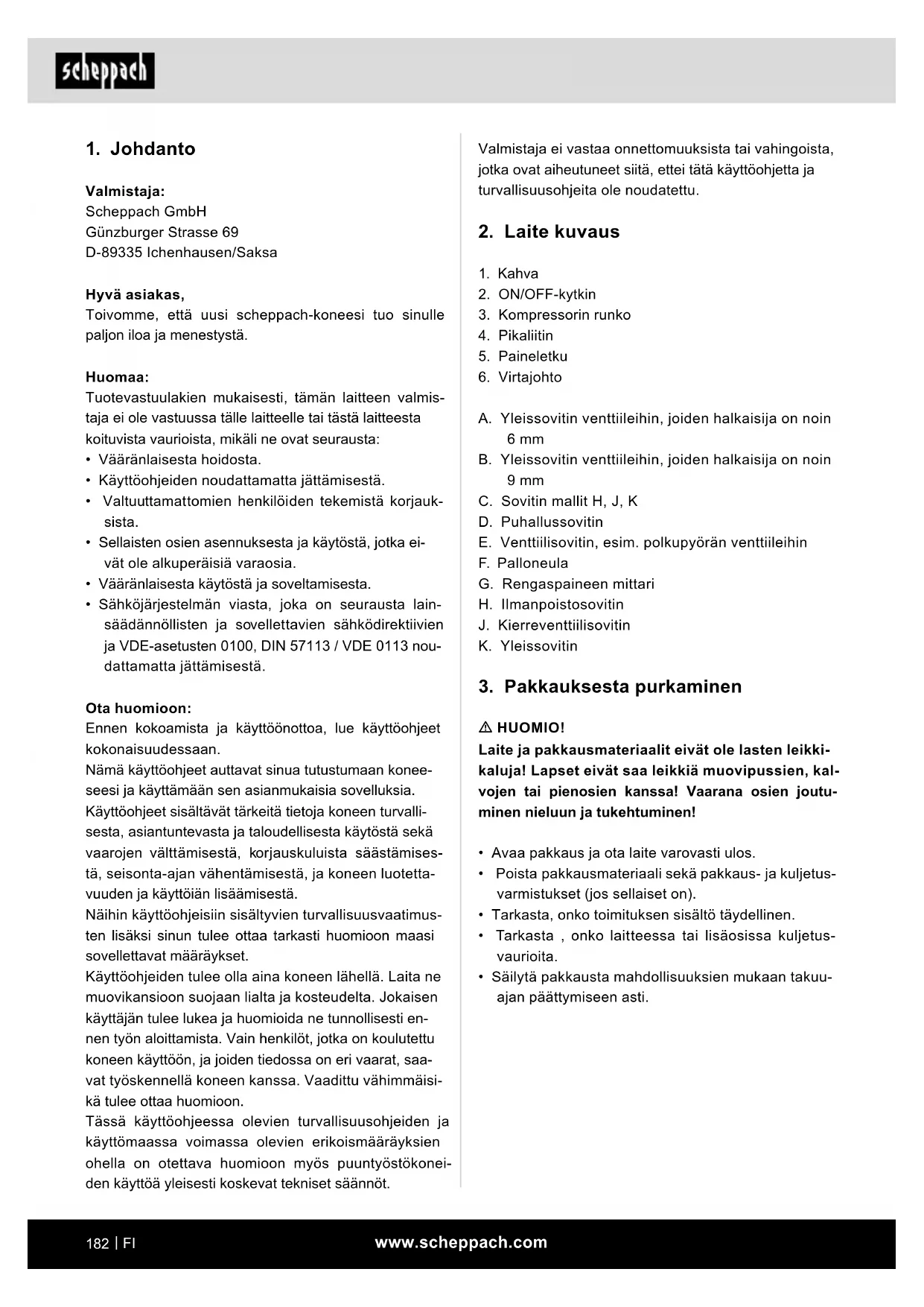Valmistaja: Scheppach GmbH Günzburger Strasse 69 D-89335 Ichenhausen/Saksa Hyvä asiakas, Toivomme, että uusi scheppach-koneesi tuo sinulle paljon iloa ja menestystä. Huomaa: Tuotevastuulakien mukaisesti, tämän laitteen valmis- taja ei ole vastuussa tälle laitteelle tai tästä laitteesta koituvista vaurioista, mikäli ne ovat seurausta:
